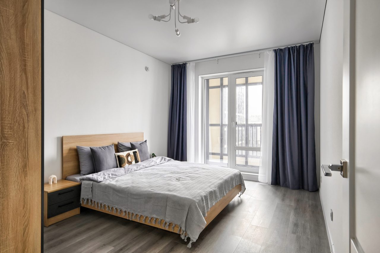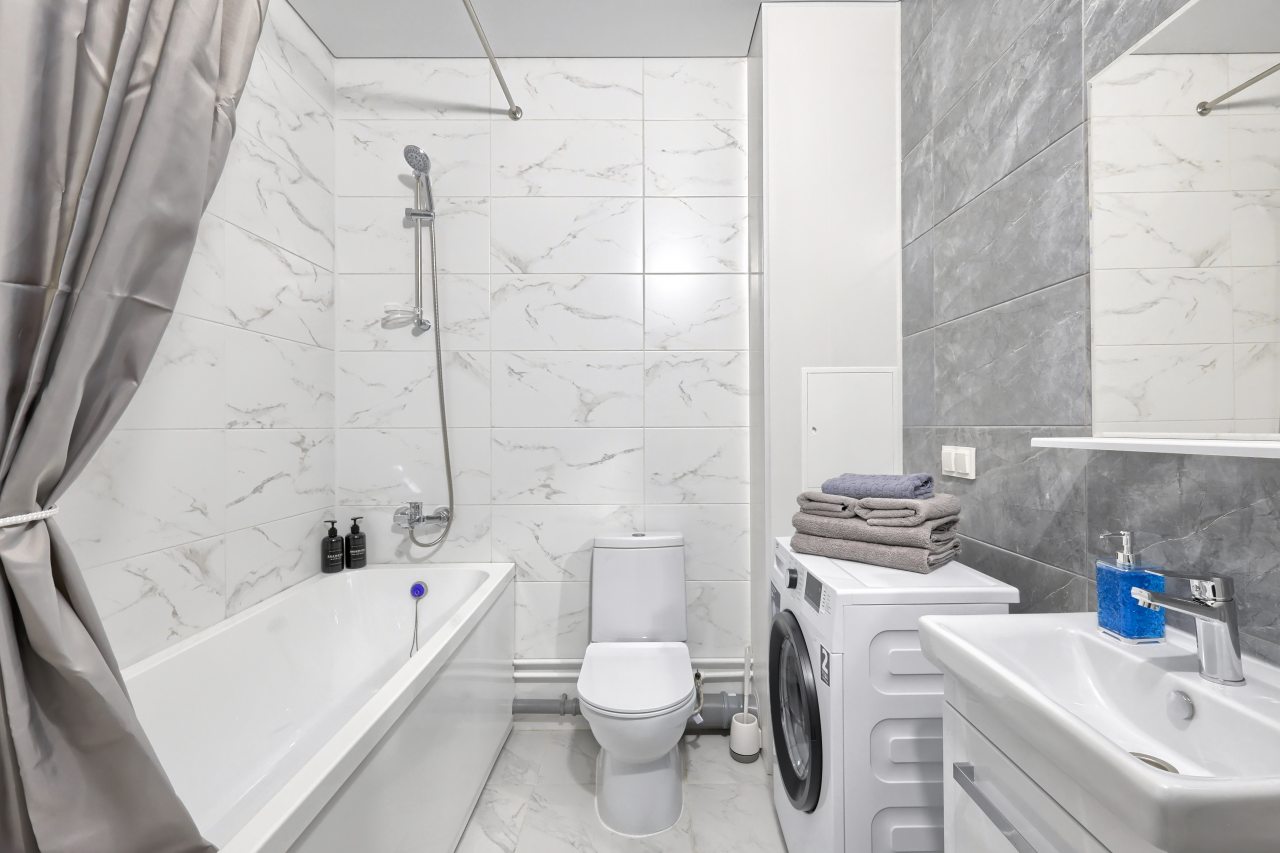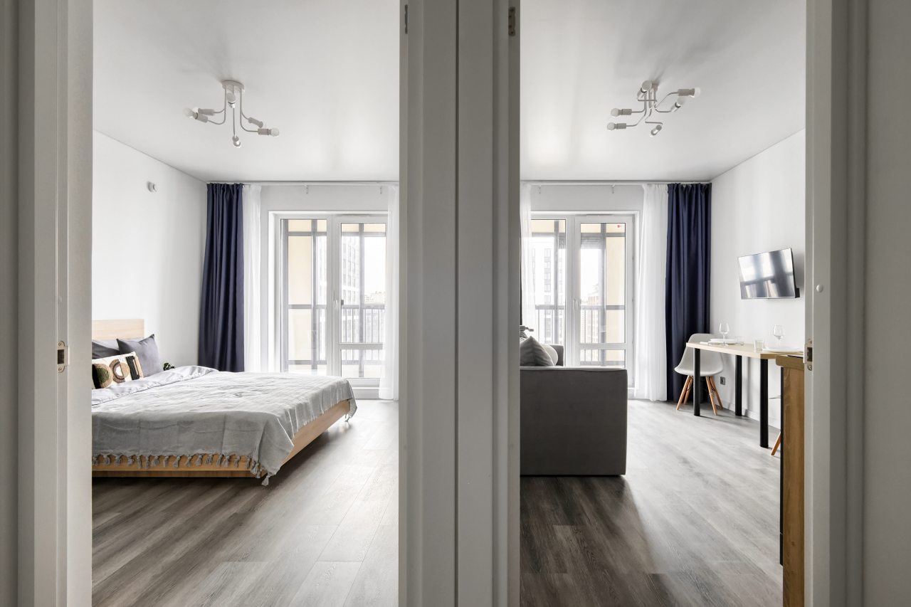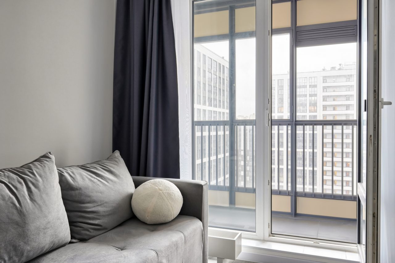 Внутри все предусмотрено для комфортного проживания, включая удобную двуспальную кровать, затемненные шторы, мягкий диван с телевизором, просторную лоджию, ванную комнату с набором полотенец, средствами для личной гигиены и стиральной машиной.