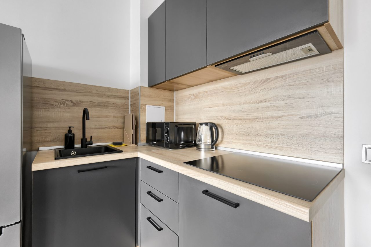 Зона кухни укомплектована чайником, СВЧ, варочной панелью с вытяжкой, холодильником, обеденной зоной, чтобы вы могли в любое время приготовить любимые домашние блюда и напитки.