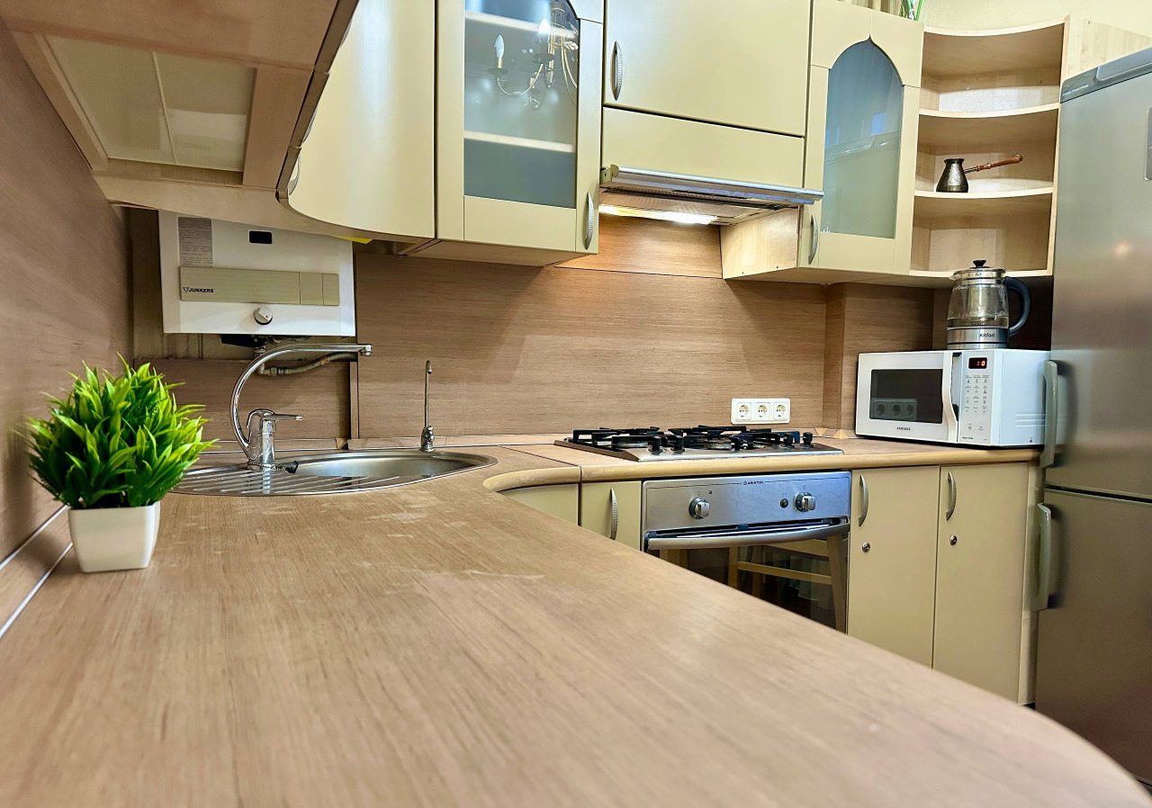 Кухня позволит вам готовить любимые блюда и напитки, так как в наличии духовой шкаф, плита, чайник, СВЧ, холодильник, обеденная зона.