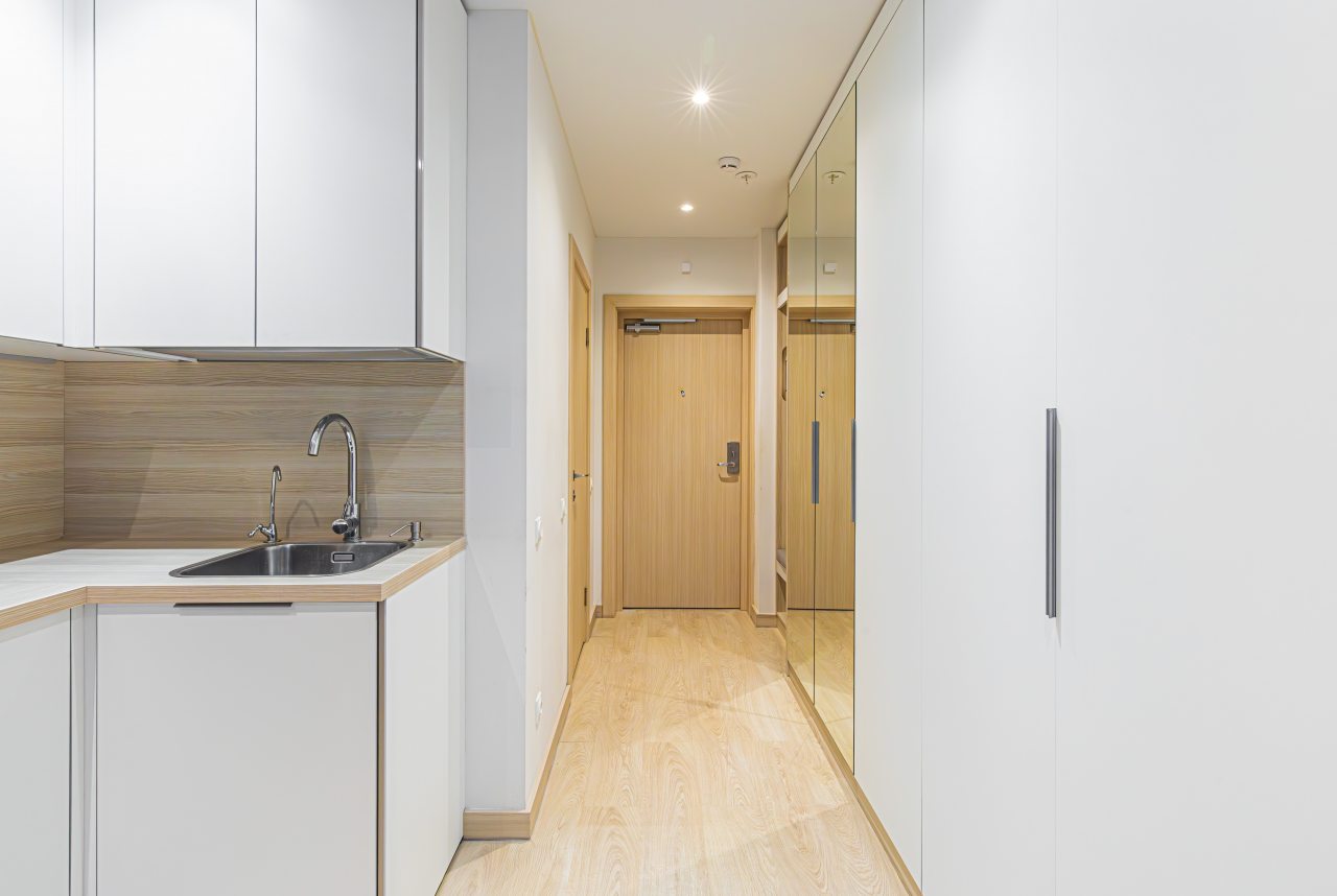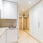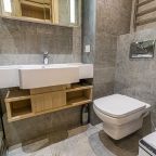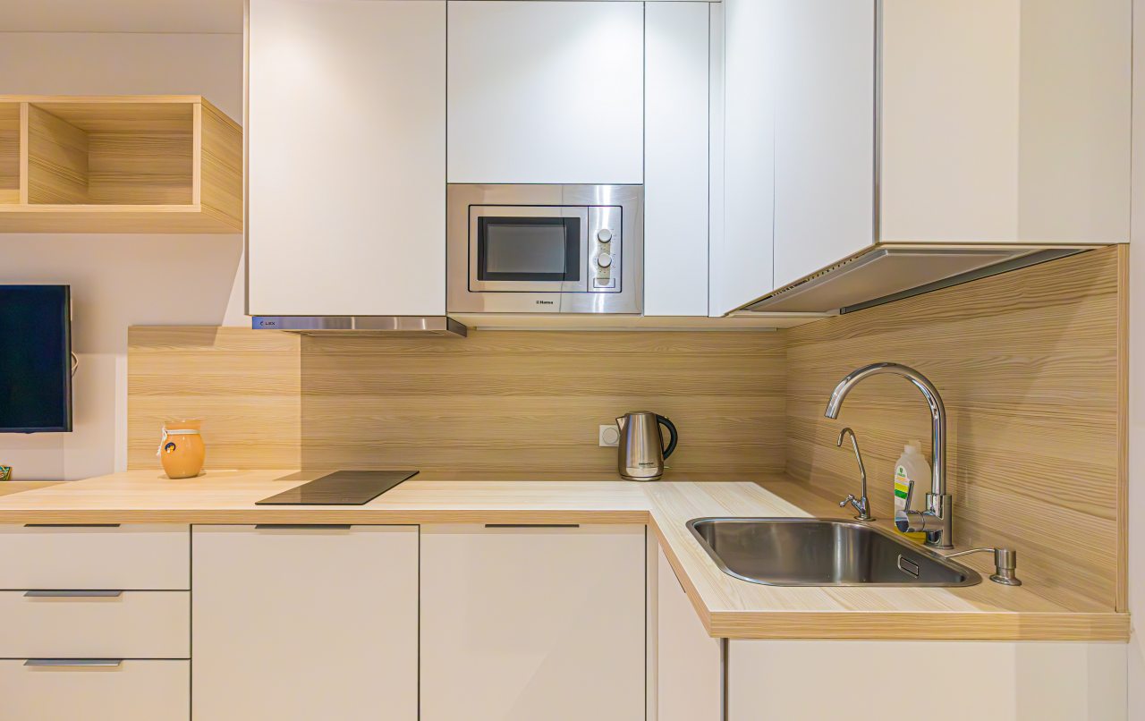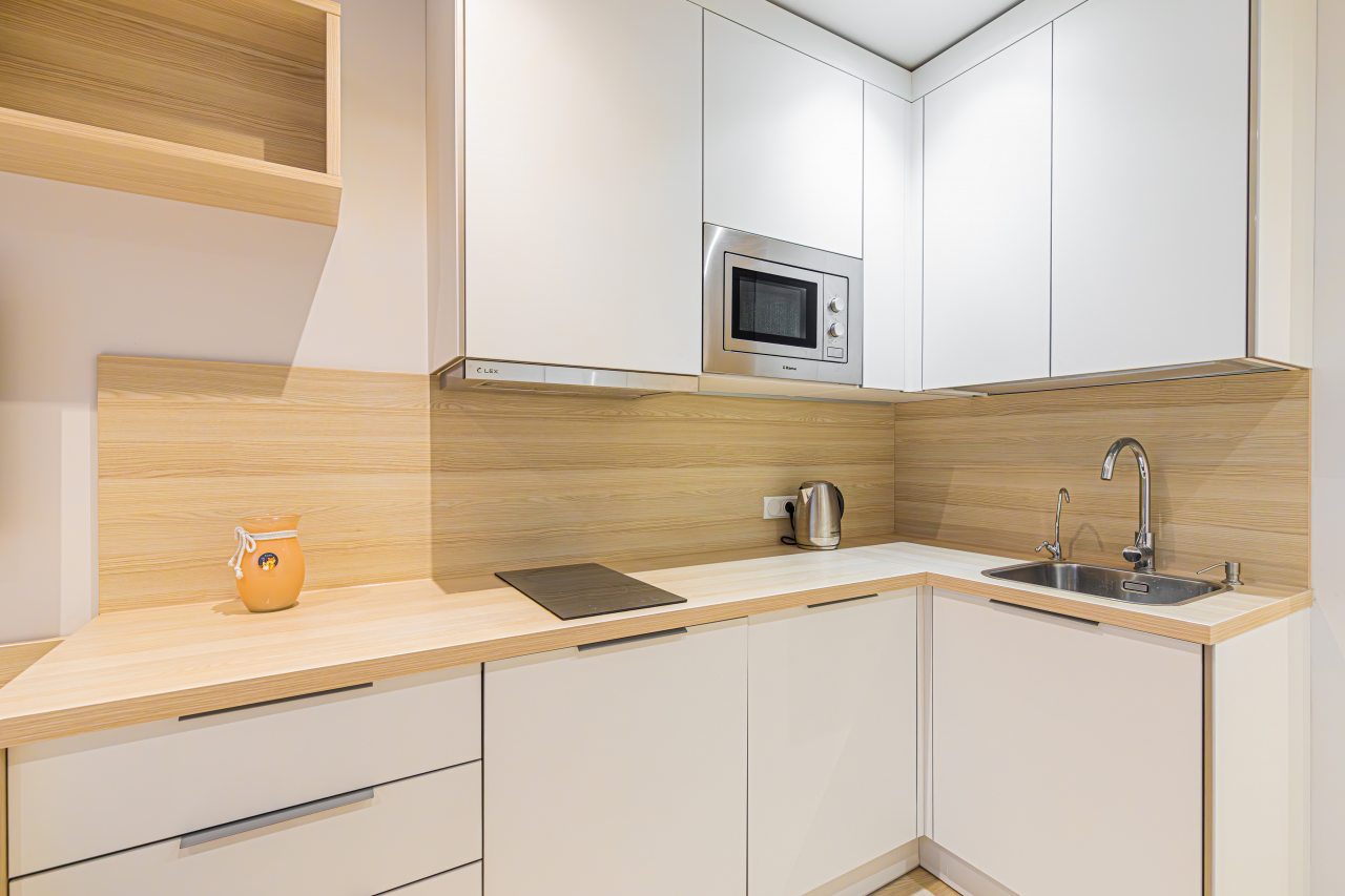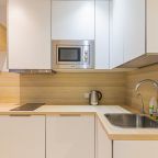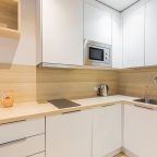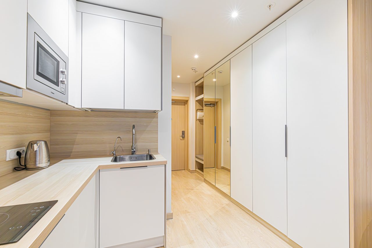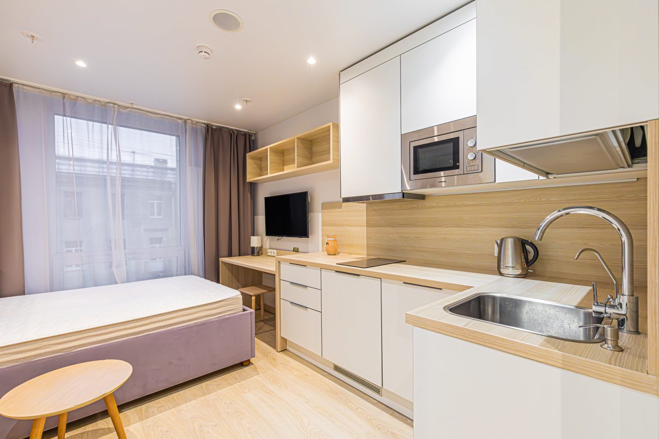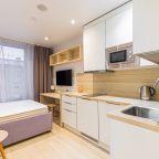 Кухня оборудована стильным гарнитуром, микроволновой печью, электрочайником, варочной панелью, вытяжкой. Пообедать можно в одном из ближайших кафе.
