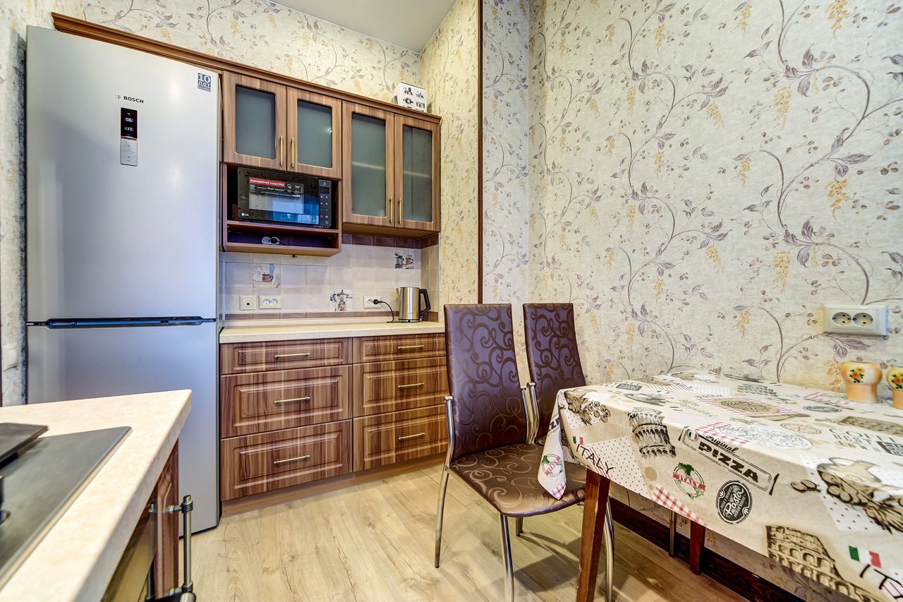 Кухонная зона укомплектована гарнитуром, обеденным столом, бытовой техникой. В шаговой доступности большой выбор кафе и других заведений на любой вкус.