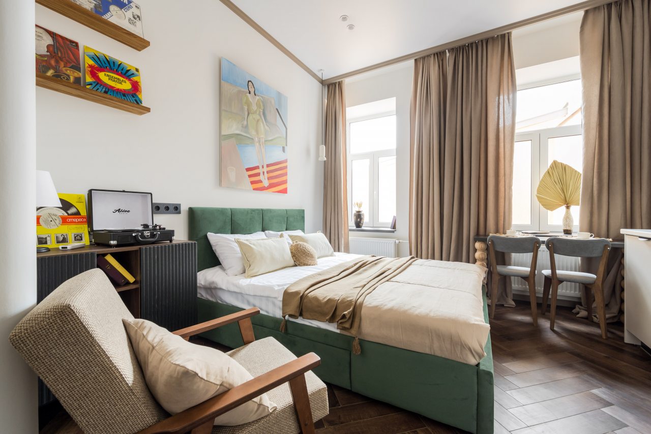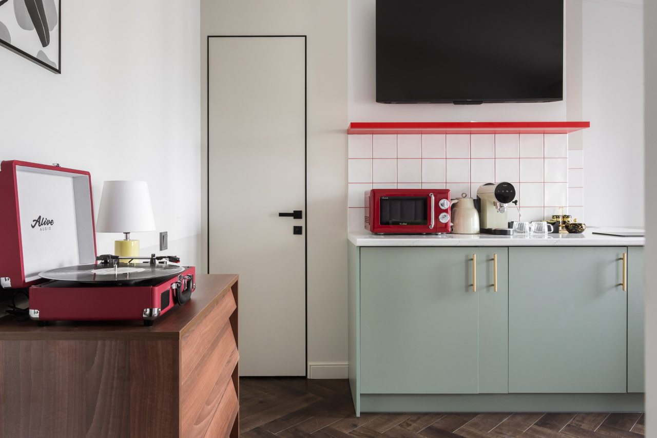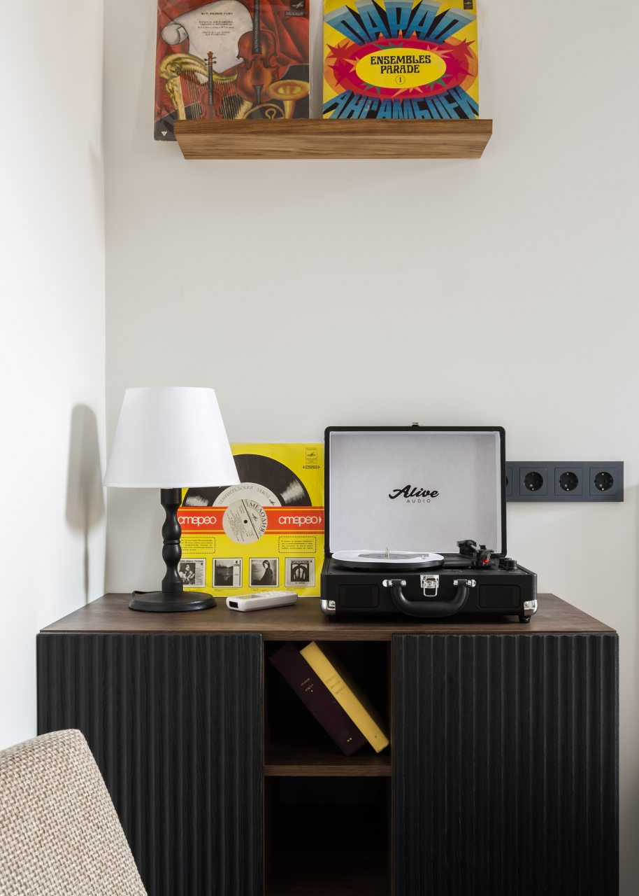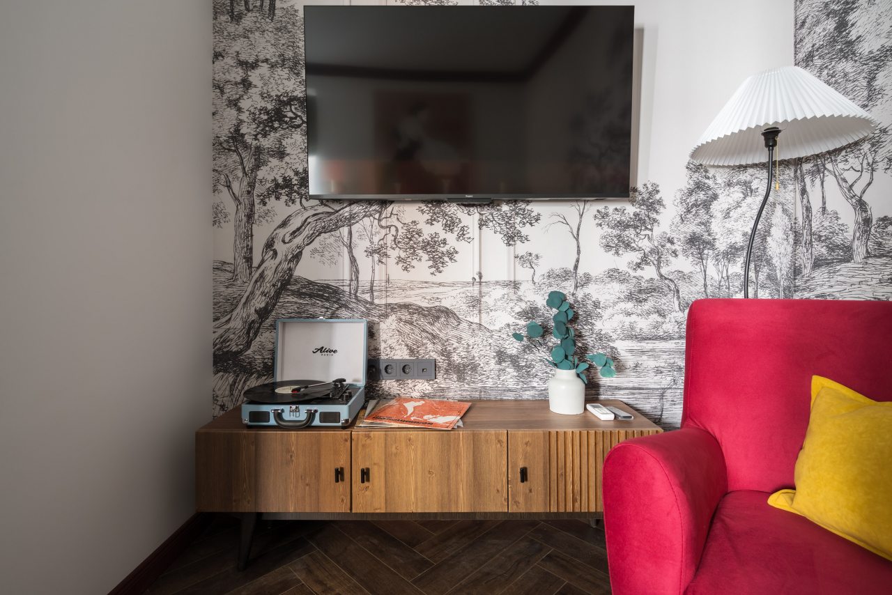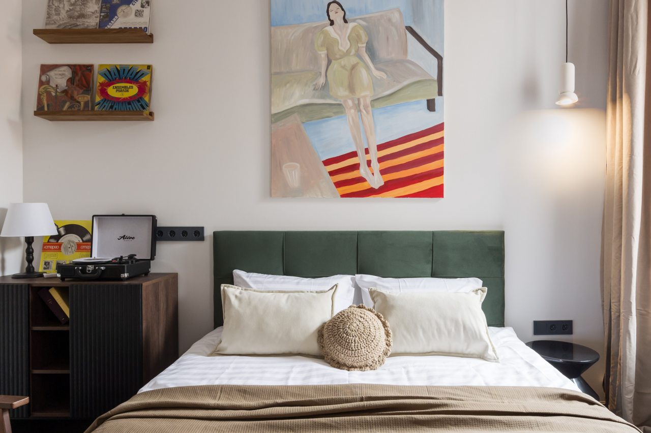 Изюминка апартаментов — это красочный, уникальный дизайн и виниловые проигрыватели с пластинками в каждом номере. Также внутри вы обнаружите комфортные кровати, ЖК-телевизор, комоды и тумбы для хранения вещей, настенные бра для уютного вечернего света, а также собственный санузел со стиральной машиной, туалетно-косметическими средствами для личной гигиены и полотенцами.