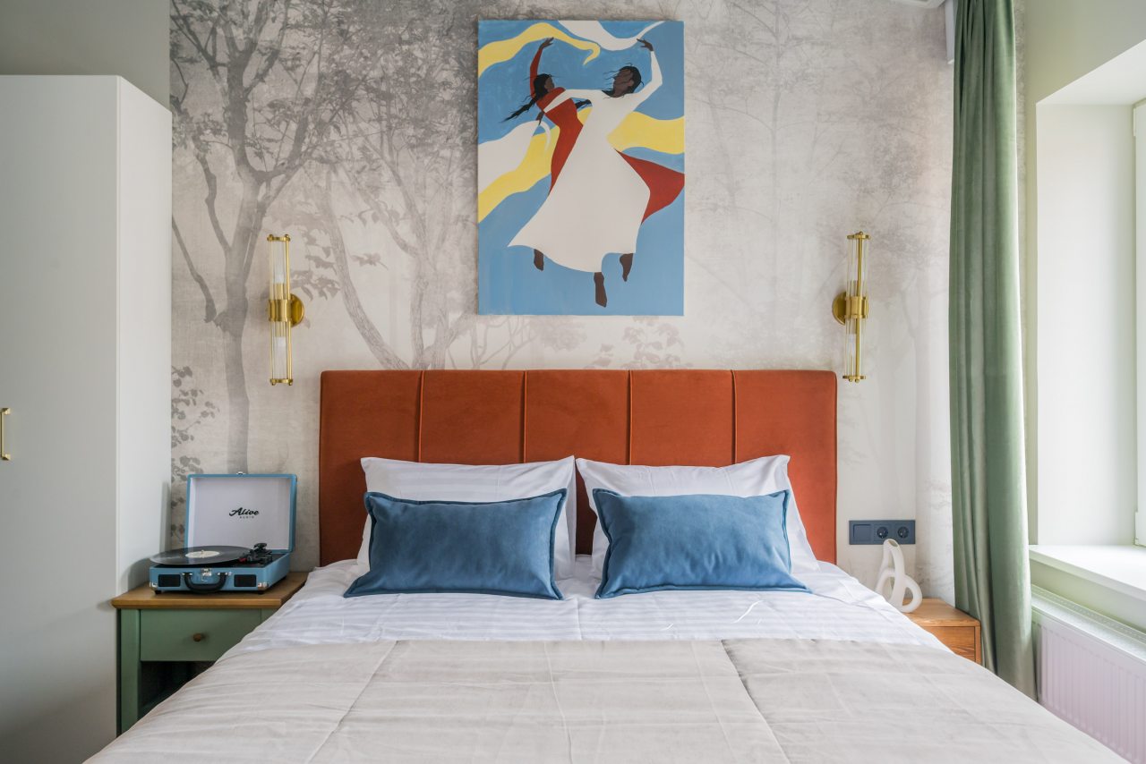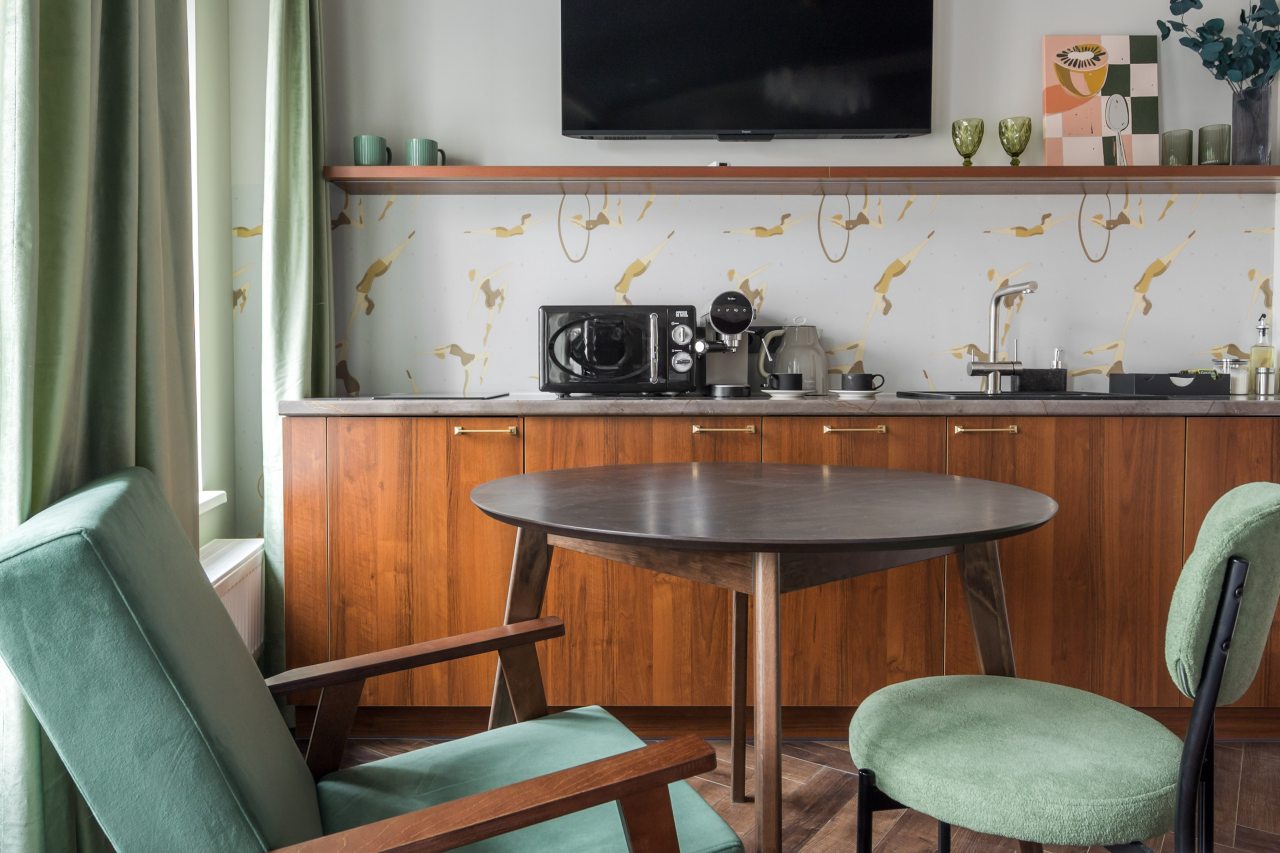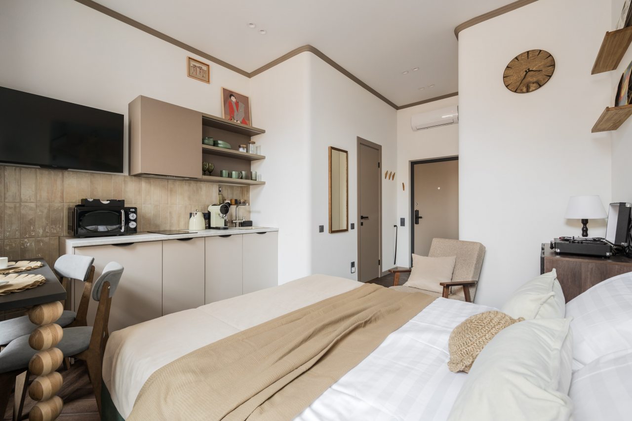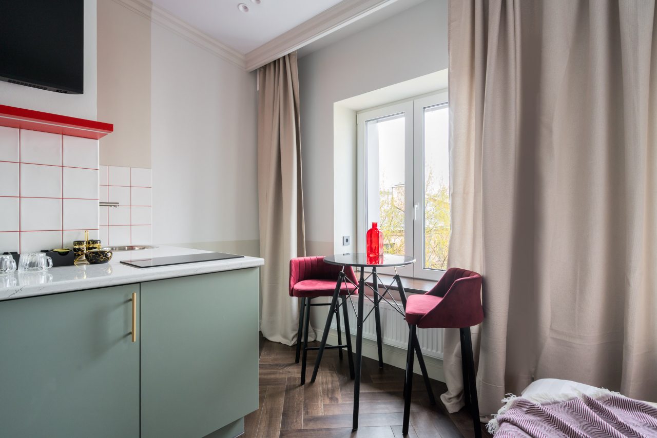 Изюминка апартаментов — это красочный, уникальный дизайн и виниловые проигрыватели с пластинками в каждом номере. Также внутри вы обнаружите комфортные кровати, ЖК-телевизор, комоды и тумбы для хранения вещей, настенные бра для уютного вечернего света, а также собственный санузел со стиральной машиной, туалетно-косметическими средствами для личной гигиены и полотенцами.