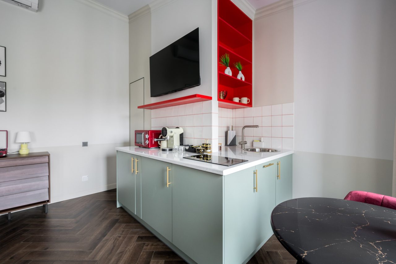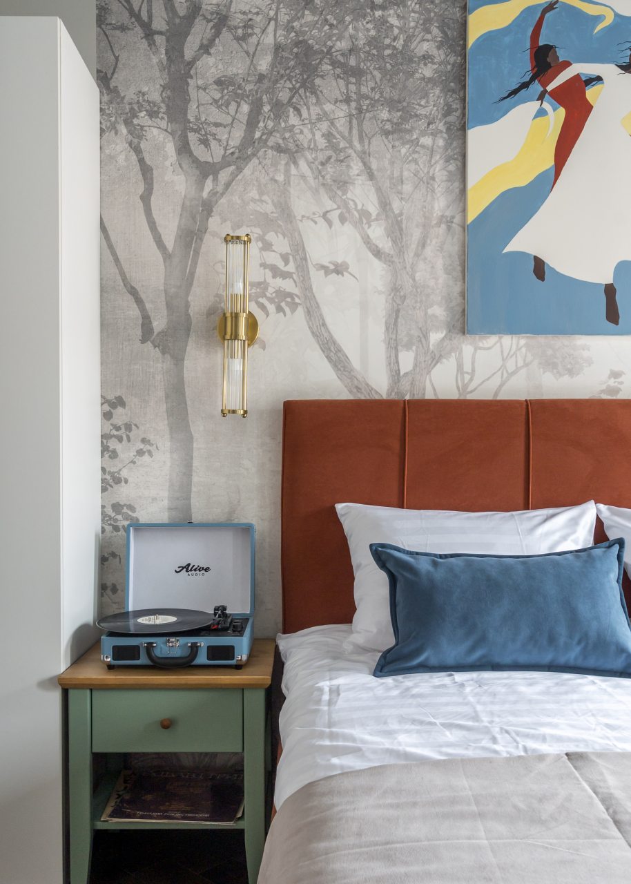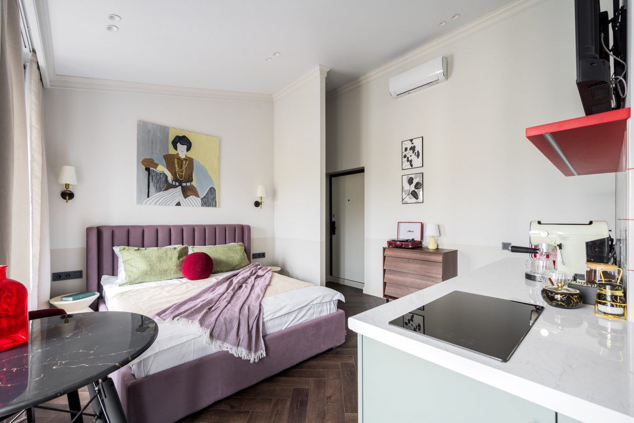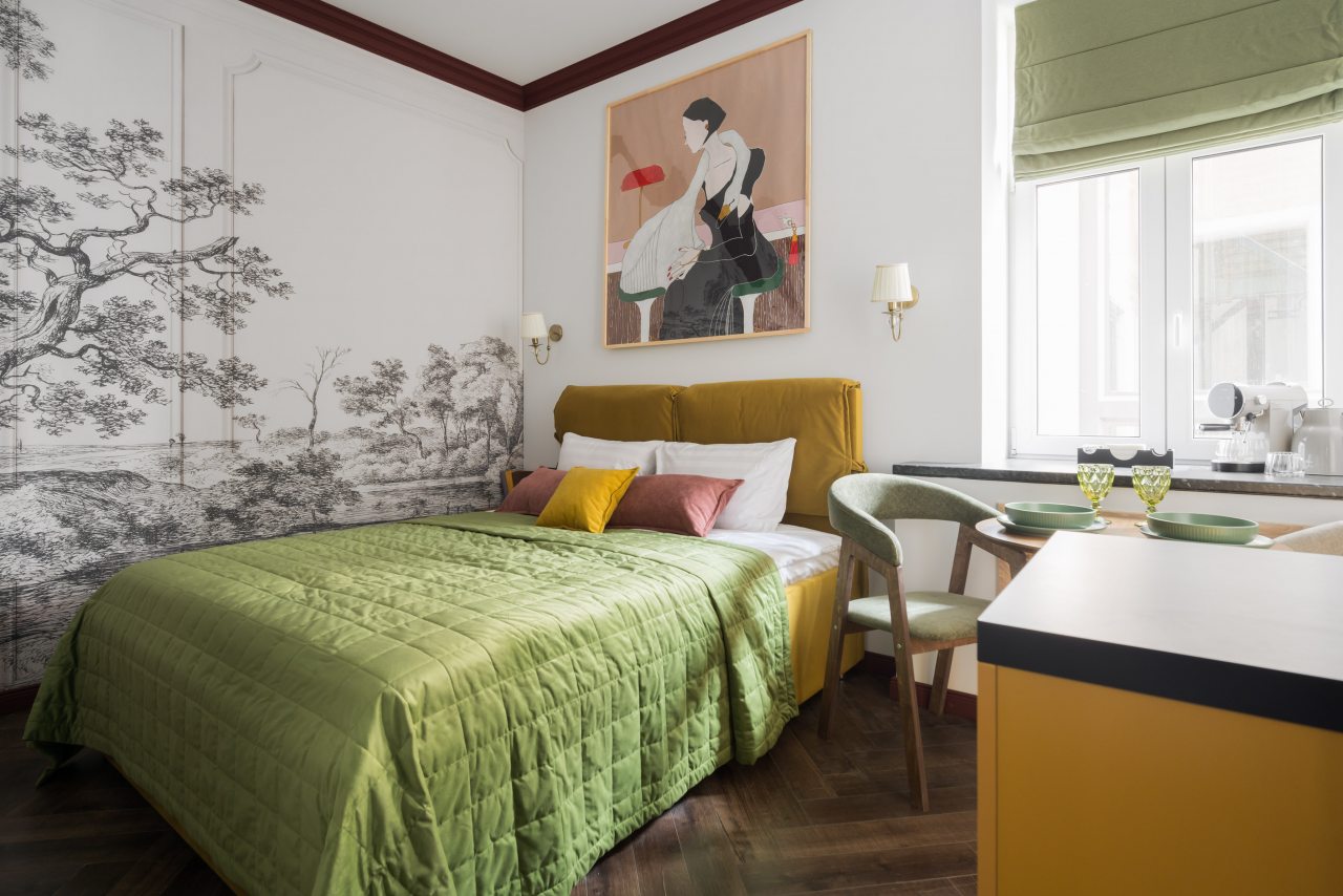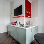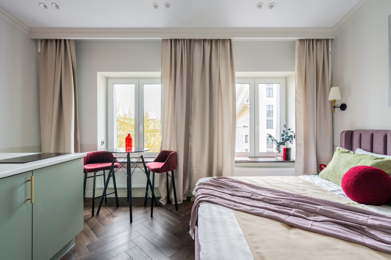 Изюминка апартаментов — это красочный, уникальный дизайн и виниловые проигрыватели с пластинками в каждом номере. Также внутри вы обнаружите комфортные кровати, ЖК-телевизор, комоды и тумбы для хранения вещей, настенные бра для уютного вечернего света, а также собственный санузел со стиральной машиной, туалетно-косметическими средствами для личной гигиены и полотенцами.