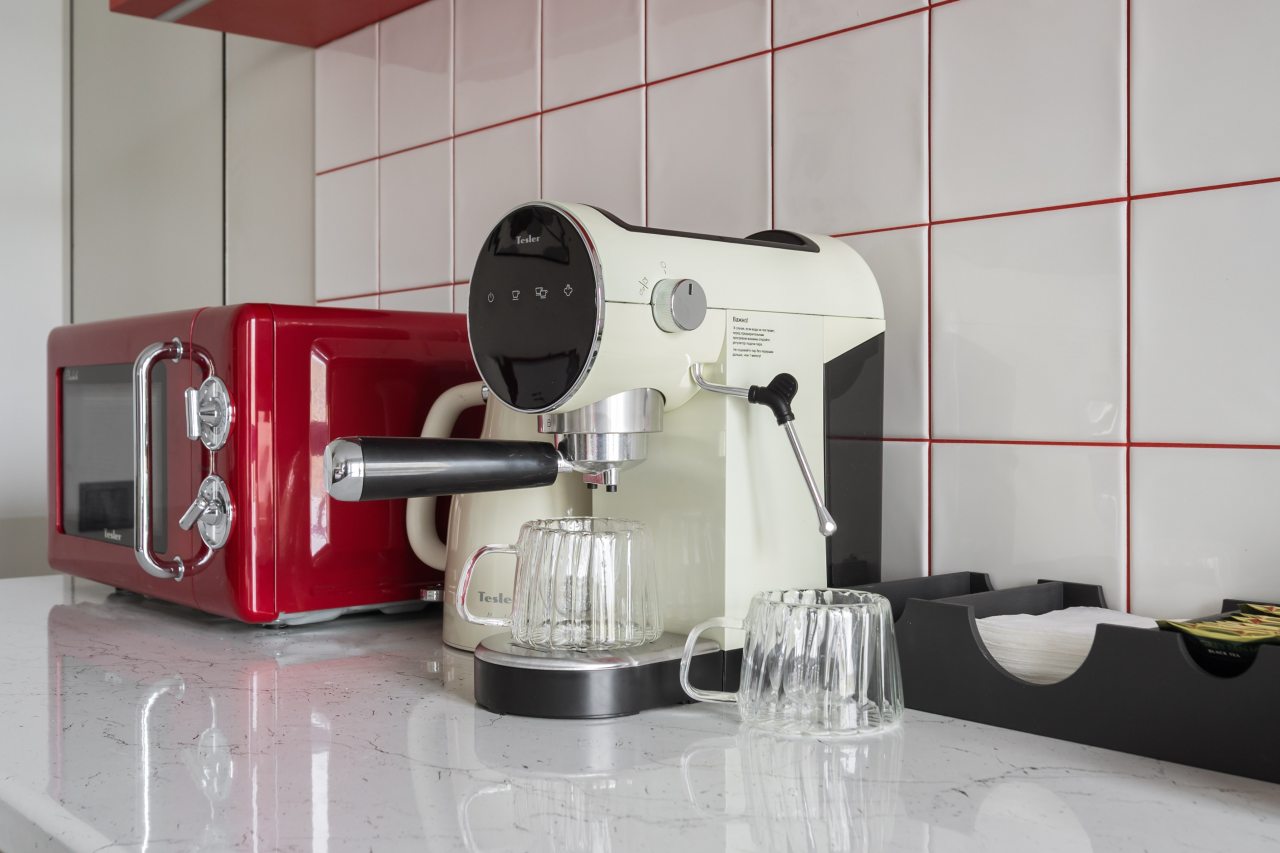 Кухня порадует вас наличием посудомоечной машины, варочной панели, микроволновой печи и вытяжки. Для ценителей вкусного чая и кофе предусмотрены чайник и кофемашина.