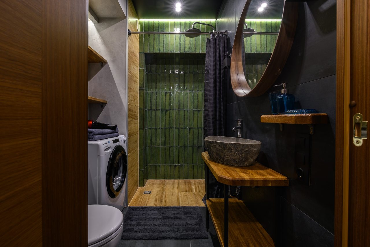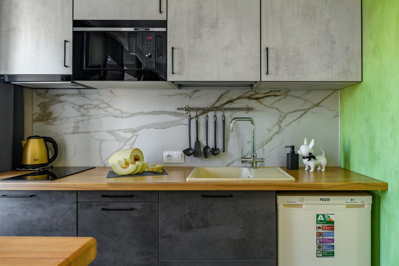 Удобная бытовая техника. В номере есть всё необходимое для комфортного проживания: холодильник, чайник, фен, микроволновка, посудомойка и стиралка