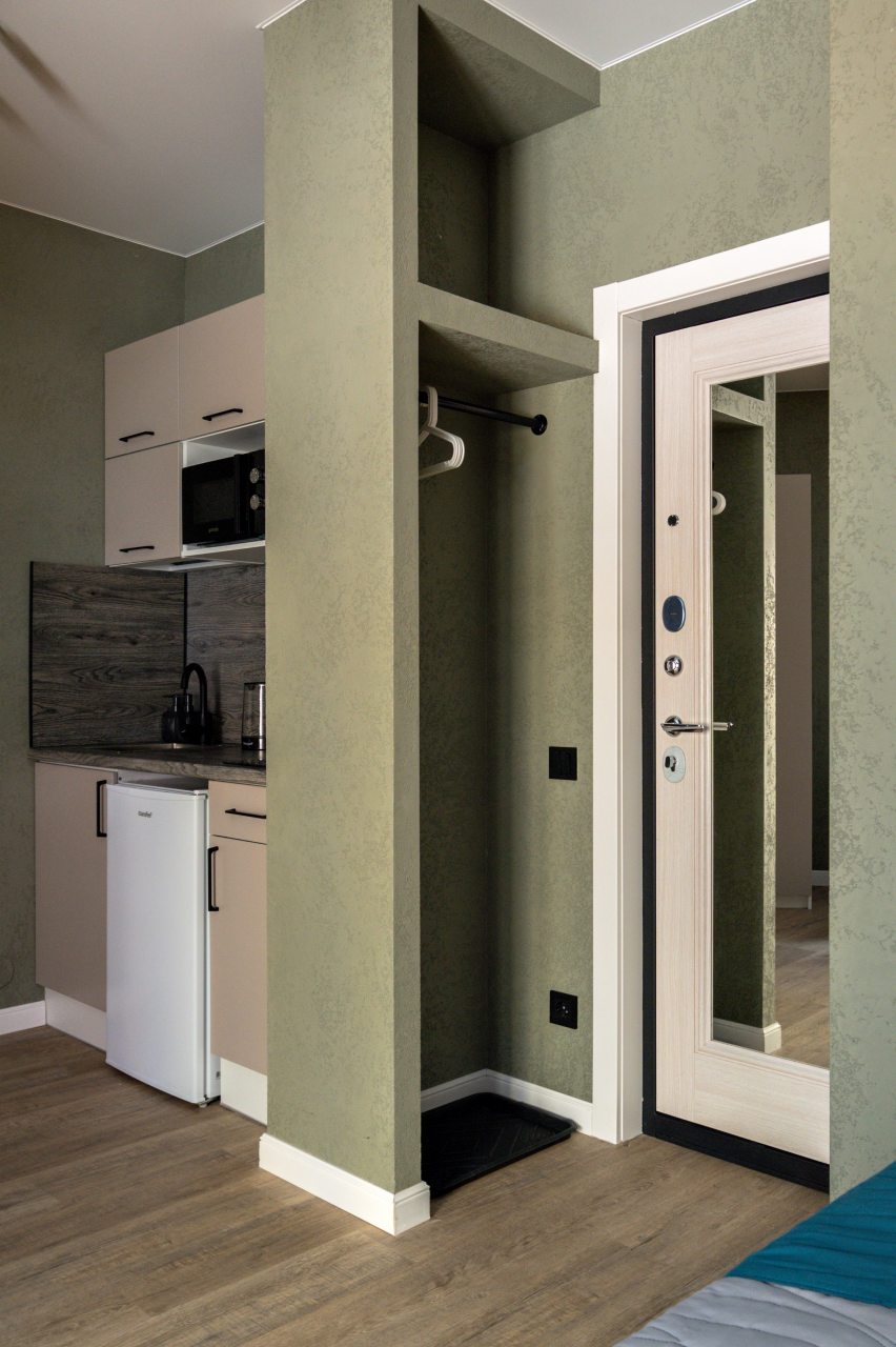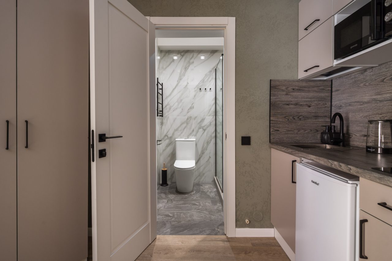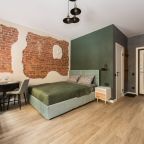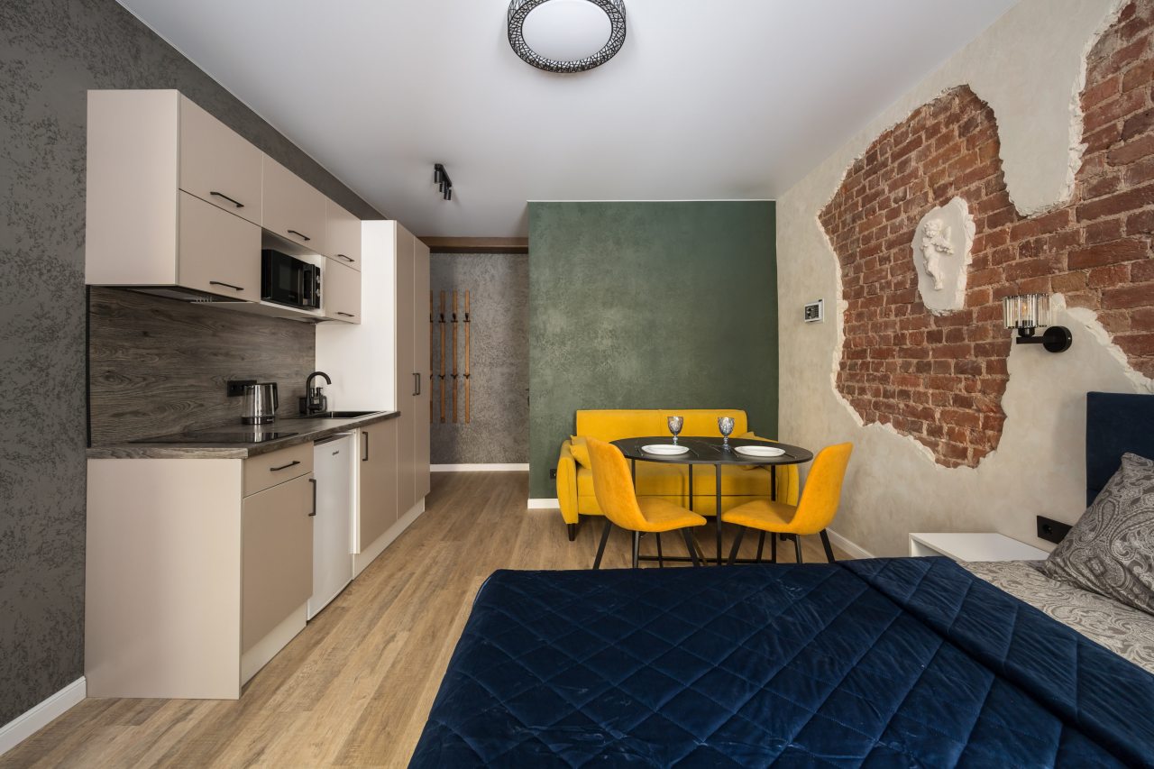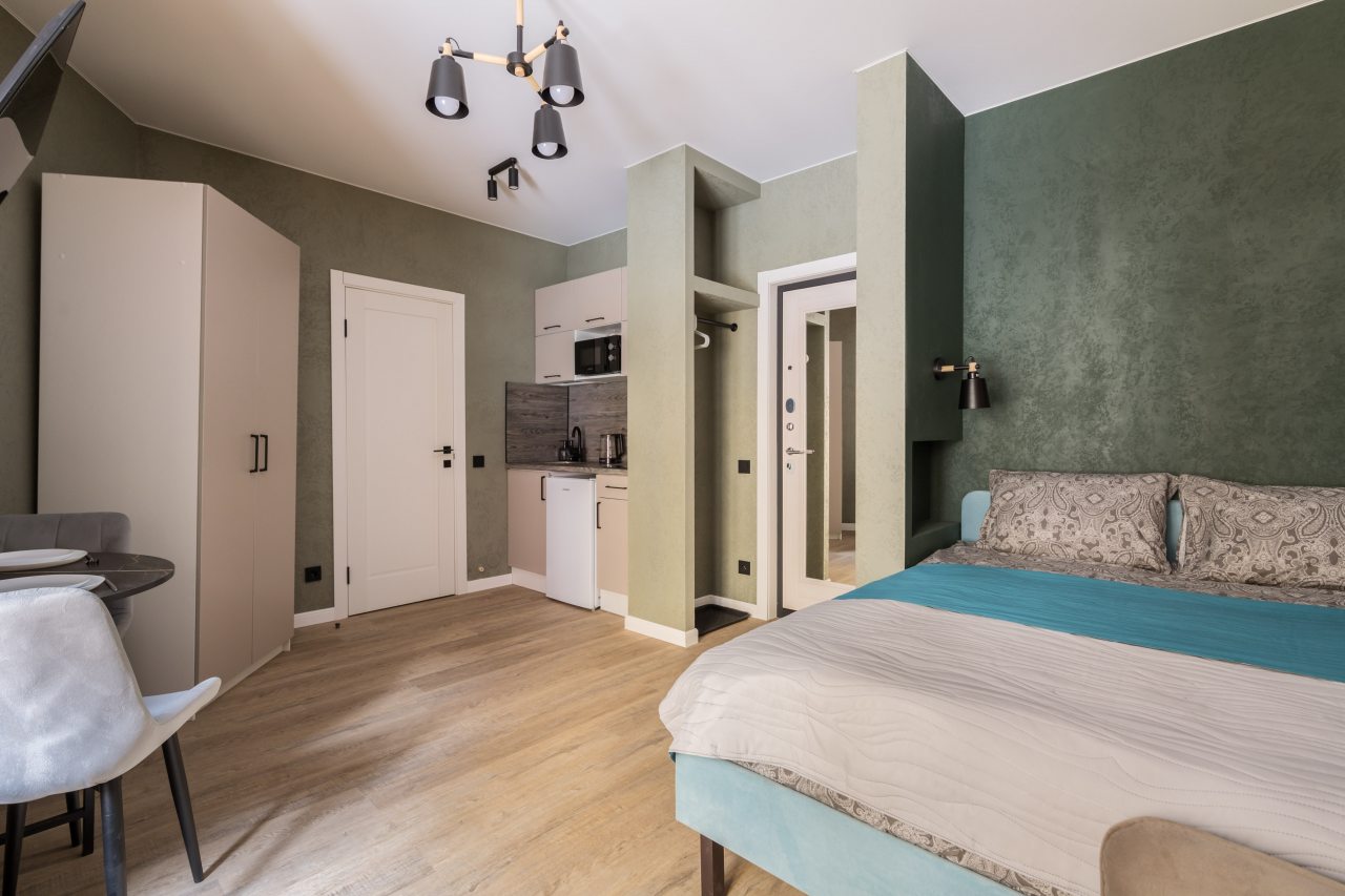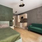 К размещению предлагаются уютные студии с современным ремонтом, которые оборудованы удобными кроватями с чистым комплектом постельного белья, сейфом, диваном, шкафом, телевизором, wi-fi, кухонной зоной и собственной ванной комнатой. Санузел оснащен качественной сантехникой.