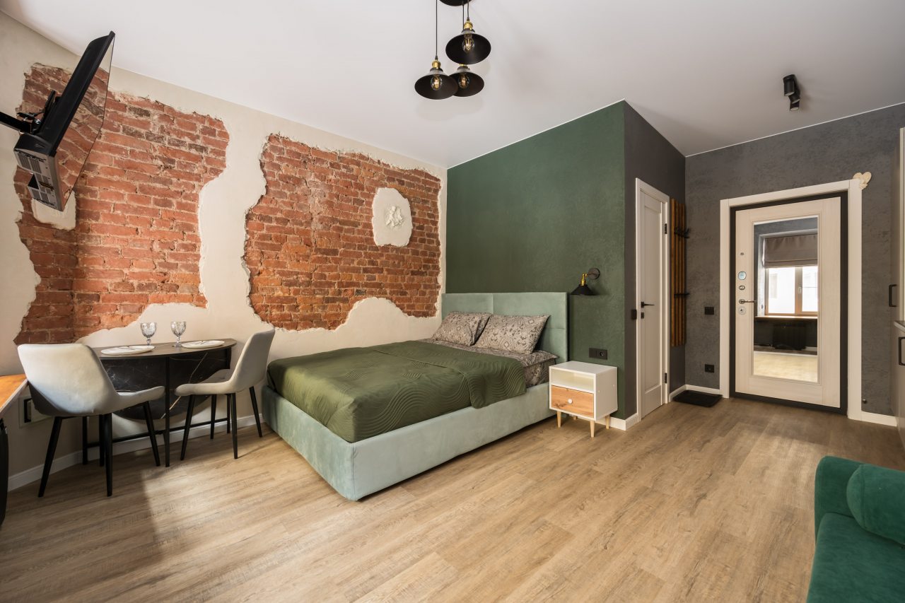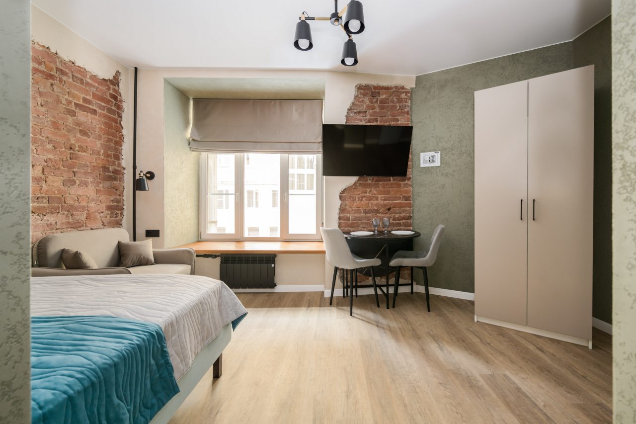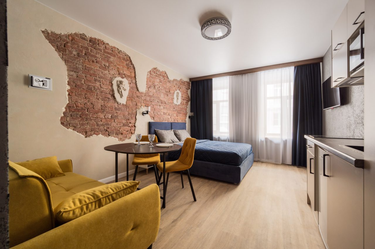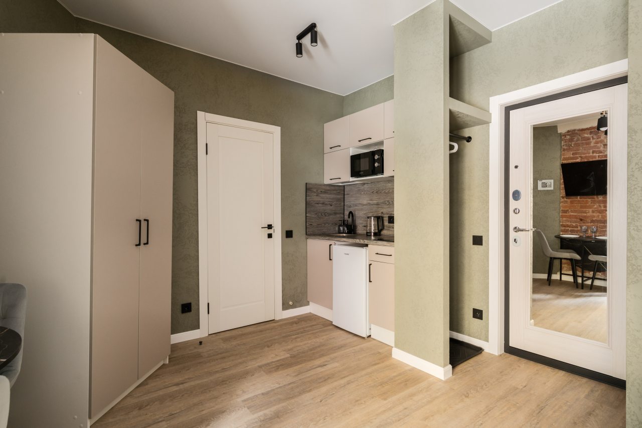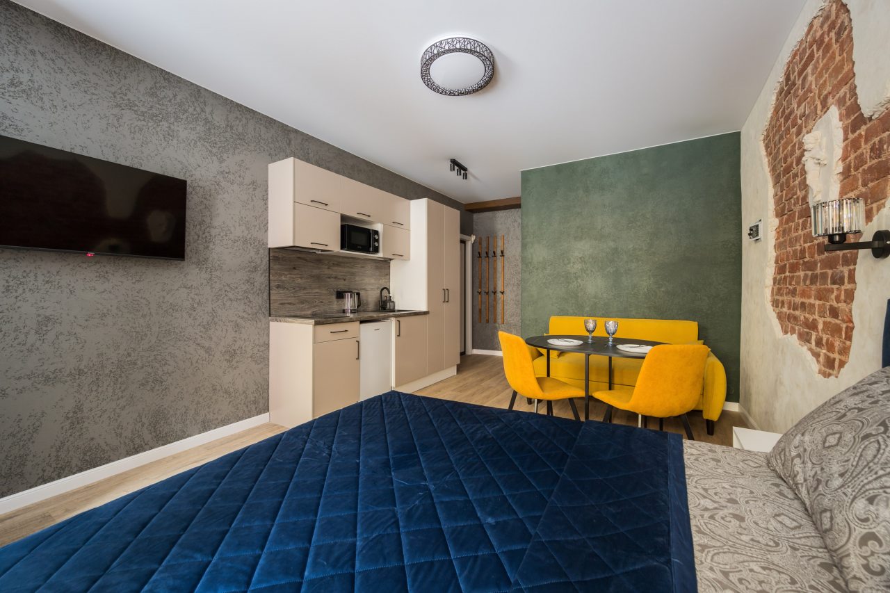 К размещению предлагаются уютные студии с современным ремонтом, которые оборудованы удобными кроватями с чистым комплектом постельного белья, сейфом, диваном, шкафом, телевизором, wi-fi, кухонной зоной и собственной ванной комнатой. Санузел оснащен качественной сантехникой.