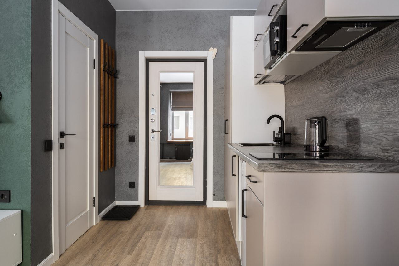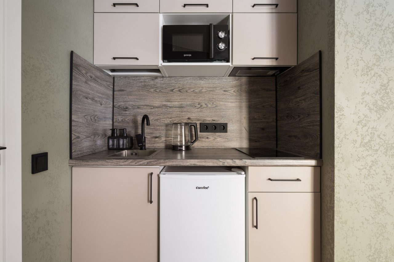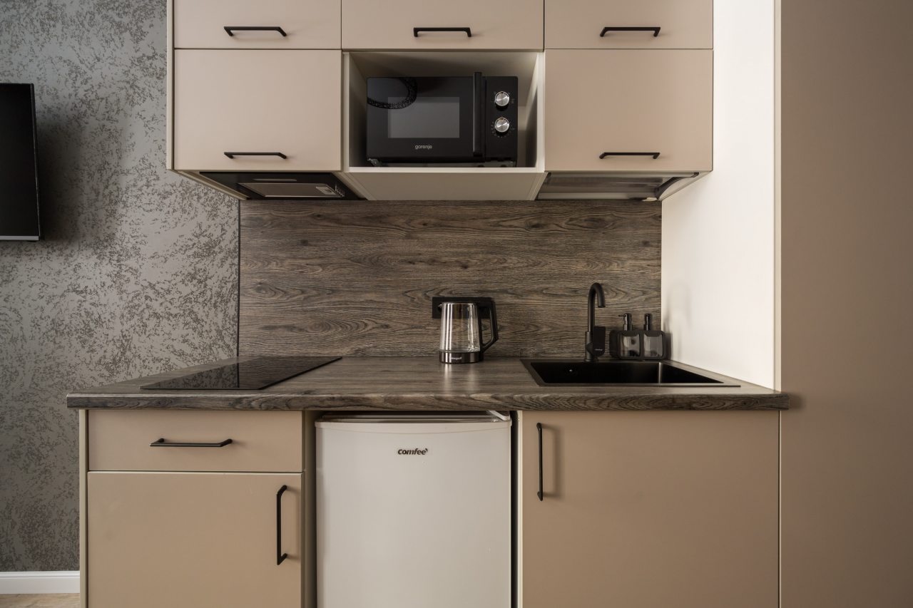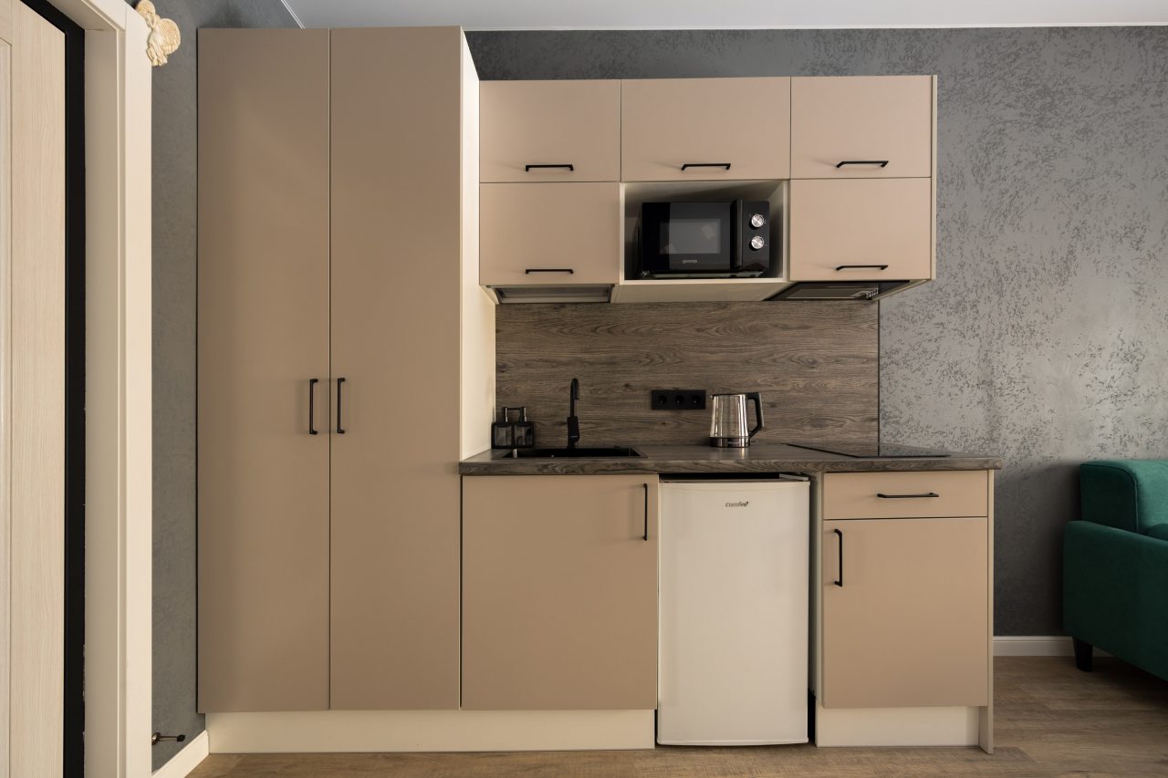 Кухня укомплектована холодильником, электрочайником, вытяжкой, варочной панелью, микроволновой печью. В доступности большой выбор кафе и других заведений на любой вкус, где можно вкусно пообедать.