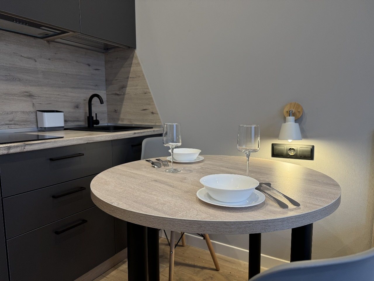 Зона кухни включает СВ-печь, варочную панель, чайник, обеденный стол и все необходимые принадлежности для приготовления еды. Перекусить можно в одном из кафе рядом, как и купить продукты в магазине.