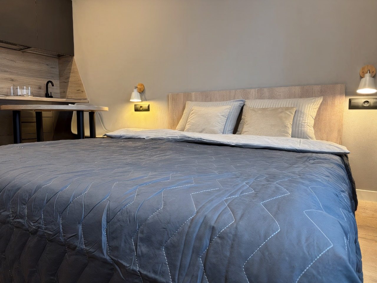 Это светлая студия с современным ремонтом, оснащенная всеми удобствами: есть двуспальная кровать, телевизор, доступ к сети Wi-Fi, в собственной ванной комнате установлена стиральная машина, прилагаются полотенца и гигиенические средства.