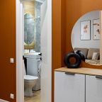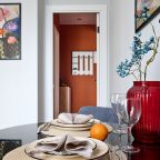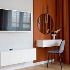 Уютная квартира с современным ремонтом оборудована двуспальной кроватью, прикроватной мебелью, туалетным столиком, письменным столом, затемненными шторами, телевизором и др. Доступна точка высокоскоростного интернета. Санузел имеет комплект качественной сантехники, фен, стиральную машину.