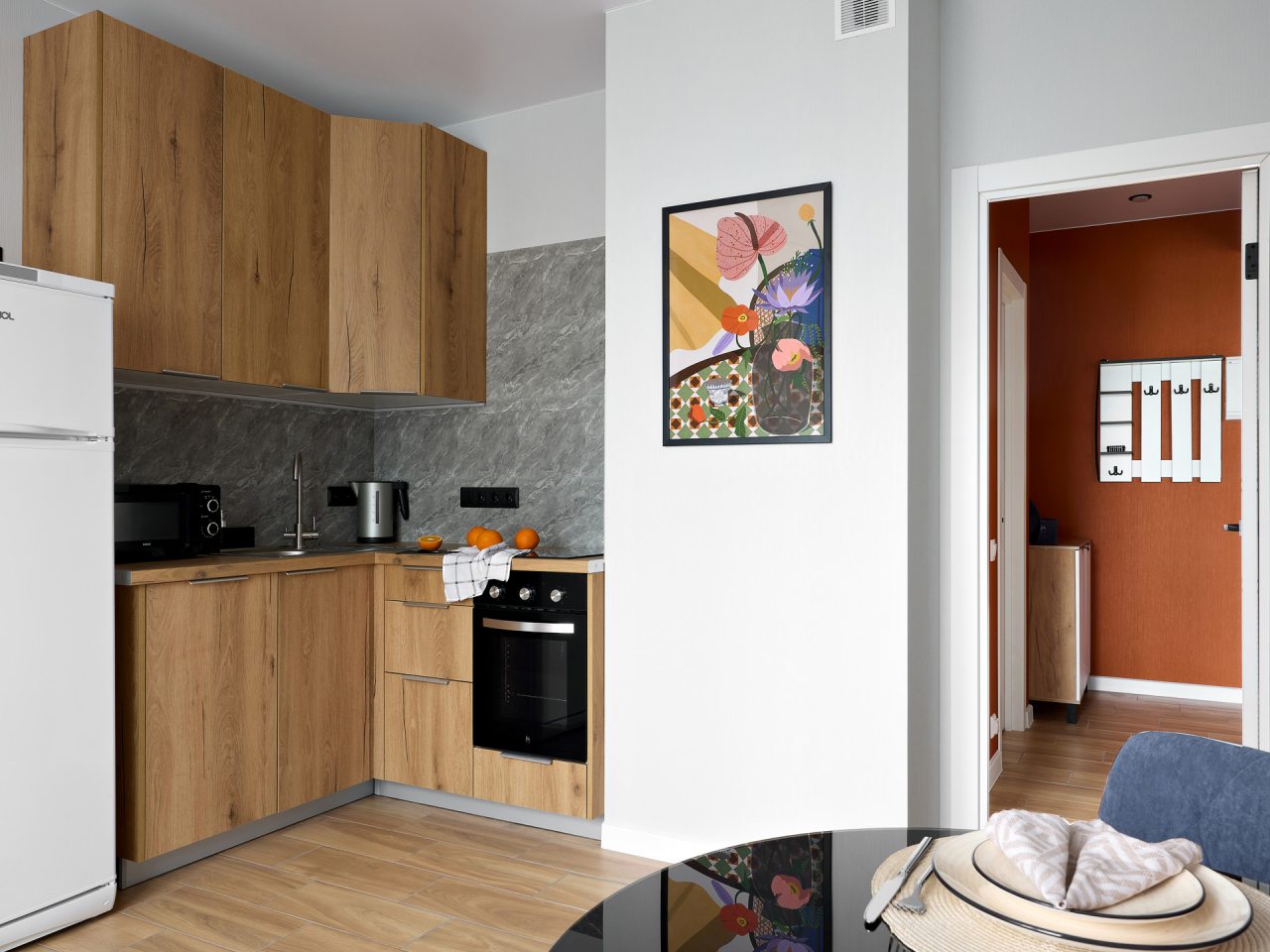 Кухня оснащена гарнитуром, чайником, холодильником, микроволновой печью, духовым шкафом, варочной панелью. В доступности кафе, магазины, рестораны и бары.