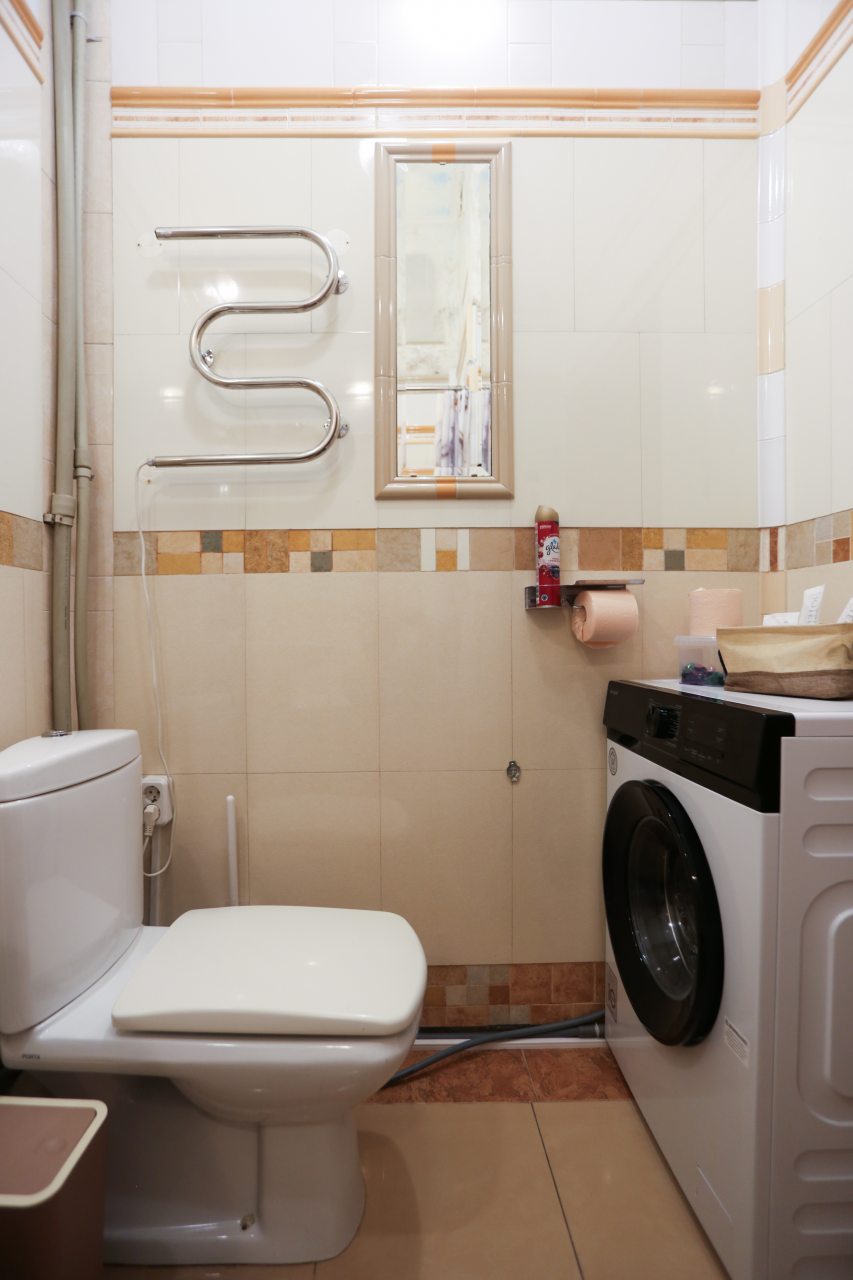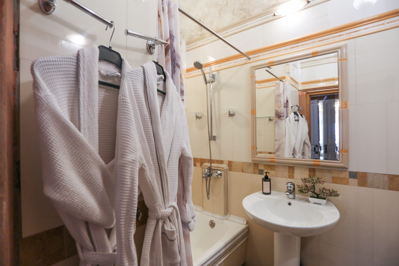 Внутри гостей ожидает удобное спальное место, мягкий диван напротив камина, шкаф с зеркалом, плотные шторы для качественного сна, ванная комната со стиральной машиной и набором средств для личной гигиены.