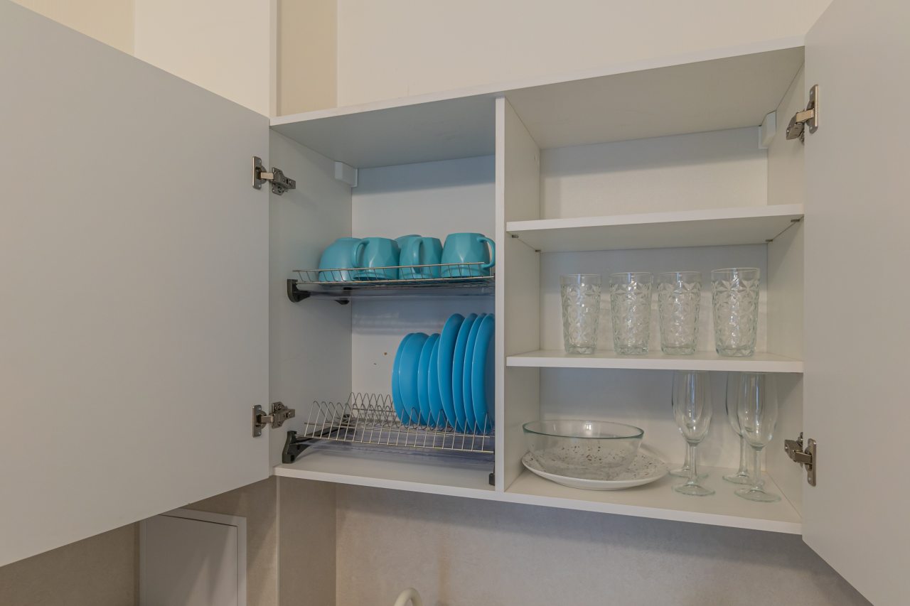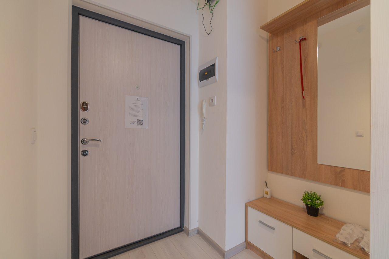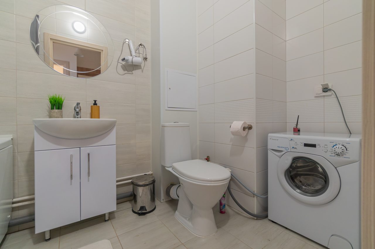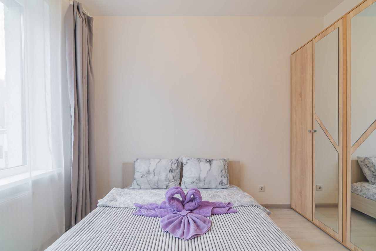 Отдыхающим предоставляется квартира с приятной цветовой гаммой. В апартаментах есть двуспальная кровать, прикроватная тумбочка, большой шкаф, балкон, кухня и ванная комната. Для полного удовлетворения гостей имеется постельное белье, полотенца, гладильная доска, сушилка, пылесос, телевидение, вентилятор, фен и бесплатный Wi-Fi. Также рядом с домом находится детская площадка и есть возможность заселения с домашним питомцем.