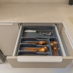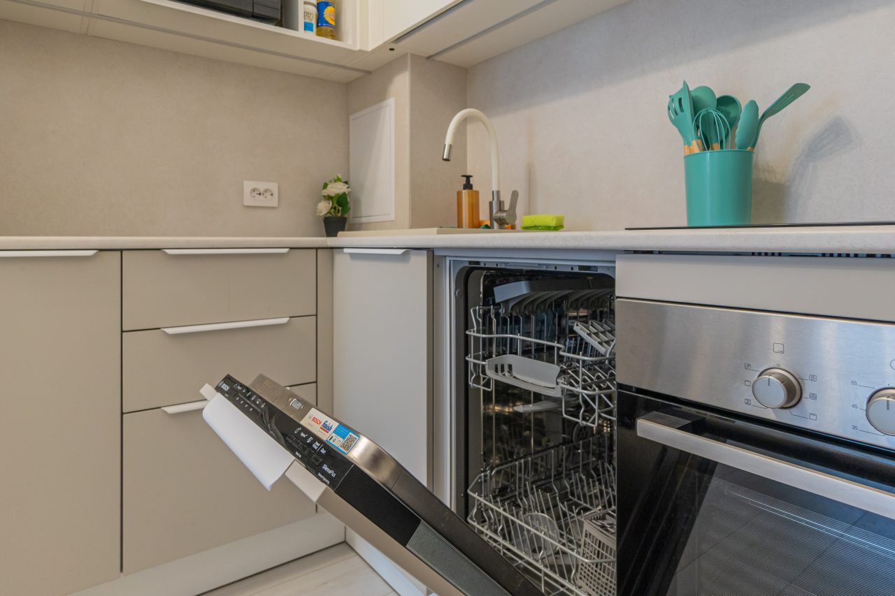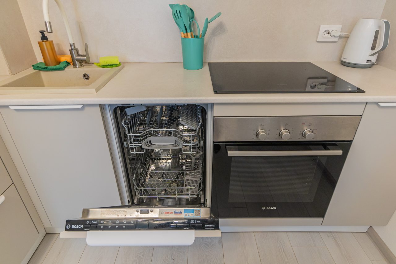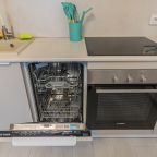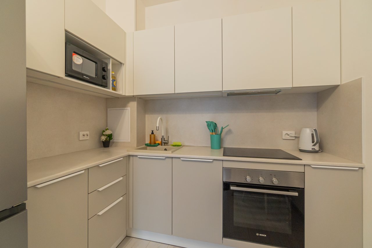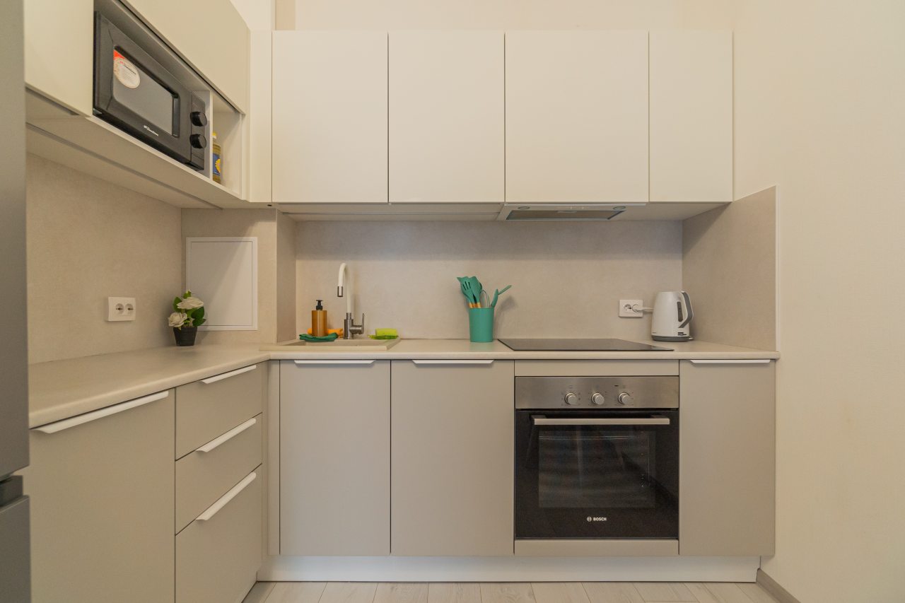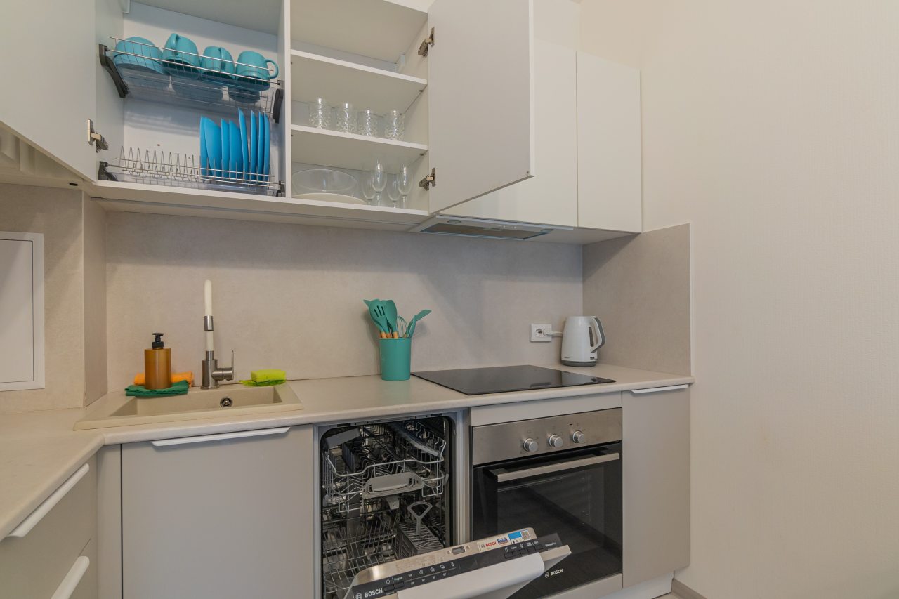 На просторной кухне постояльцы могут самостоятельно заниматься готовкой, т.к. там есть все необходимое для этого: электрическая плита, духовой шкаф, микроволновая печь, холодильник, электрический чайник, столовые приборы и набор посуды. Для большего комфорта в квартире есть обеденная зона. Также в 0,6 км есть кафе быстрого питания «99 Level» и магазин продуктов.