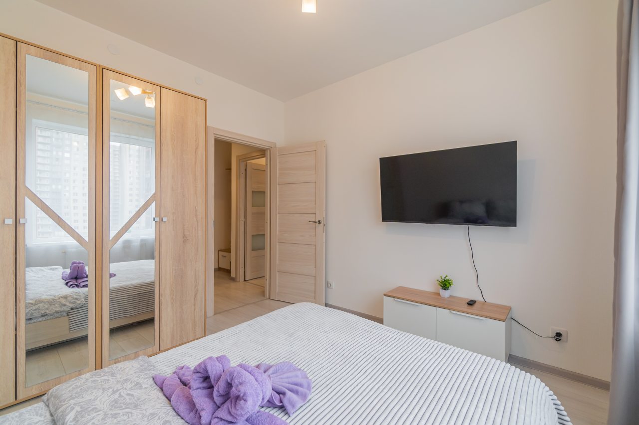 Симпатичная новая квартира с хорошим ремонтом. Есть все необходимое, в том числе стиральная машина, гладильные принадлежности, пылесос. Кухня небольшая, но впринципе есть все необходимое. Удобно, что есть вай фай. Из окон открывается красивый вид, можно увидеть Лахту центр. Имеется балкончик.