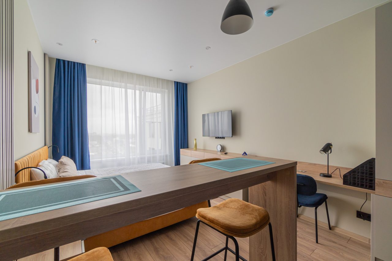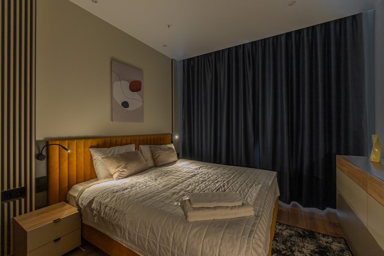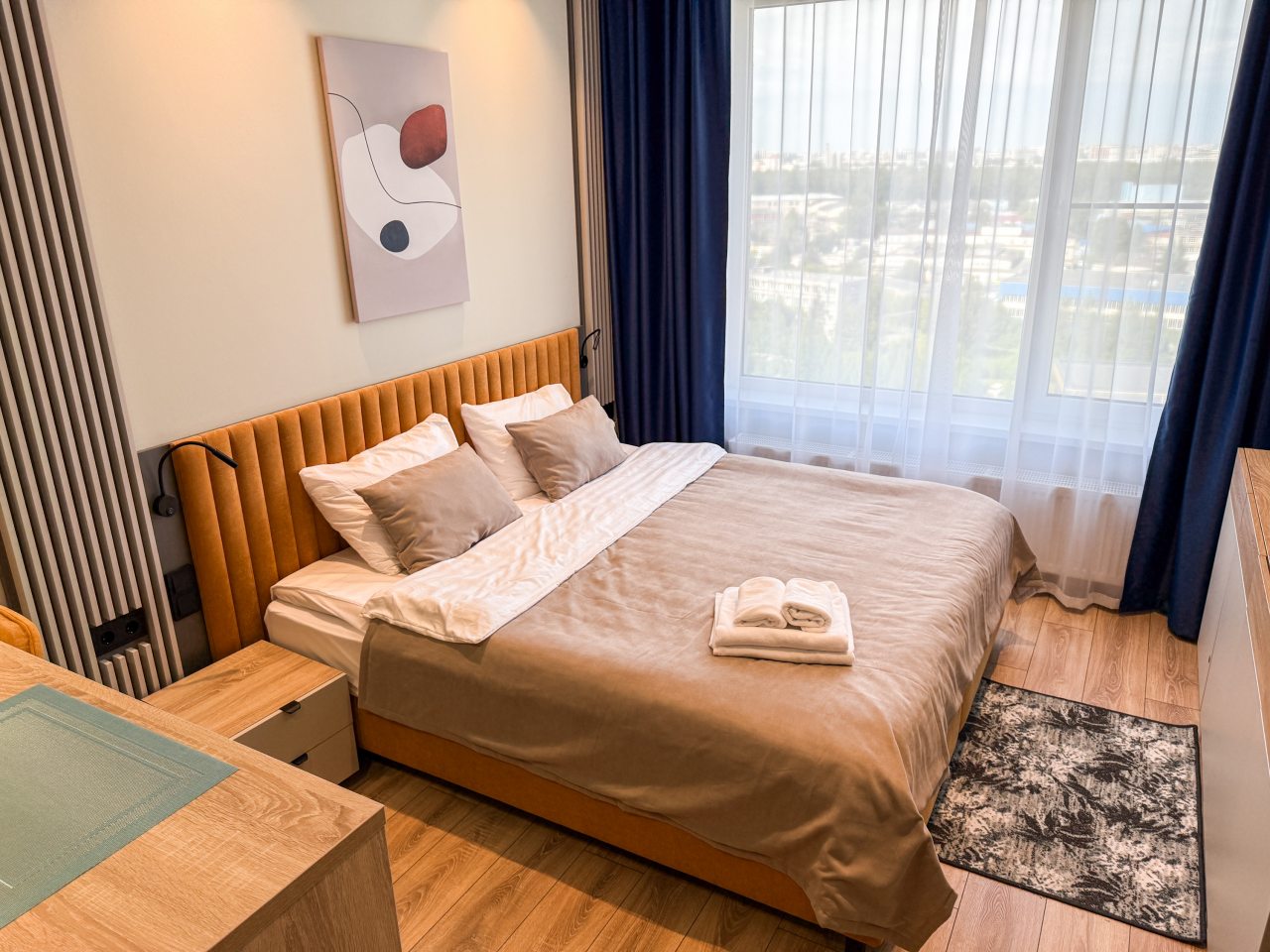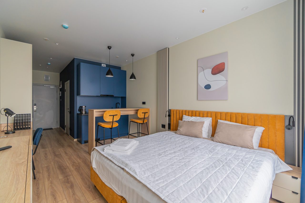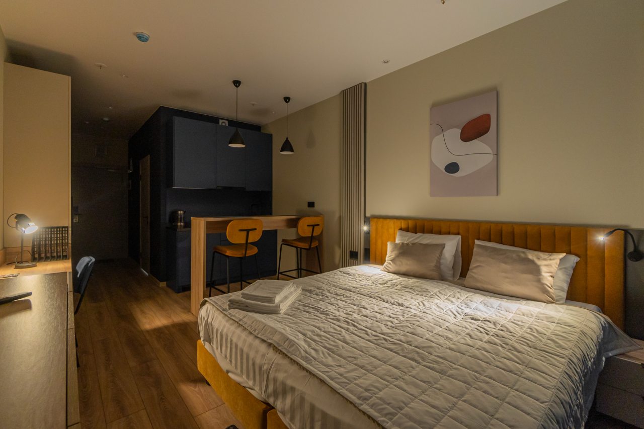 К пребыванию предложены комфортабельные апартаменты, выполненные в современном стиле с использованием приятных оттенков цветовой палитры. Они оснащены: удобной двуспальной кроватью с белоснежным постельным бельем, телевизором, столом, прикроватными тумбочками, ванной комнатой. При необходимости можно воспользоваться гладильными принадлежностями.