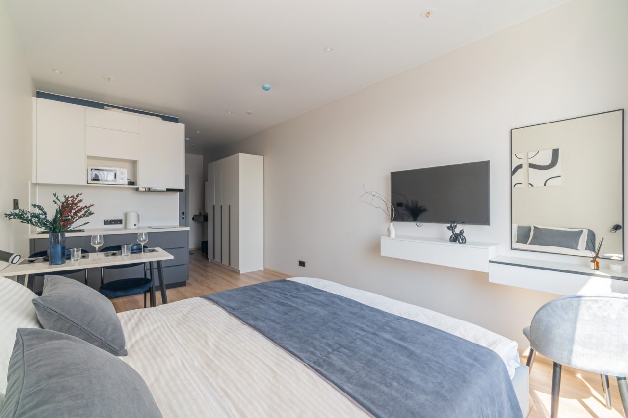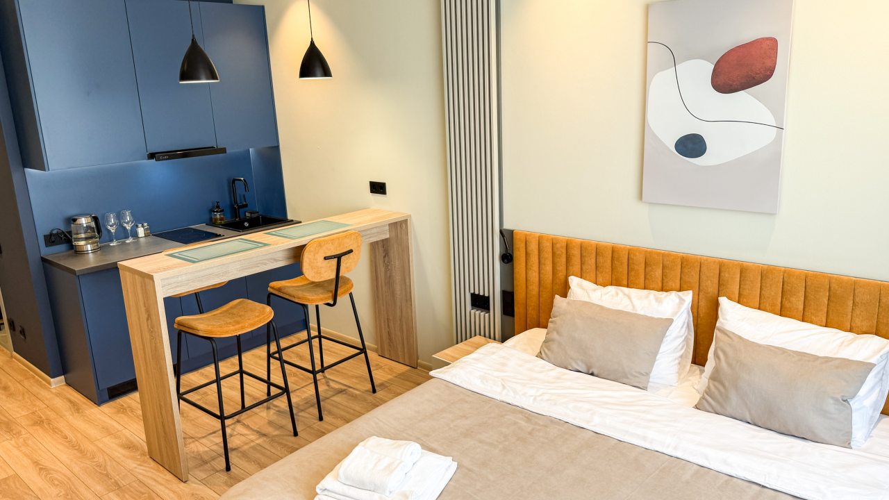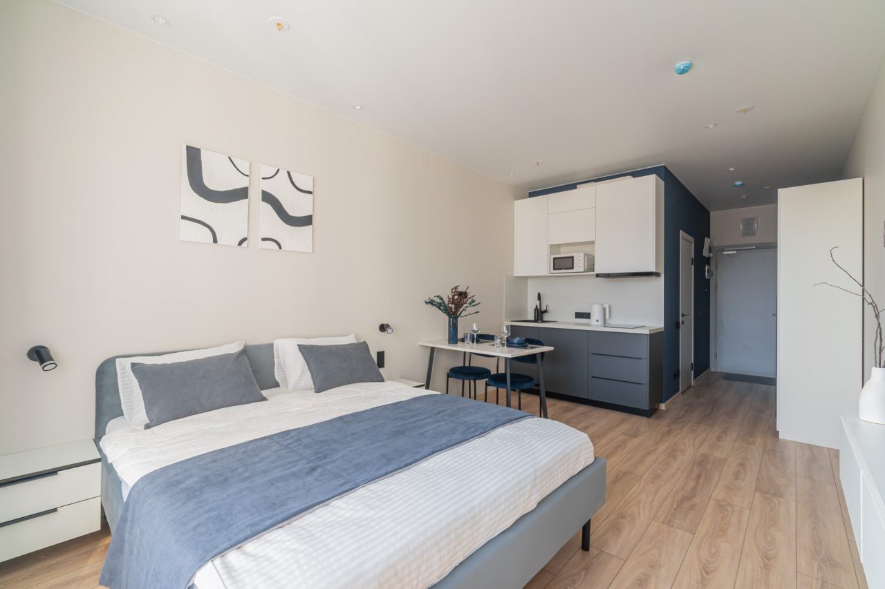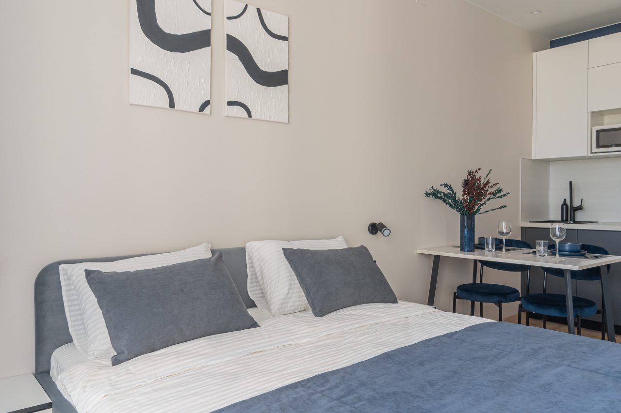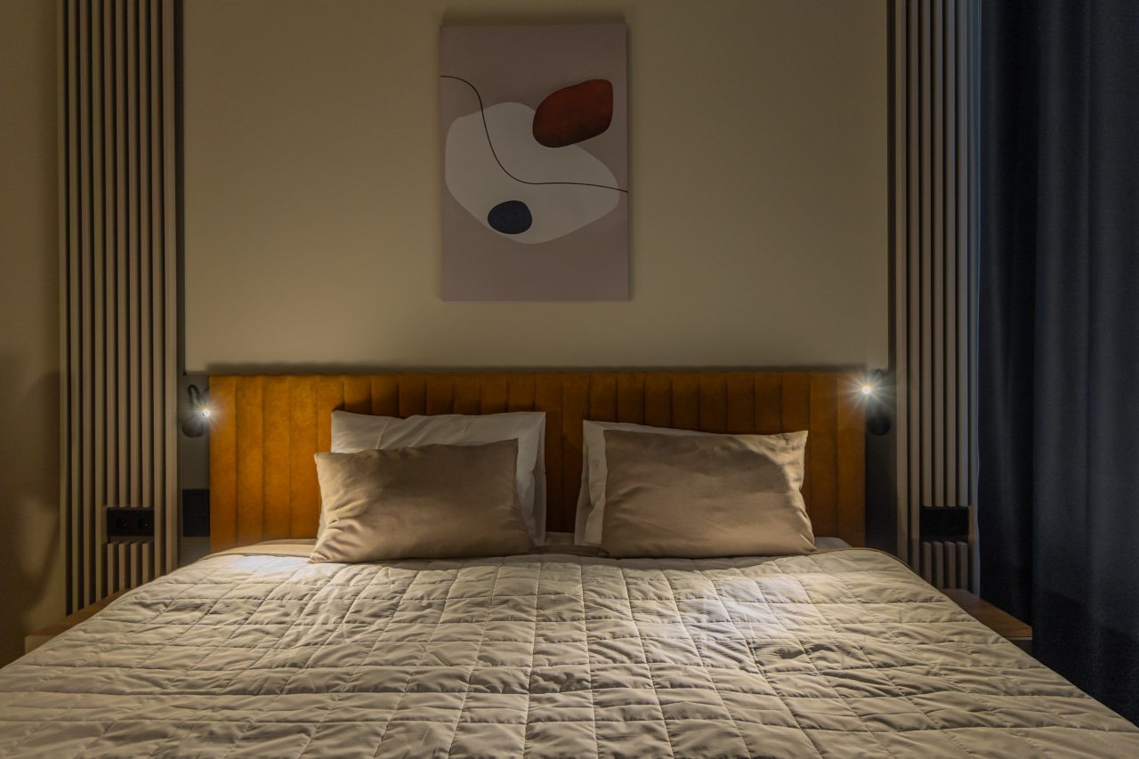 К пребыванию предложены комфортабельные апартаменты, выполненные в современном стиле с использованием приятных оттенков цветовой палитры. Они оснащены: удобной двуспальной кроватью с белоснежным постельным бельем, телевизором, столом, прикроватными тумбочками, ванной комнатой. При необходимости можно воспользоваться гладильными принадлежностями.