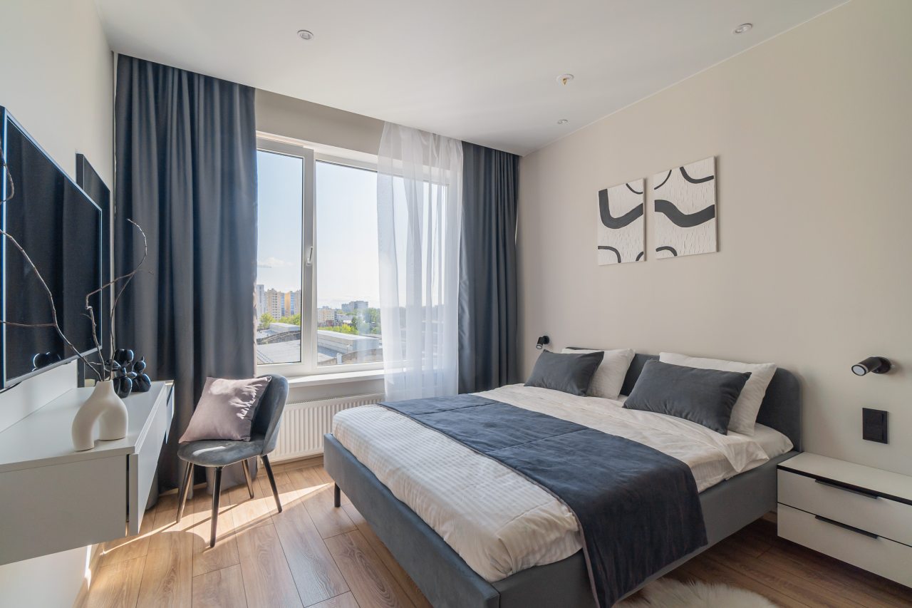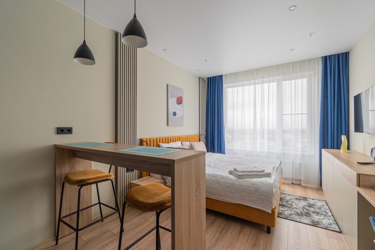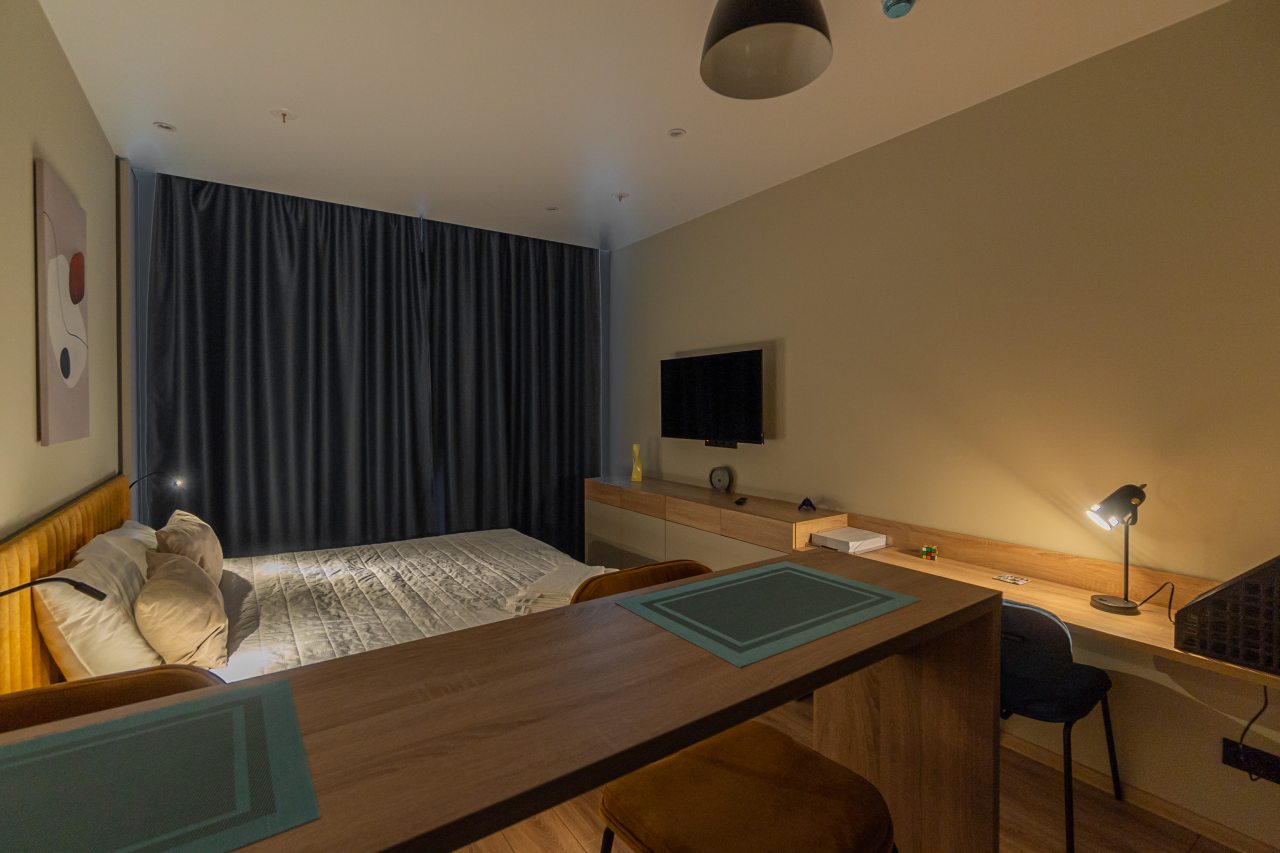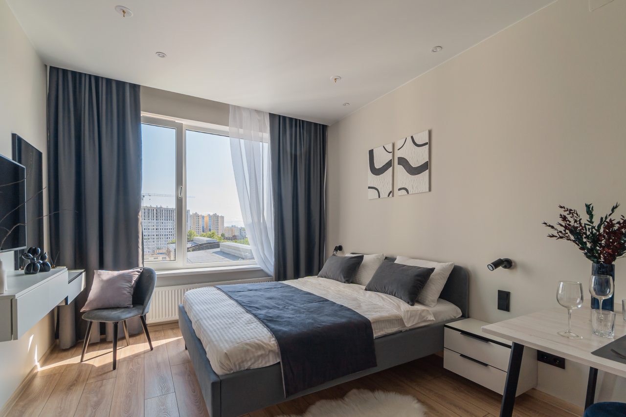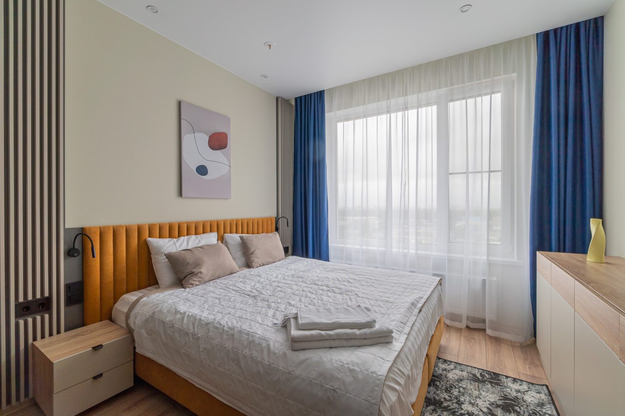 К пребыванию предложены комфортабельные апартаменты, выполненные в современном стиле с использованием приятных оттенков цветовой палитры. Они оснащены: удобной двуспальной кроватью с белоснежным постельным бельем, телевизором, столом, прикроватными тумбочками, ванной комнатой. При необходимости можно воспользоваться гладильными принадлежностями.