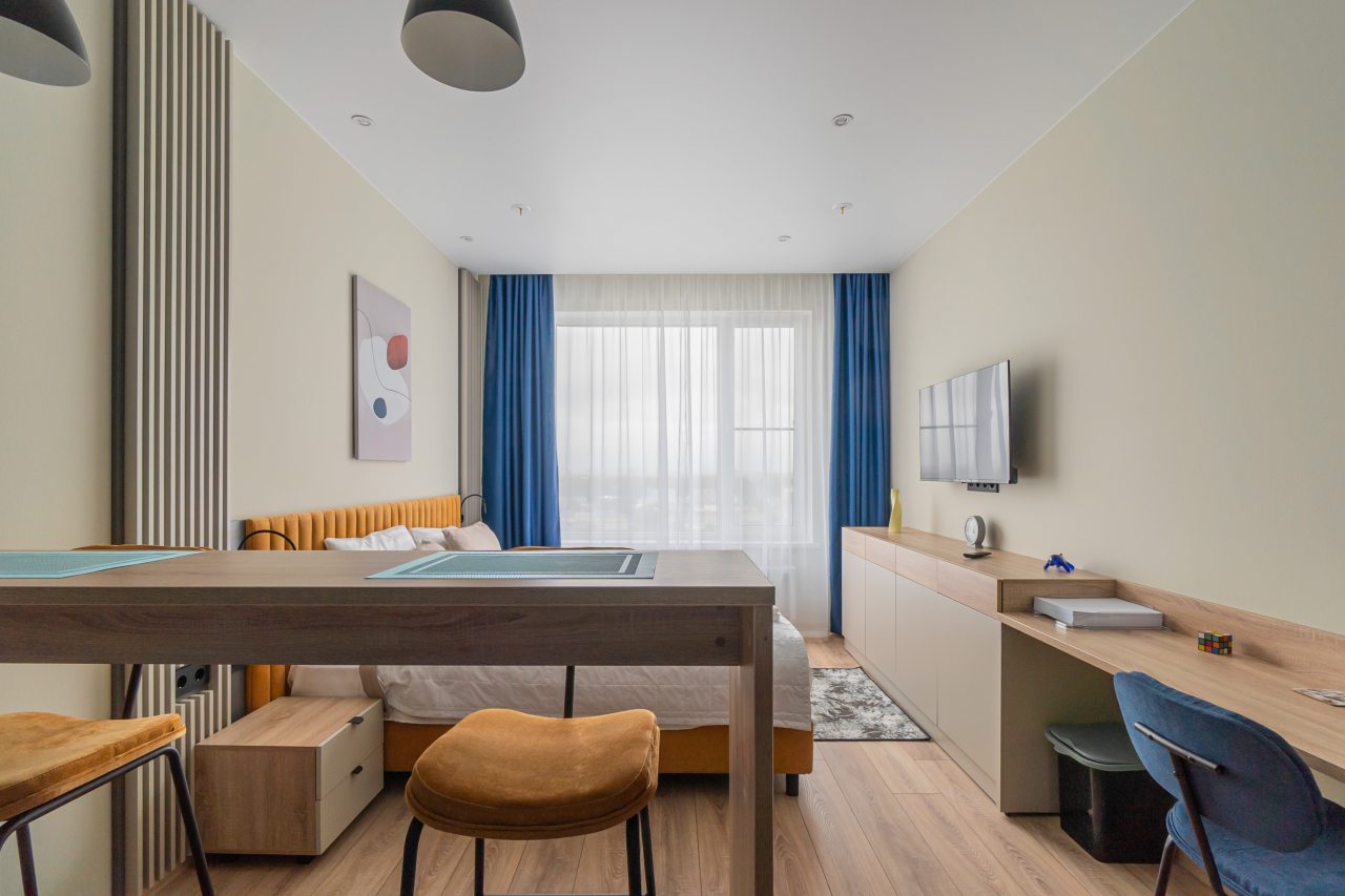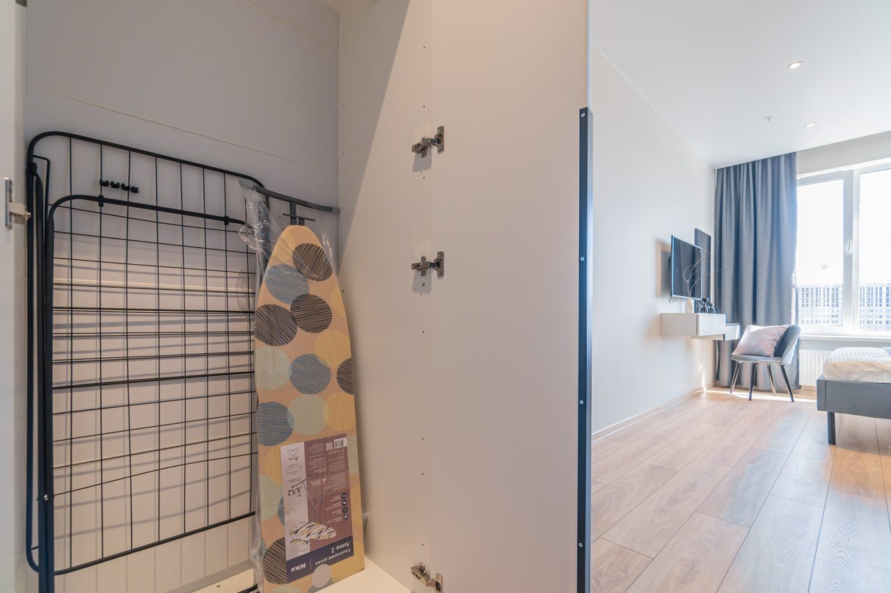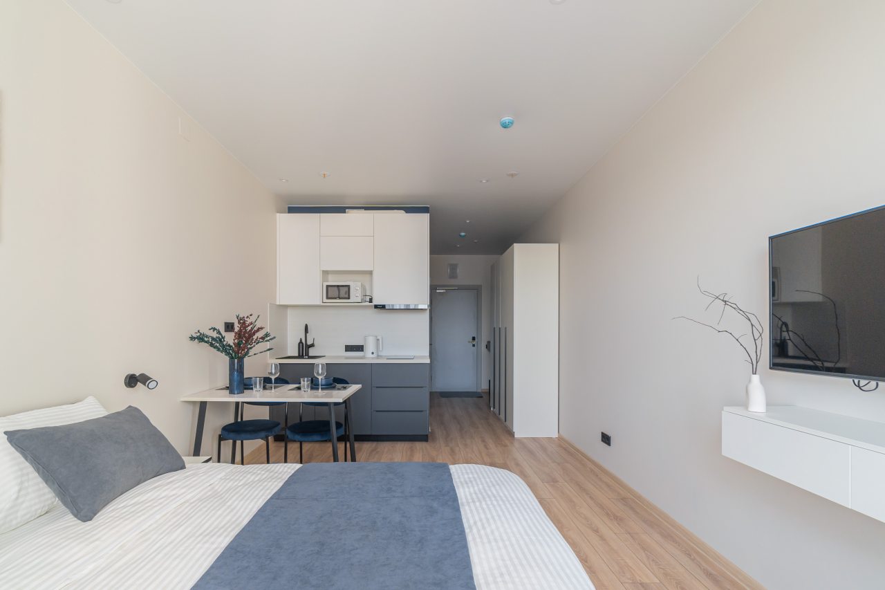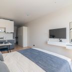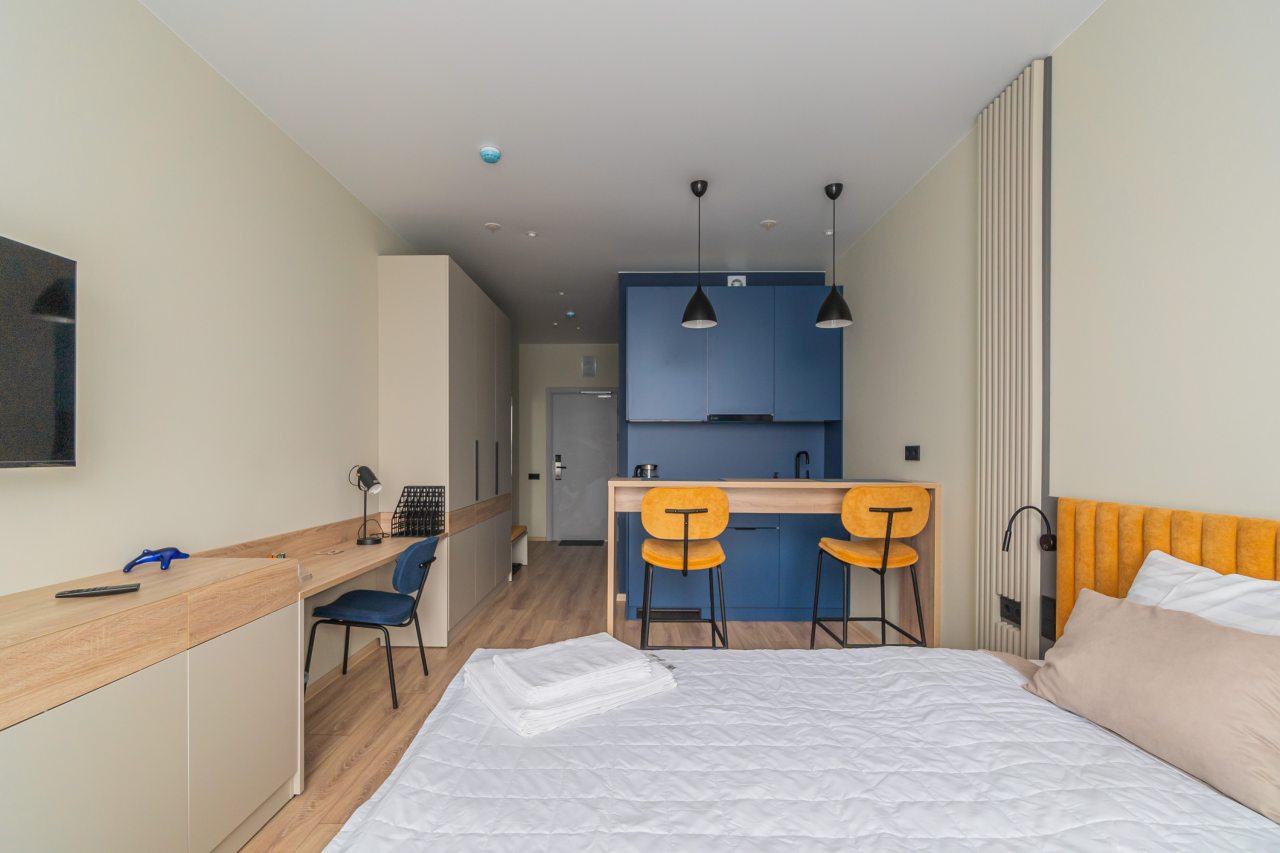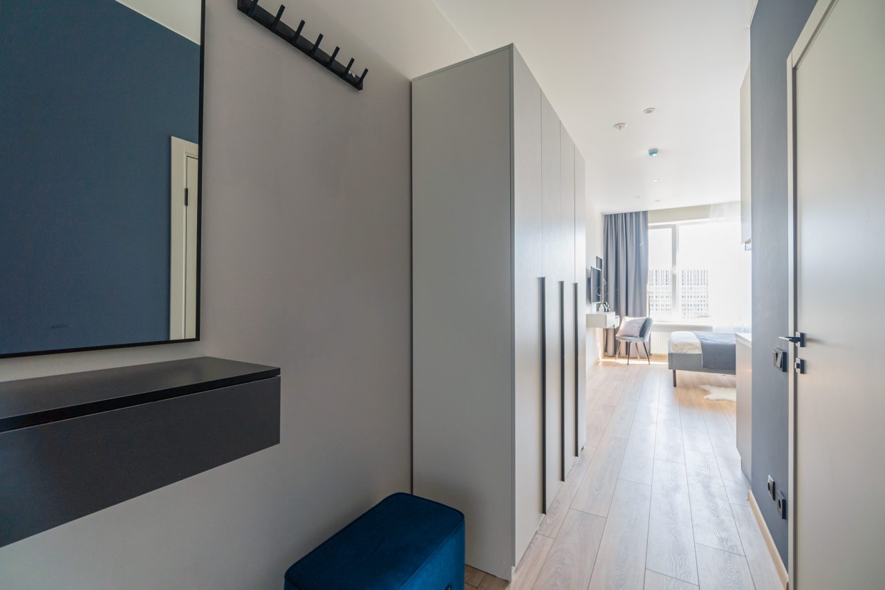 К пребыванию предложены комфортабельные апартаменты, выполненные в современном стиле с использованием приятных оттенков цветовой палитры. Они оснащены: удобной двуспальной кроватью с белоснежным постельным бельем, телевизором, столом, прикроватными тумбочками, ванной комнатой. При необходимости можно воспользоваться гладильными принадлежностями.