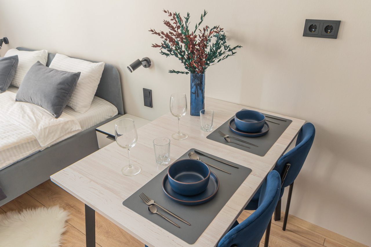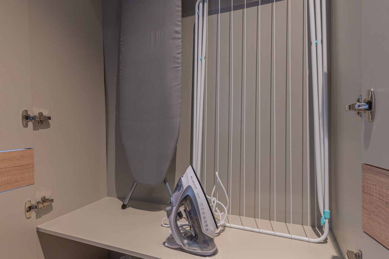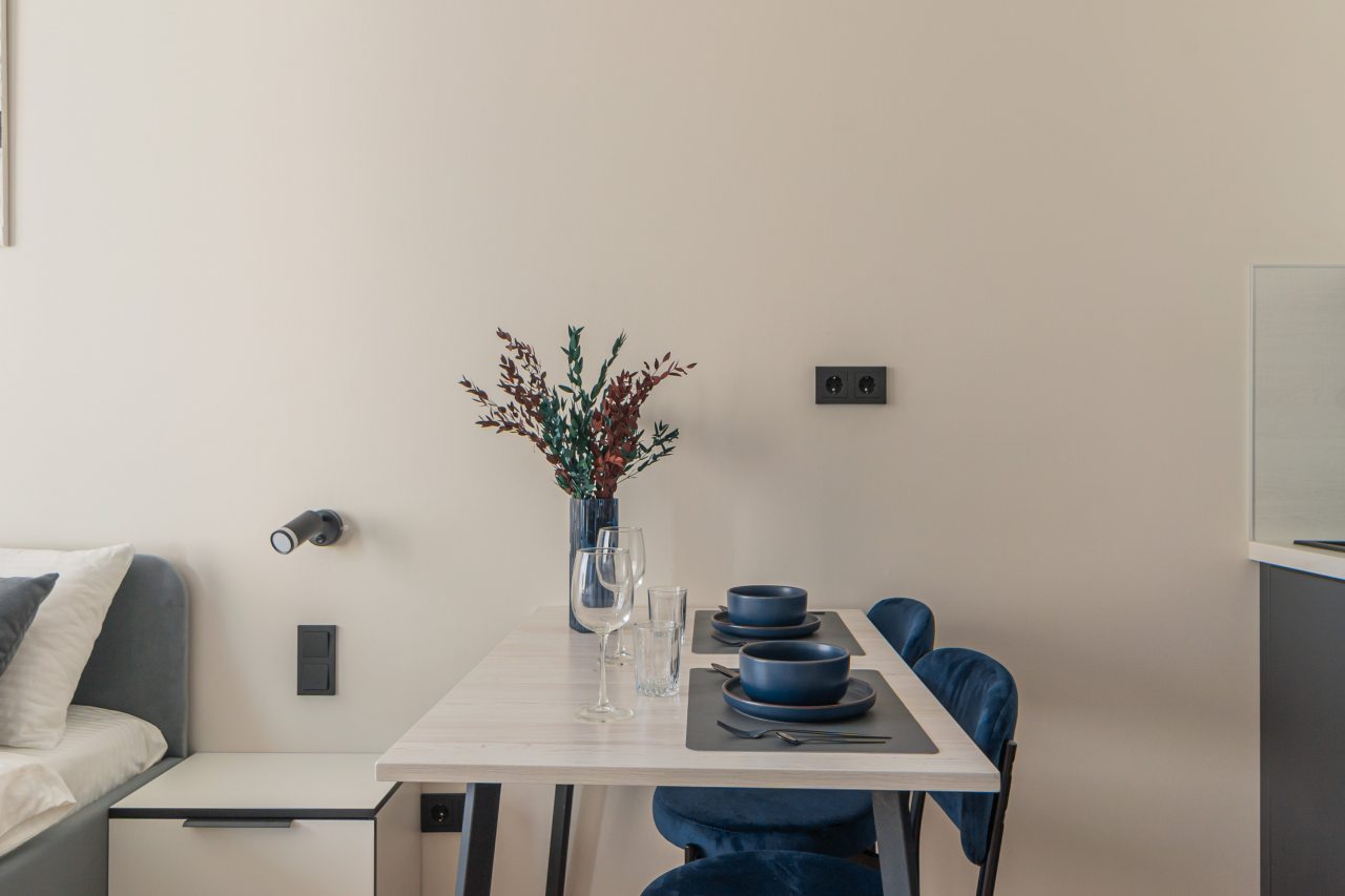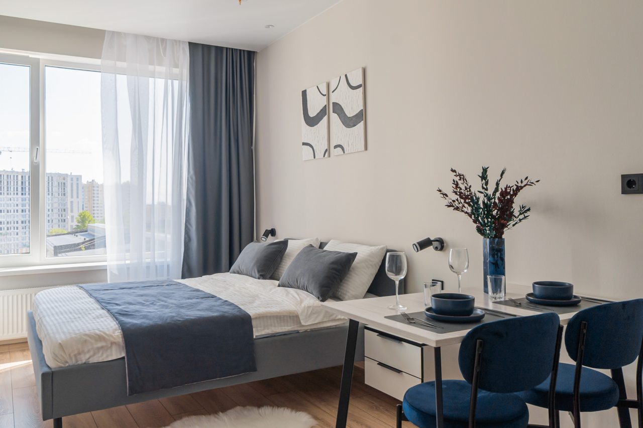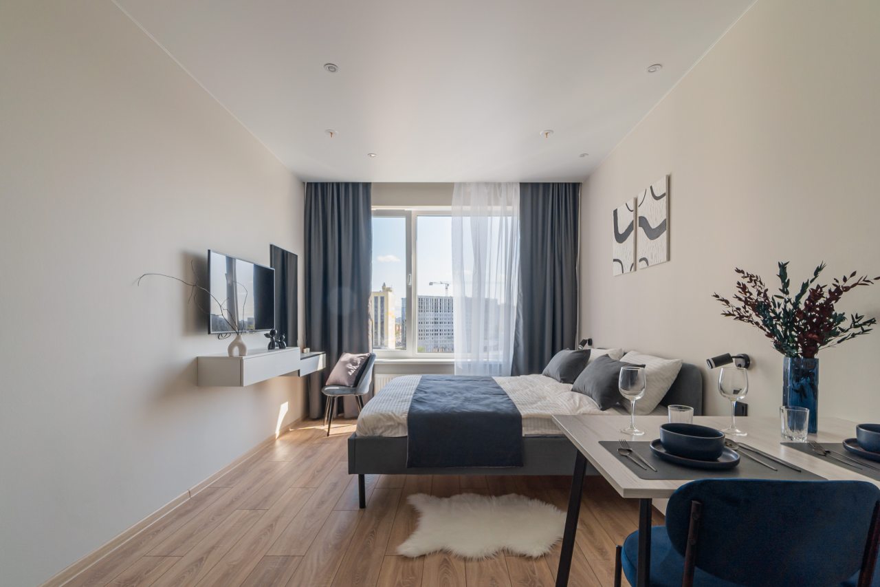 К пребыванию предложены комфортабельные апартаменты, выполненные в современном стиле с использованием приятных оттенков цветовой палитры. Они оснащены: удобной двуспальной кроватью с белоснежным постельным бельем, телевизором, столом, прикроватными тумбочками, ванной комнатой. При необходимости можно воспользоваться гладильными принадлежностями.