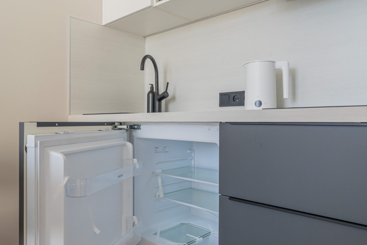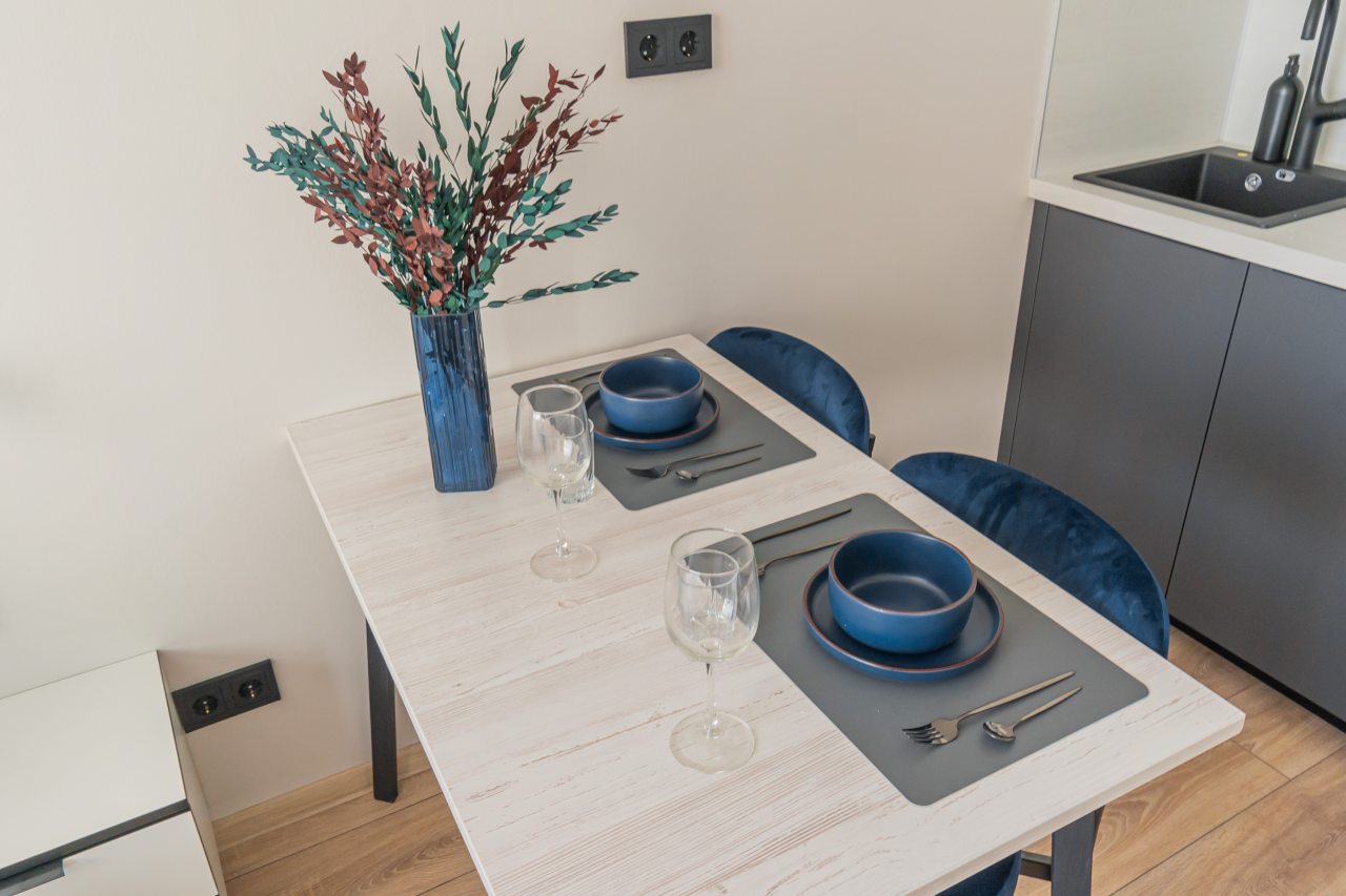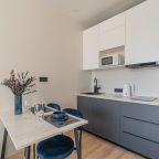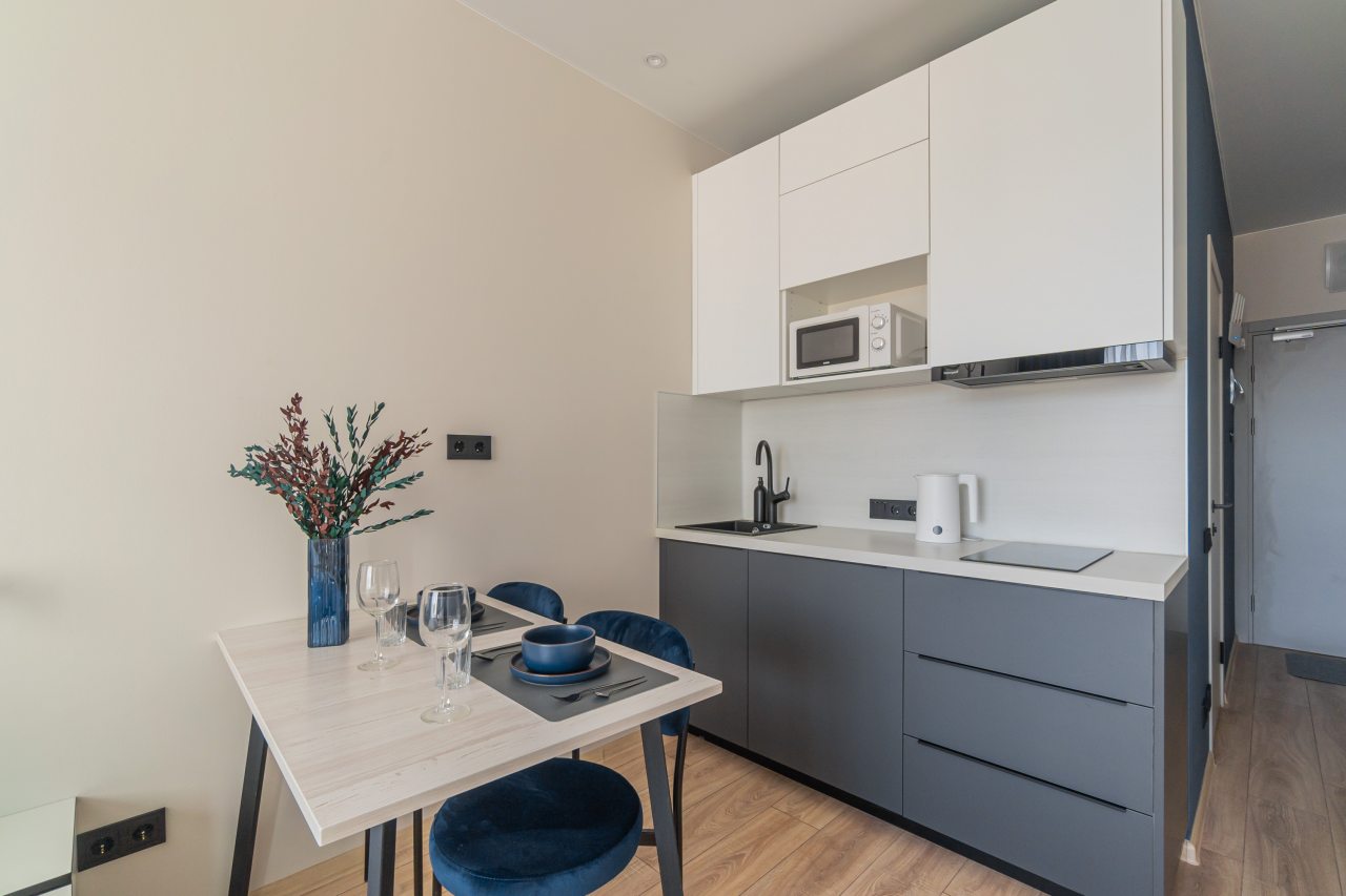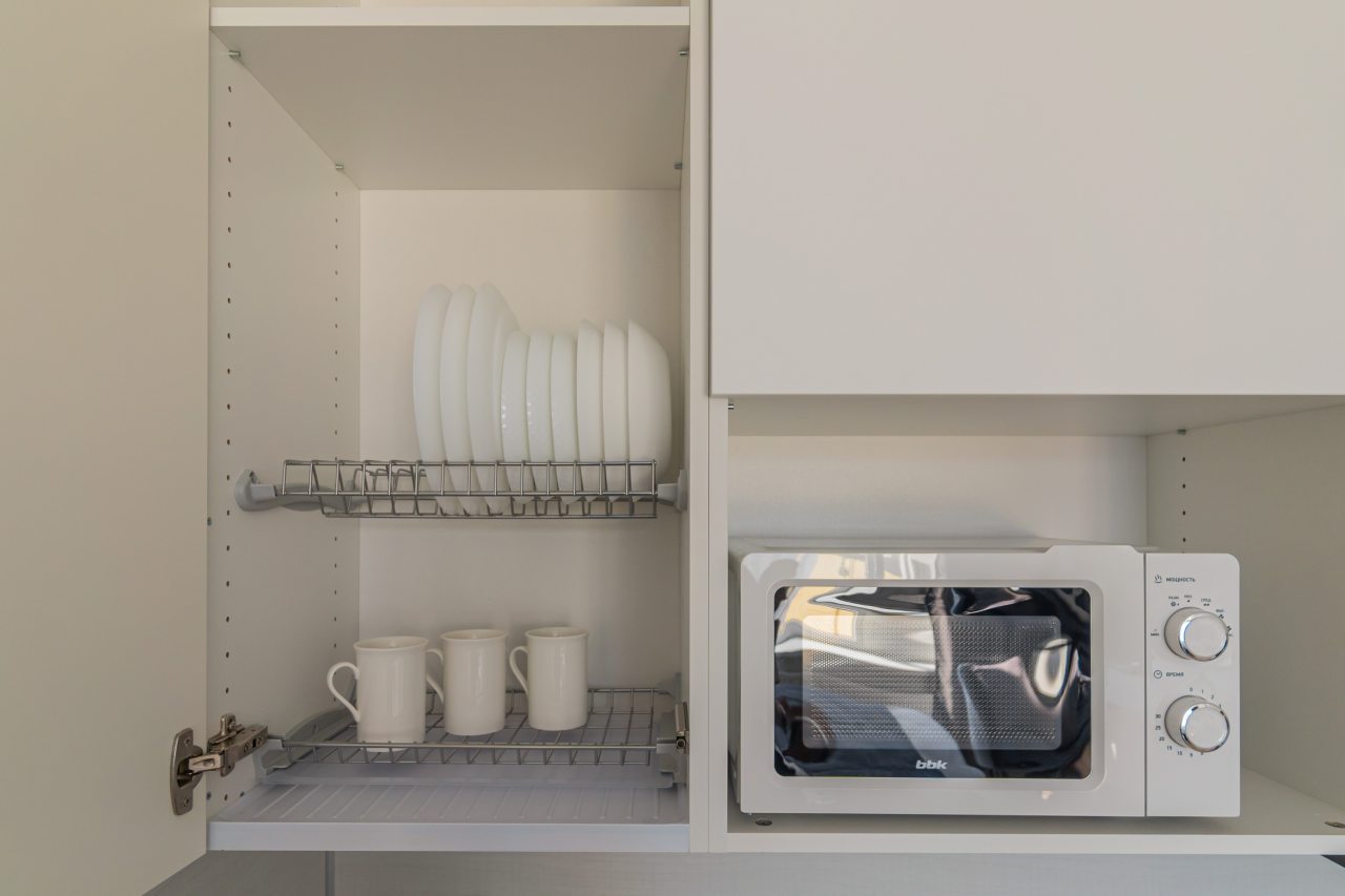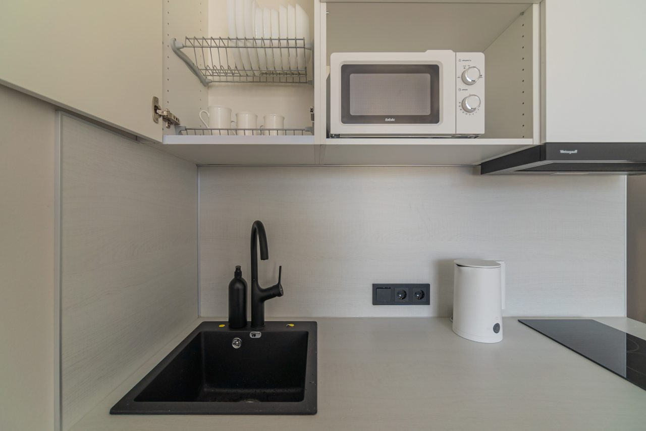 В кухонной зоне гости найдут необходимые бытовые приборы и посуду для организации перекусов и приготовления блюд: варочная панель, электрочайник, микроволновая печь. Поблизости работают кафе и ресторан, где можно вкусно пообедать.