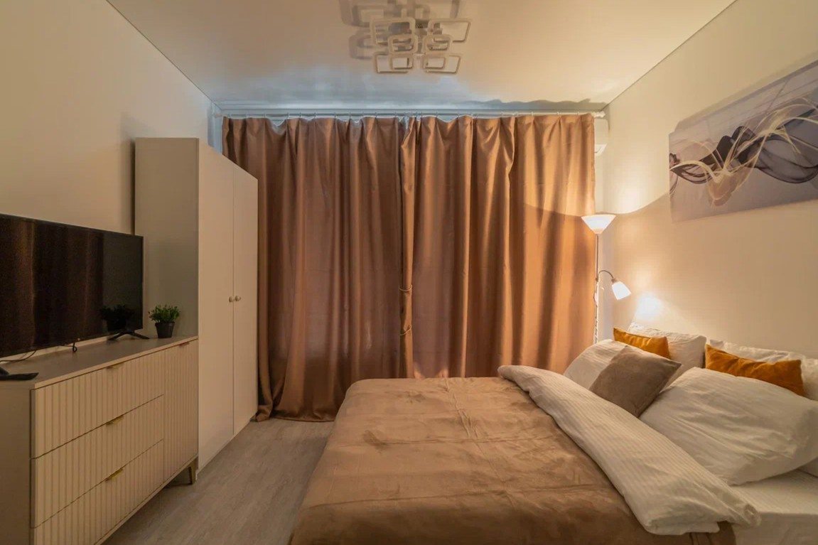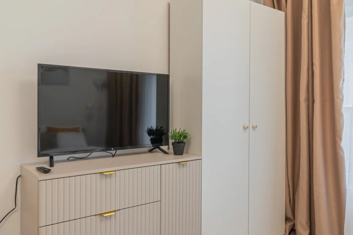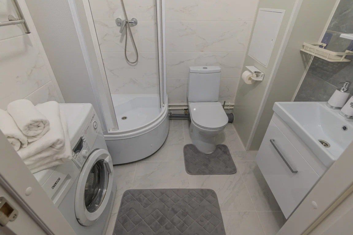 Здесь продумано всё для комфортного проживания и отдыха гостей, в том числе удобная двуспальная кровать, комод, вместительный шкаф, красивая лоджия с панорамным остеклением, мягкий диван, телевизор, гладильные и сушильные принадлежности, стиральная машина, а также санузел с душем.
