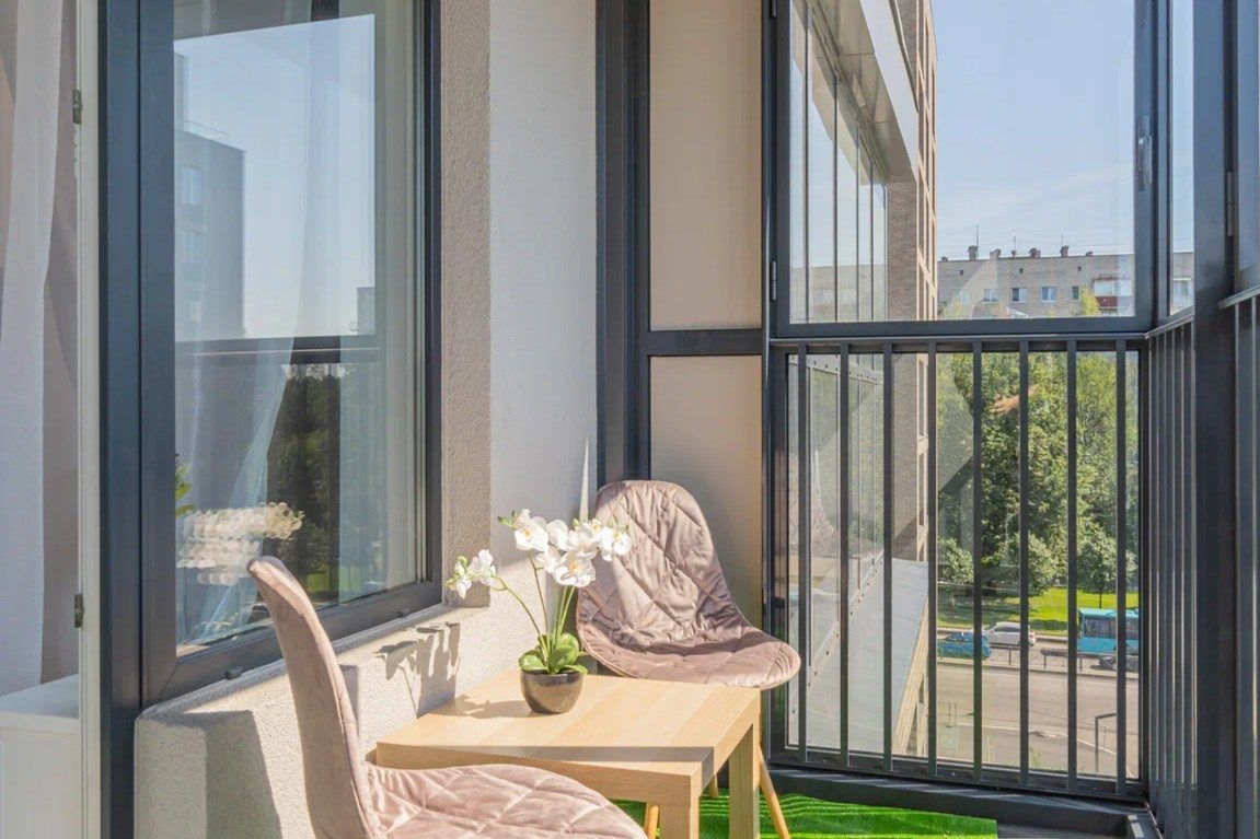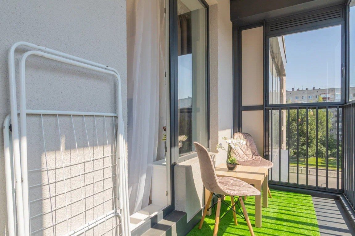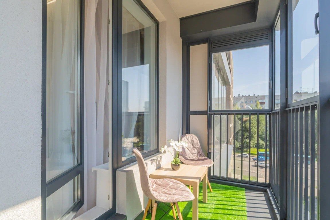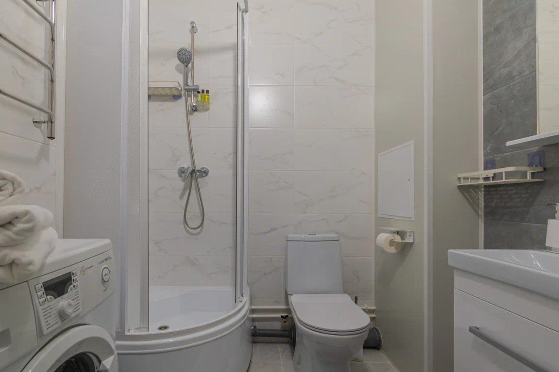 Здесь продумано всё для комфортного проживания и отдыха гостей, в том числе удобная двуспальная кровать, комод, вместительный шкаф, красивая лоджия с панорамным остеклением, мягкий диван, телевизор, гладильные и сушильные принадлежности, стиральная машина, а также санузел с душем.