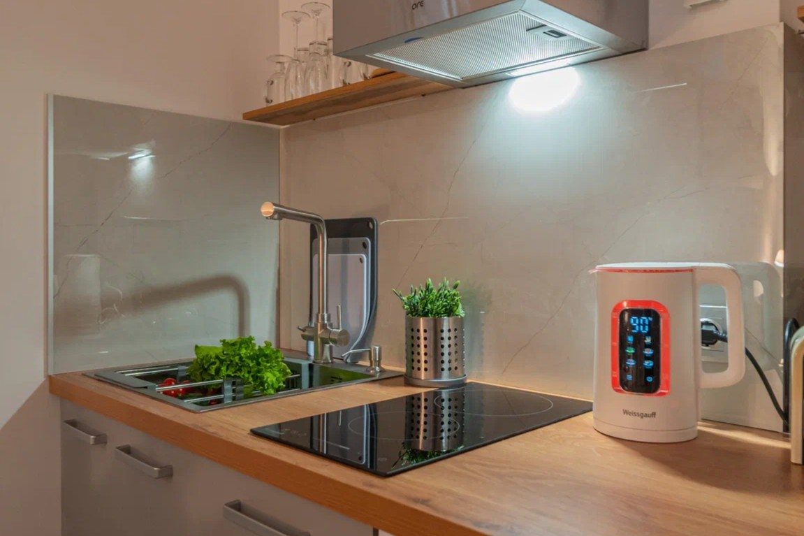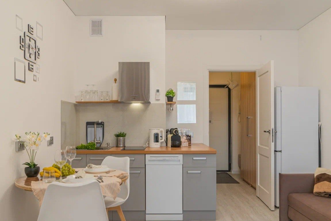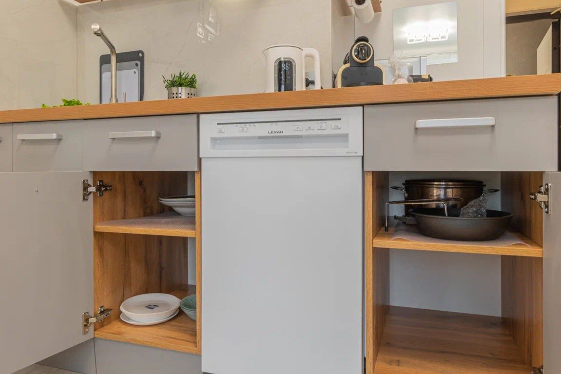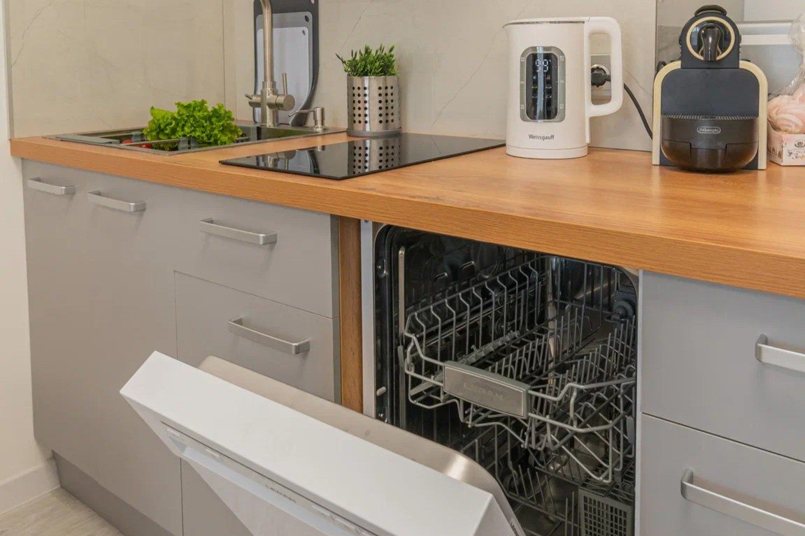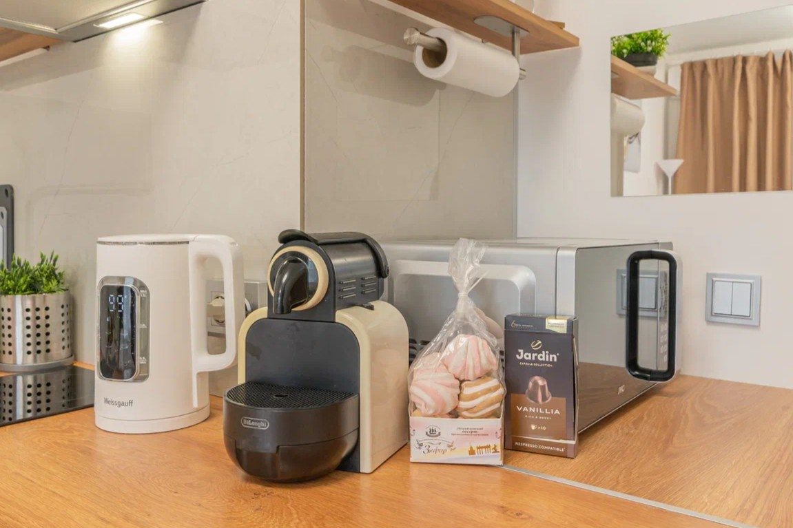 Кухонная зона порадует вас разнообразием бытовой техники, включая чайник, кофемашину, варочную панель, набор посуды, посудомоечную машину.