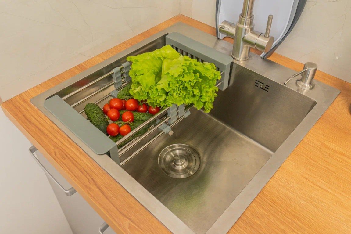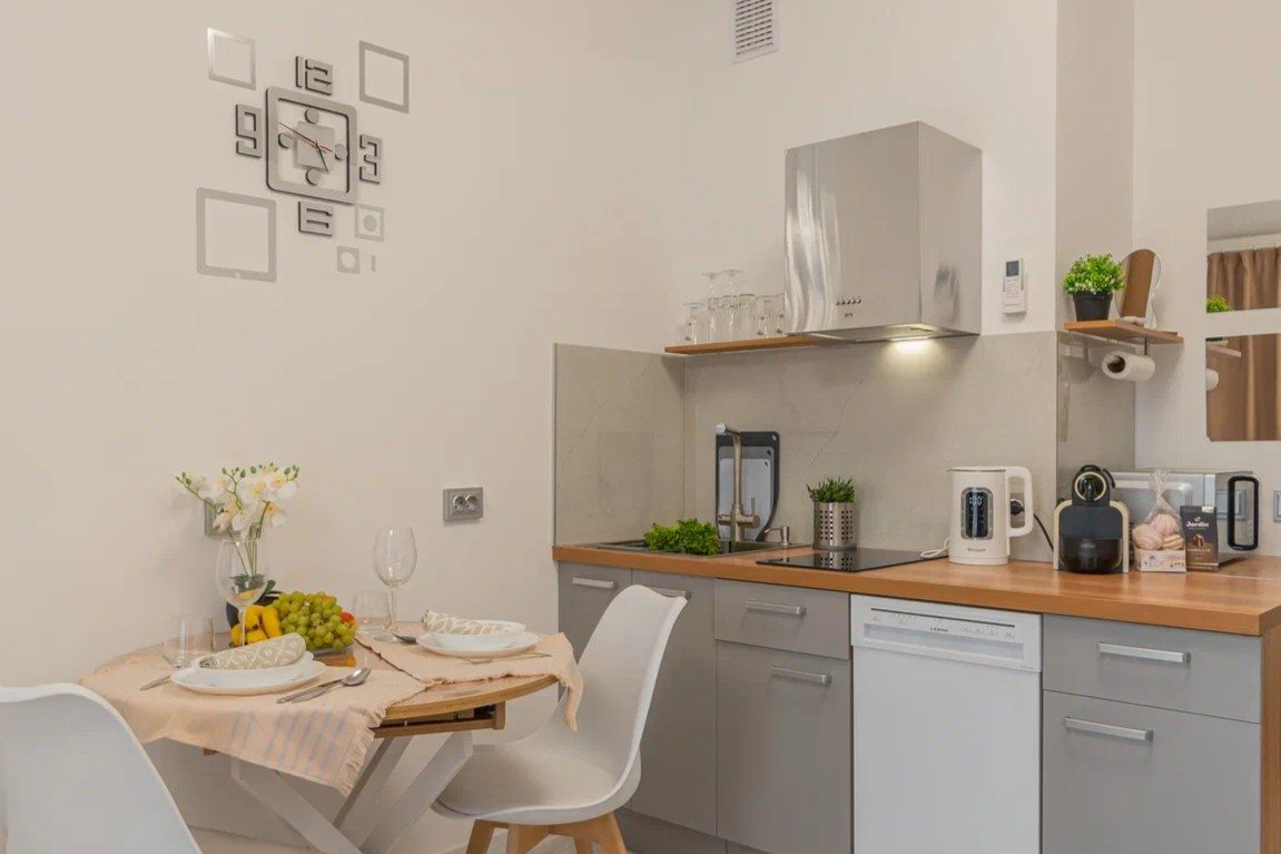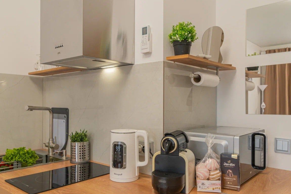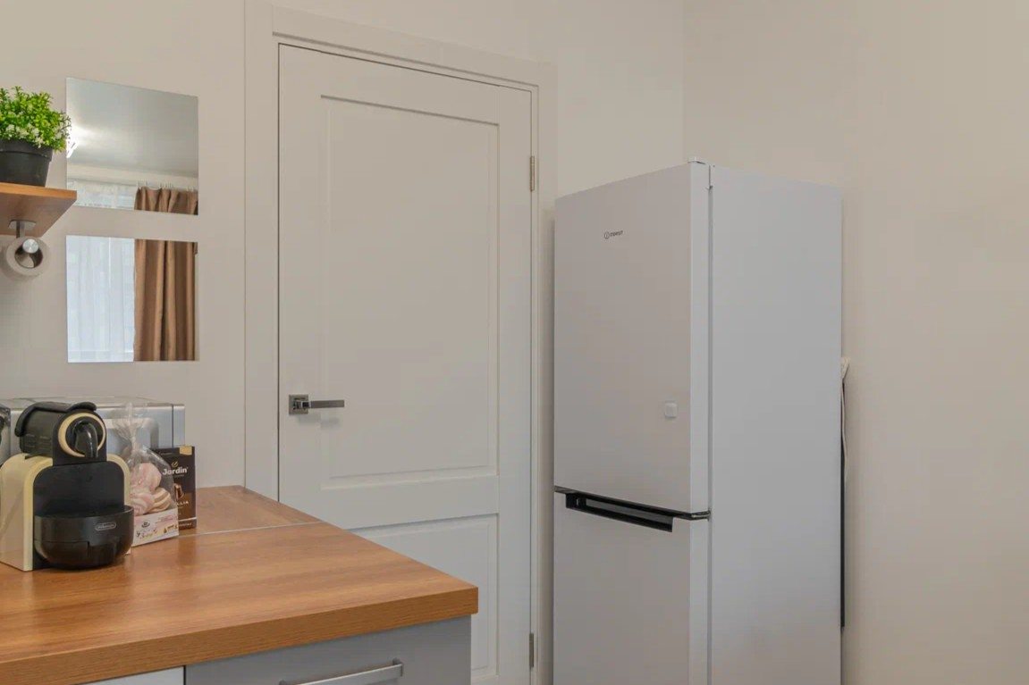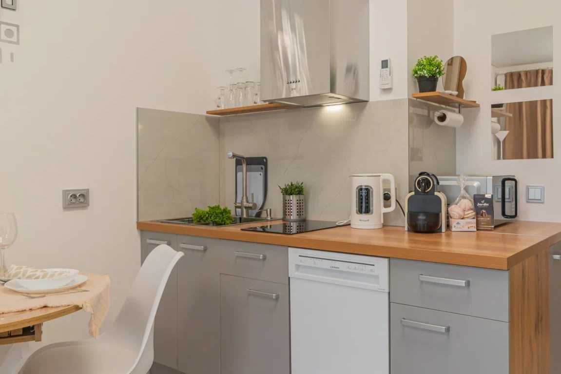 Кухонная зона порадует вас разнообразием бытовой техники, включая чайник, кофемашину, варочную панель, набор посуды, посудомоечную машину.