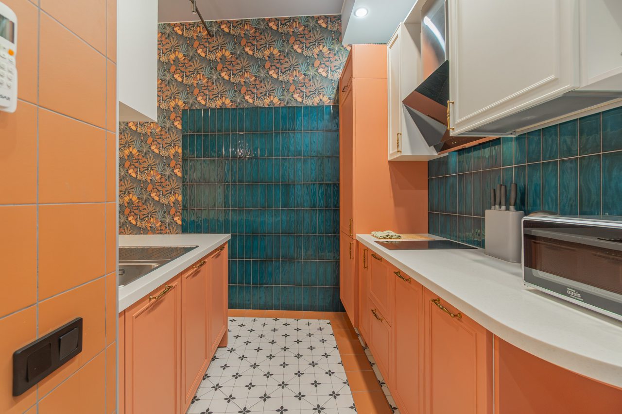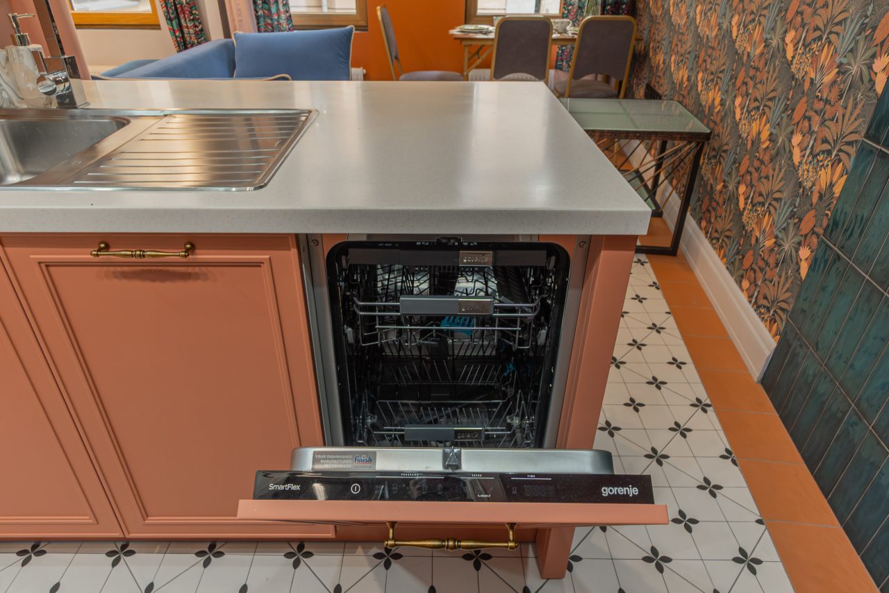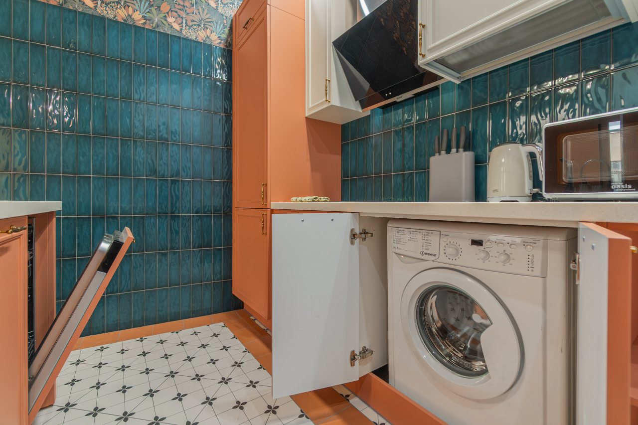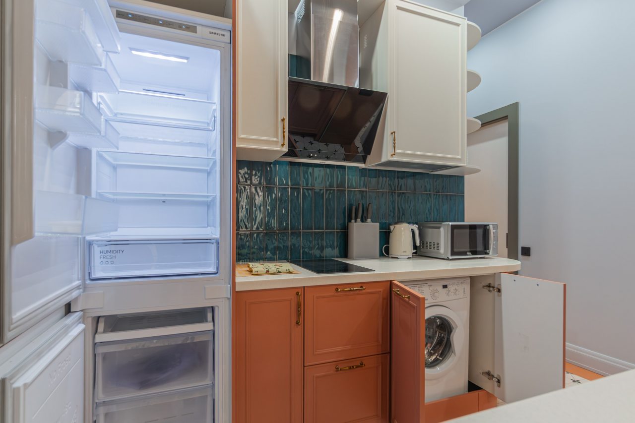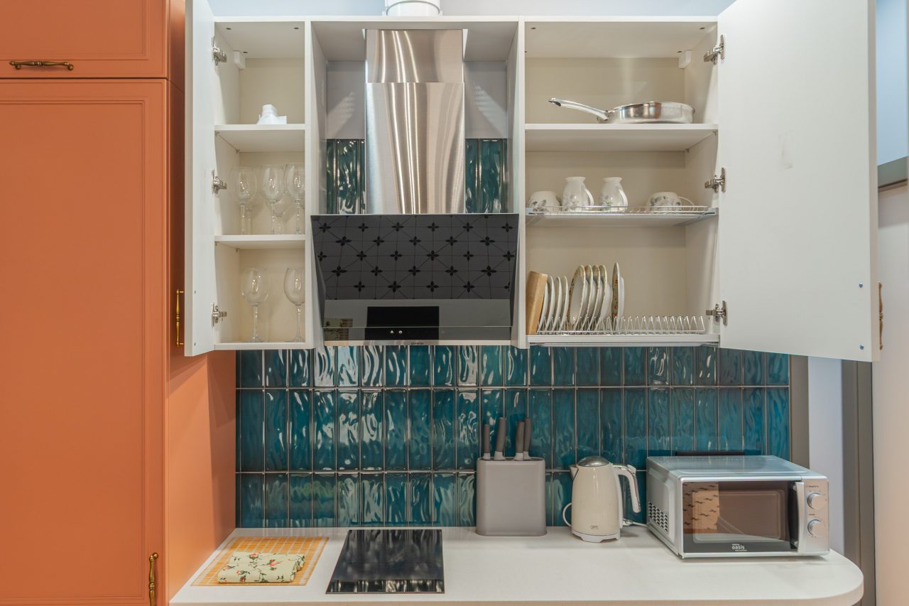 Кухонная зона включает в себя СВЧ-печь, чайник, варочную панель, вытяжку, посудомоечную машину, различную посуду, чтобы вы могли порадовать себя приготовлением любимых напитков и блюд.