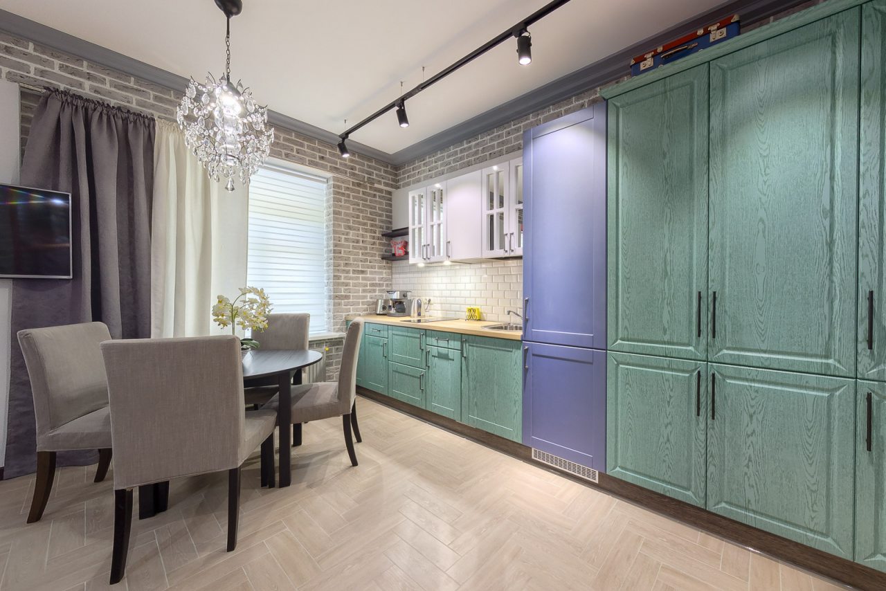 Комплектация кухонной бытовой техники может отличаться в зависимости от категории. В большинстве имеется плита, холодильник, чайник, обеденная зона.