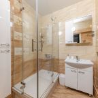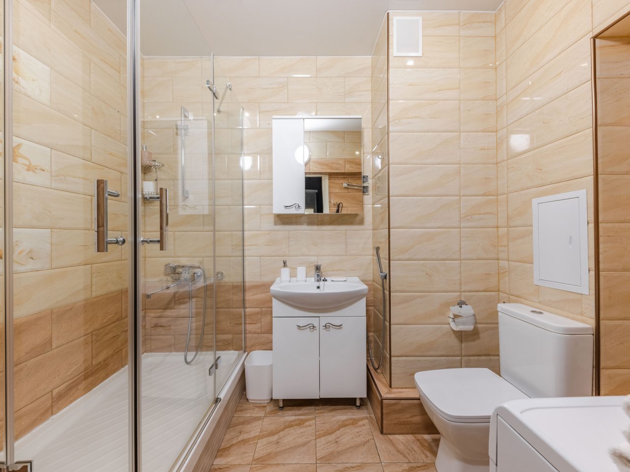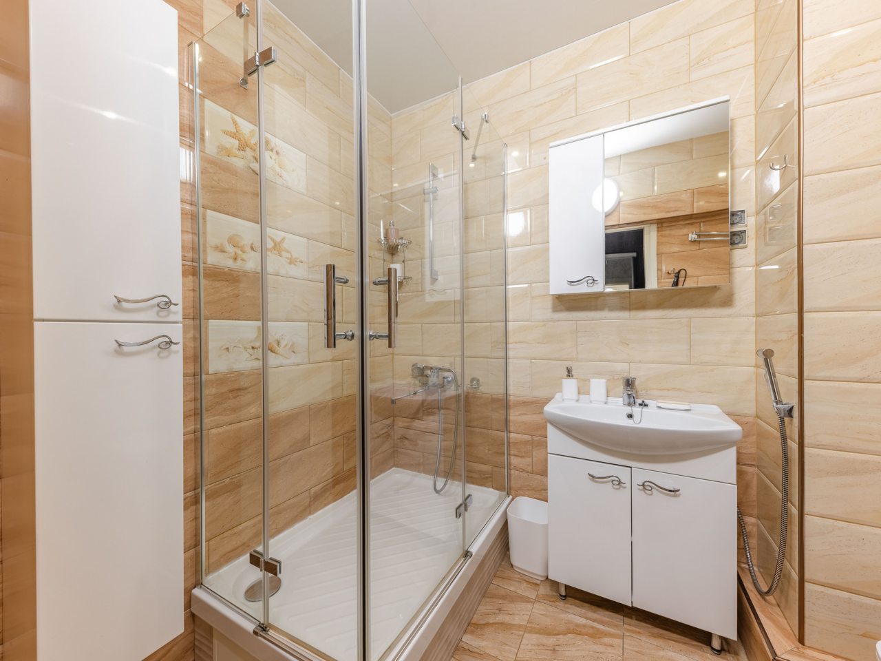 Квартира большая - 65 квадратных метров. Мы брали вариант с двуспальной кроватью. Очень понравилось такое расположение - мы разместились здесь просто отлично. В квартире есть большие панорамные окна, шторы хорошо затеняют пространство. В ванной комнате душевая кабина есть, а также биде. Гигиенические средства присутствуют. Есть большой шкаф-купе в коридоре.