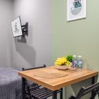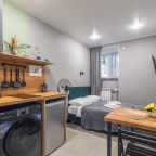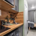 Компактная кухонная зона оснащена варочной панелью, холодильником, чайником, столовыми приборами, чтобы вы могли порадовать себя приготовлением любимых напитков и блюд.