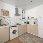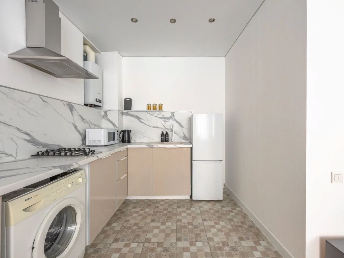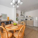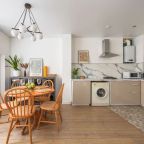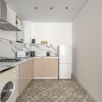На уютной кухне будет приятно готовить: плита с вытяжкой, чайник, СВЧ, красивая обеденная зона.