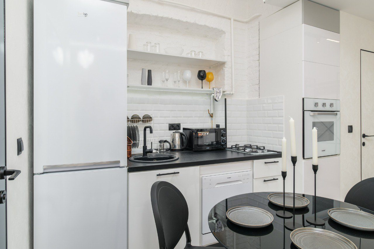 Светлая кухня имеет белоснежный гарнитур, бытовую технику, обеденный стол и комплект посуды. Пообедать можно в одном из множества кафе, которые расположены в шаговой доступности от апартаментов.