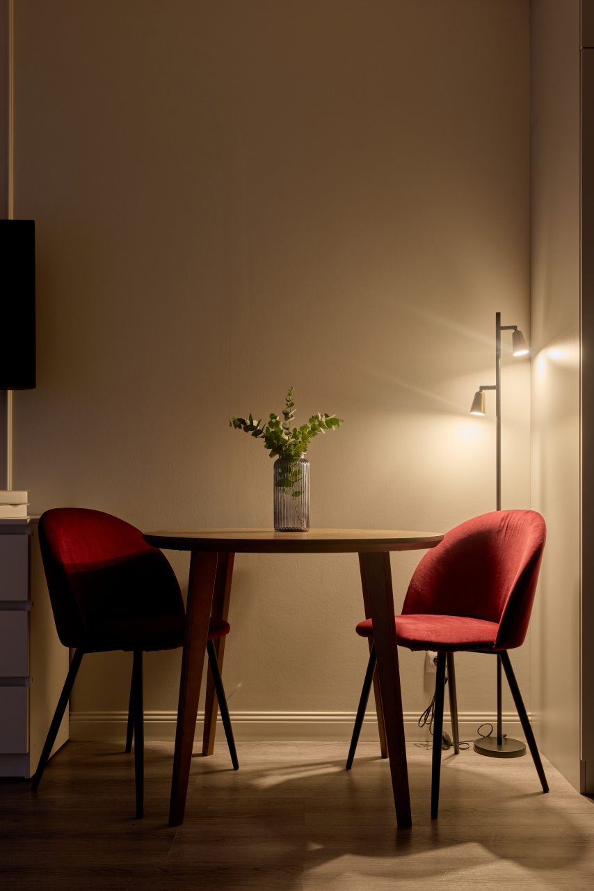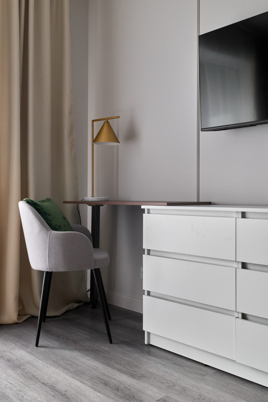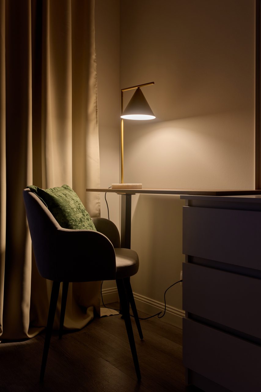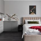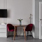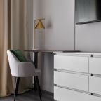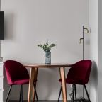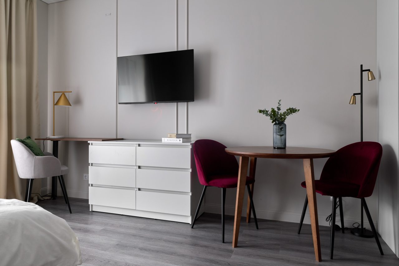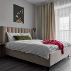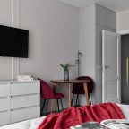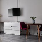 Апартаменты с современным ремонтом оснащены удобной двуспальной кроватью, розетками возле спального места, письменным столом, комодом, ЖК-телевизором, wi-fi, балконом с видом на внутренний двор и др. Санузел оборудован комплектом качественной сантехники и стиральной машиной.