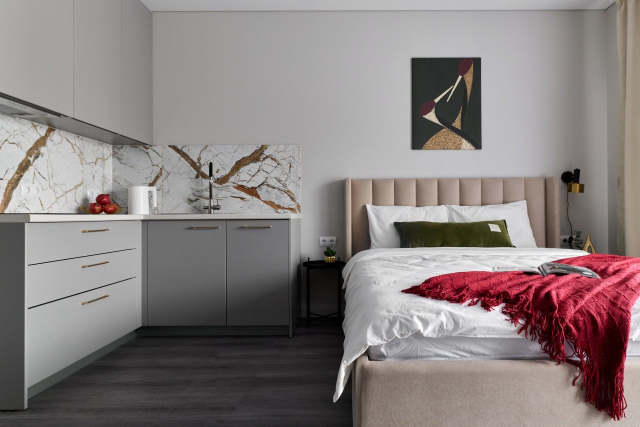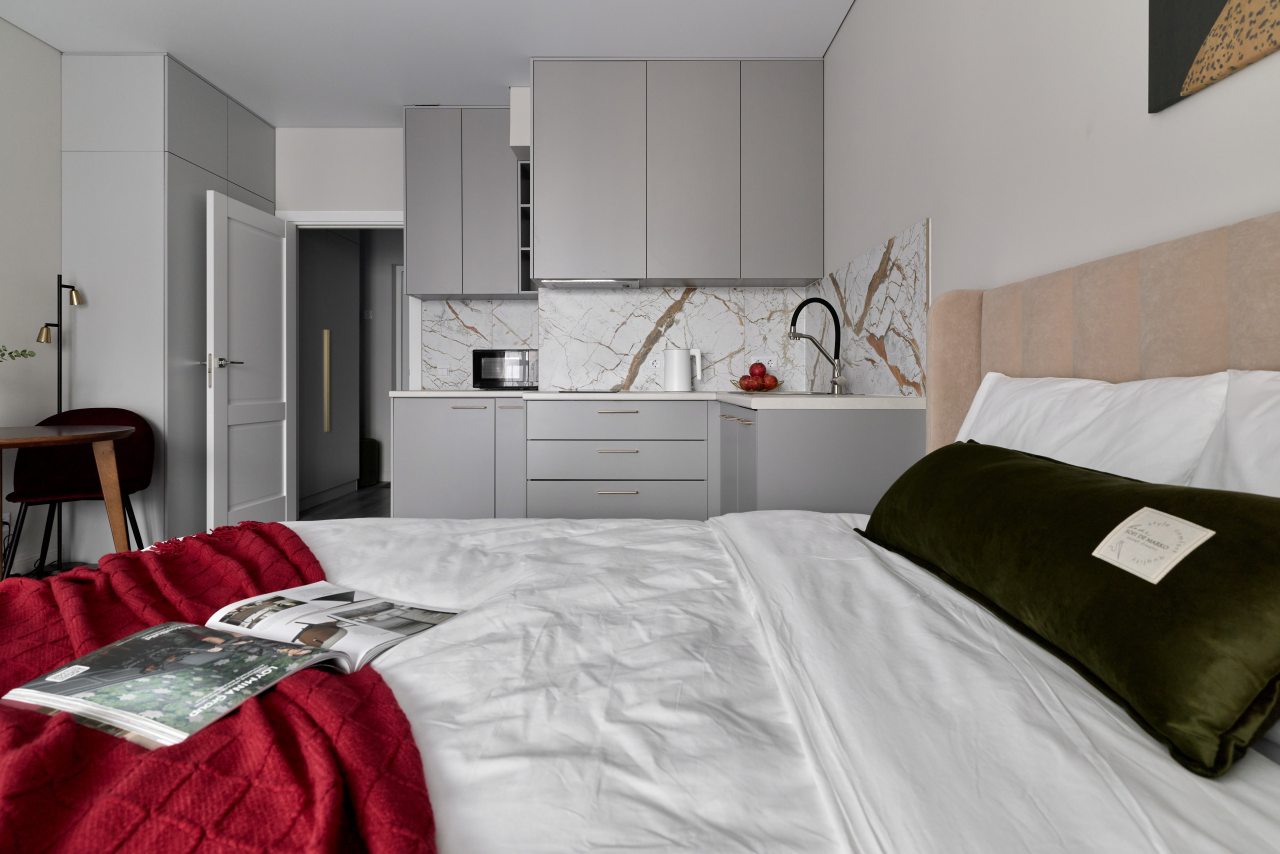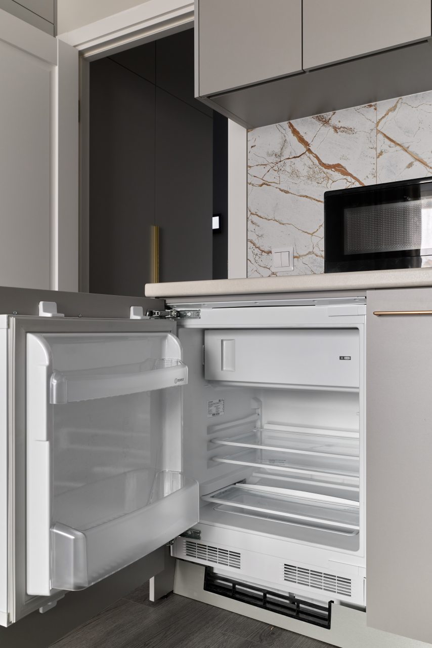 Кухонная зона укомплектована стильным гарнитуром, посудомоечной машиной, холодильником, микроволновой печью, варочной панелью, чайником. В шаговой доступности находится ресторан, пекарня и продуктовый магазин.