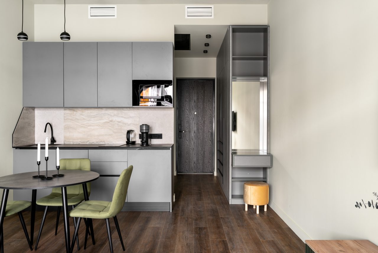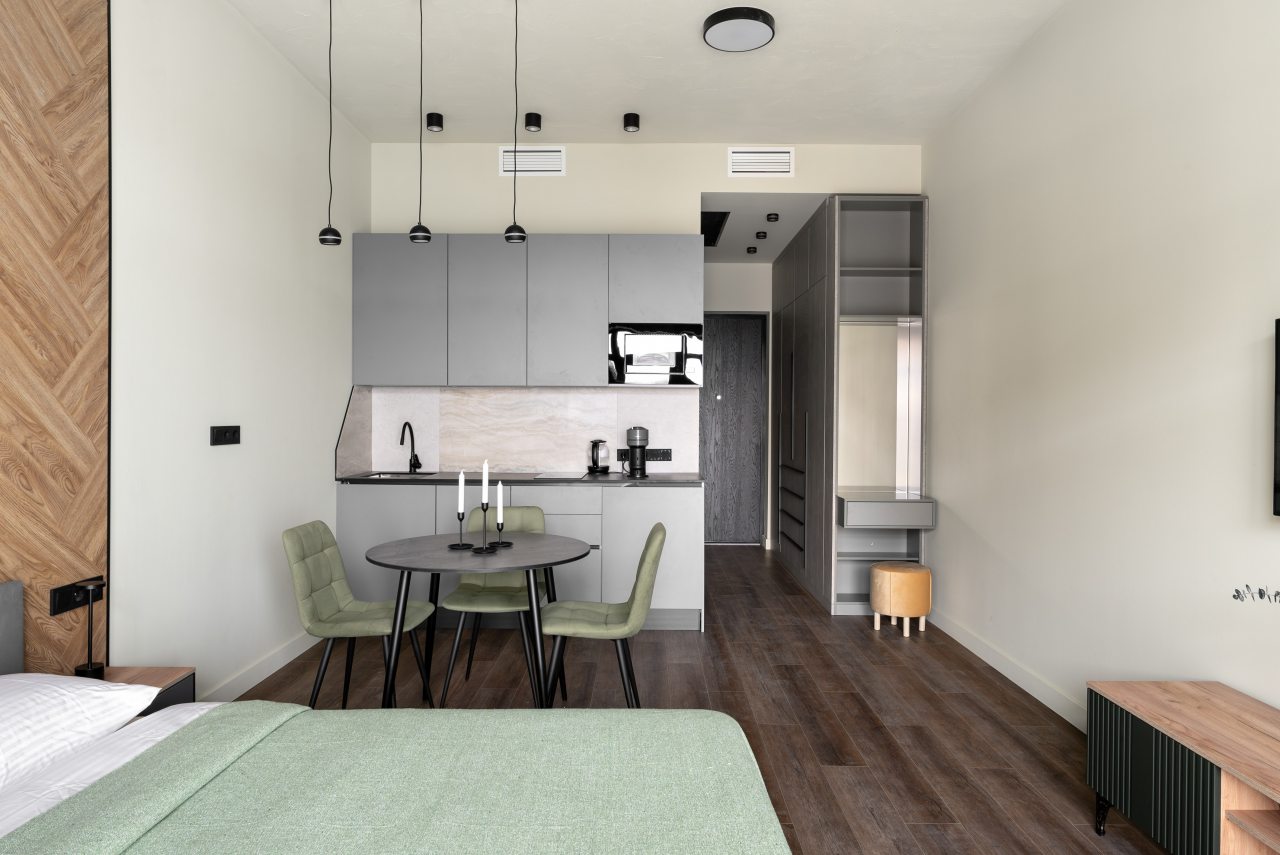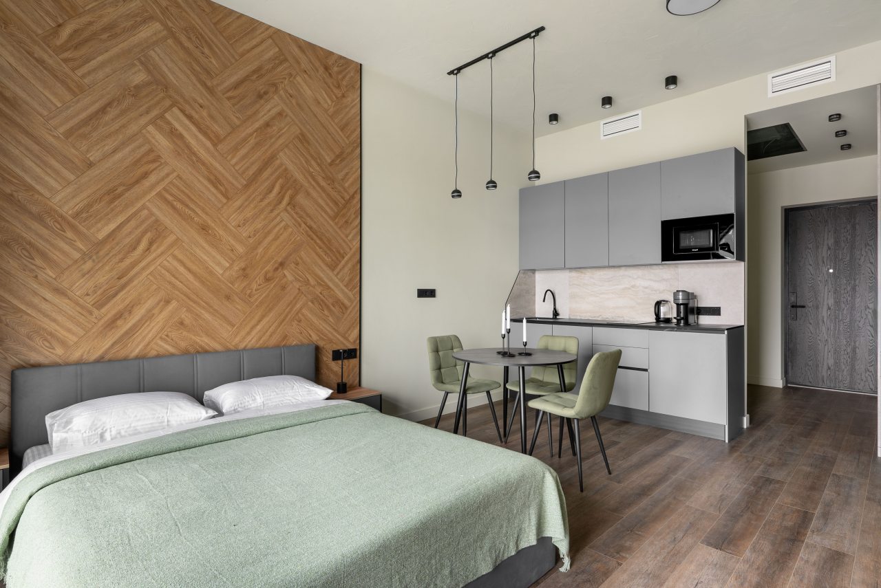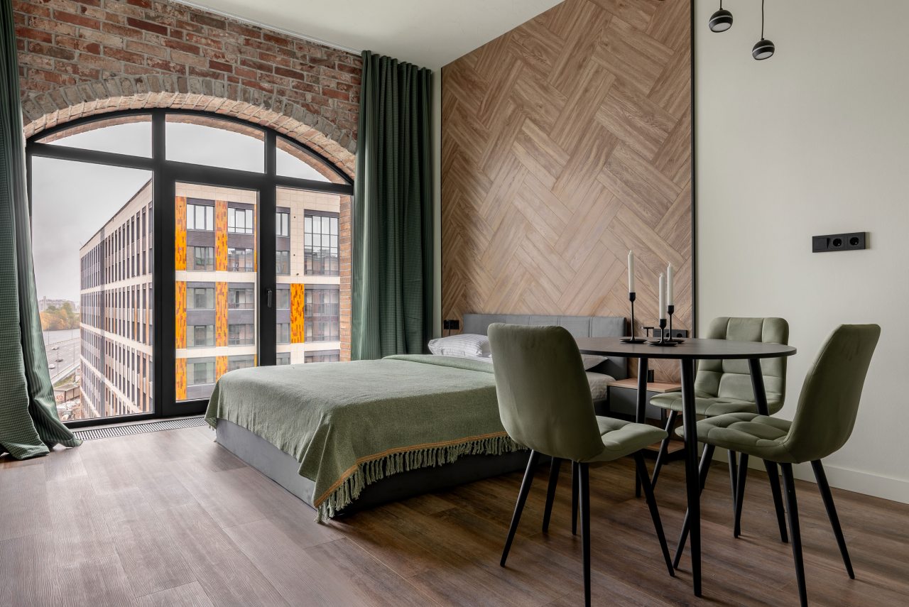 Современные апартаменты. Удобное месторасположение, близко к центру, в нескольких минутах езды на метро (две станции). На первом уровне находится приличный ресторан. По соседству магазины Лента и Теремок. Под окнами есть бесплатная парковочная зона. От метро довольно далеко, но при наличии арендуемого самоката это приемлемо. Недостаточный уровень взаимодействия с управляющими апартаментами.