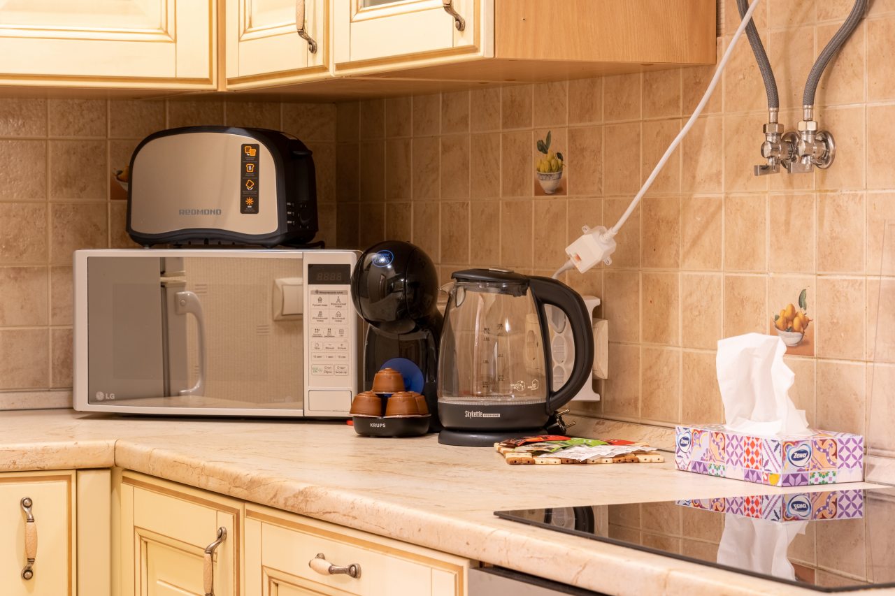 На кухне имеется необходимая бытовая техника для приготовления и разогревания еды. Продуктовые магазины и заведения общественного питания в пешей доступности.