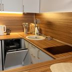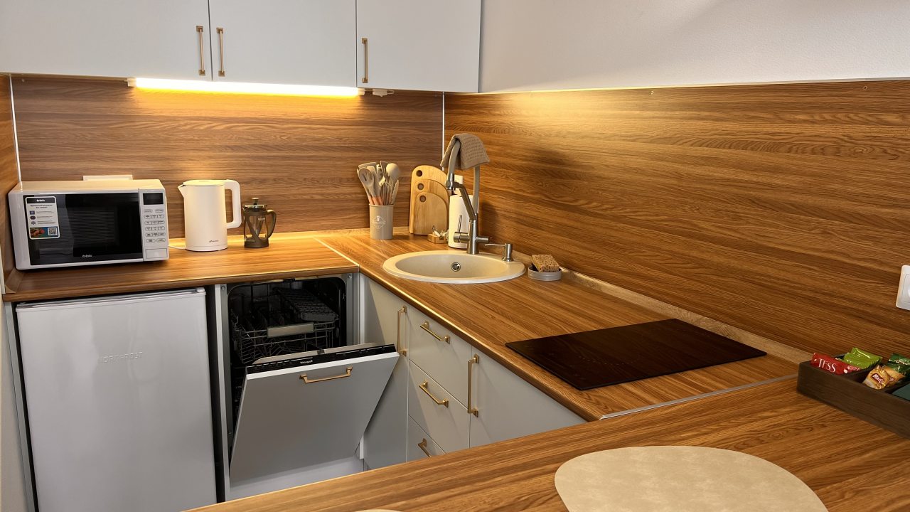 Кухня оснащена варочной панелью, различной кухонной утварью, чайником, посудомоечной машиной, холодильником, микроволновой печью.