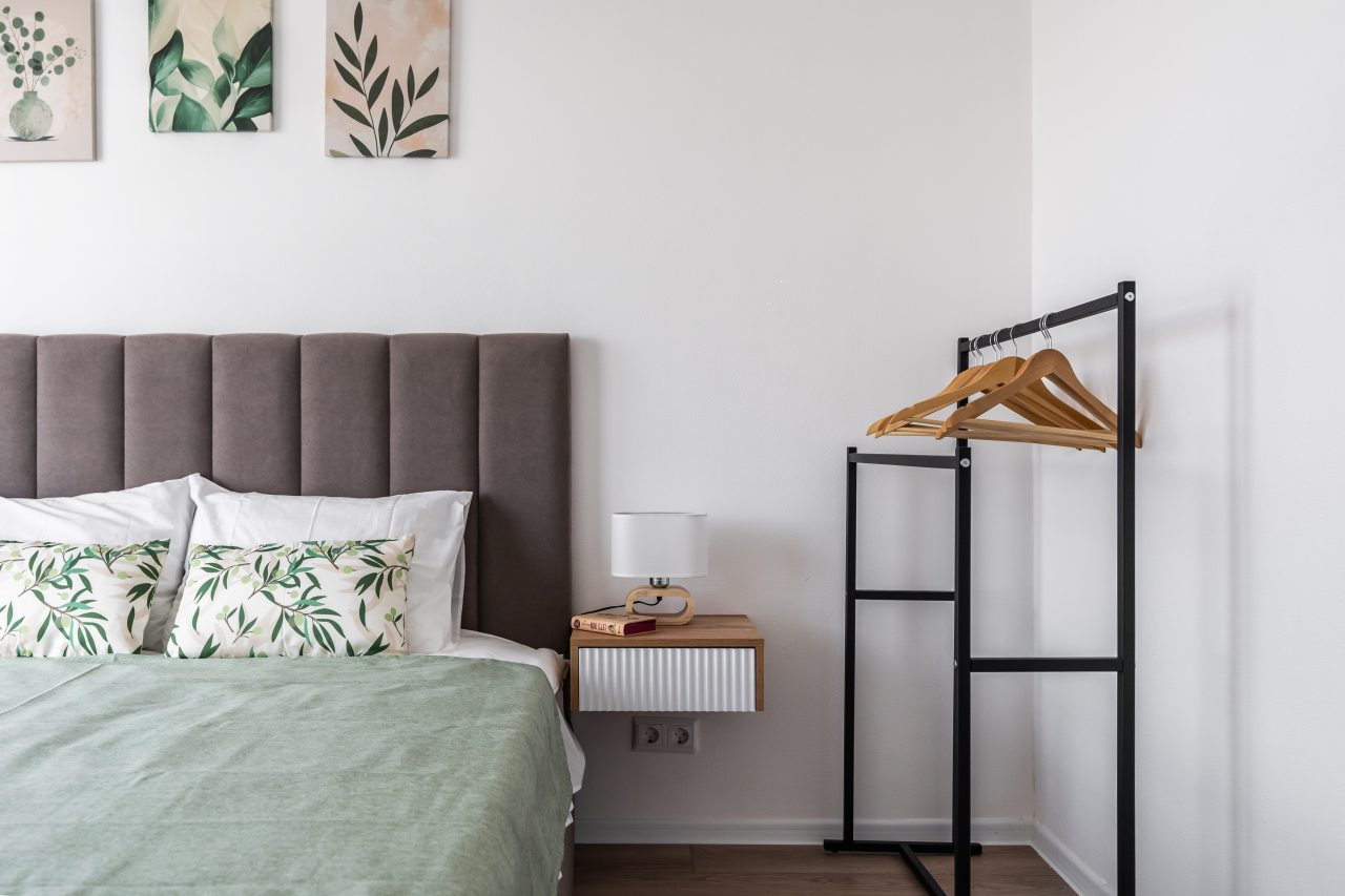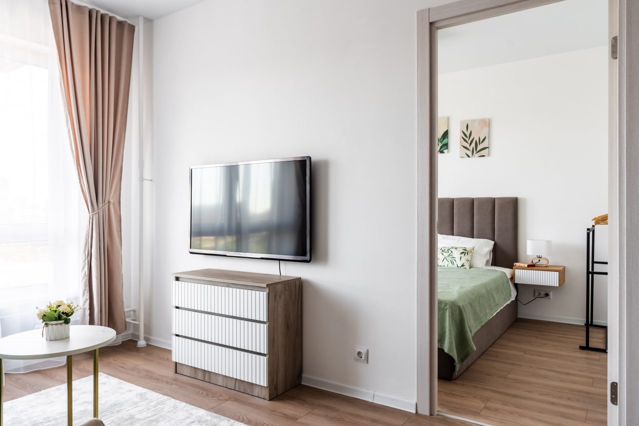 Внутри есть всё для комфортного отдыха и проживания, включая удобную двуспальную кровать, прикроватные лампы, тумбы и розетки, а также мягкий диван, телевизор, комод, полноценную ванну со стиральной машиной, набором туалетно-гигиенических средств и полотенец.