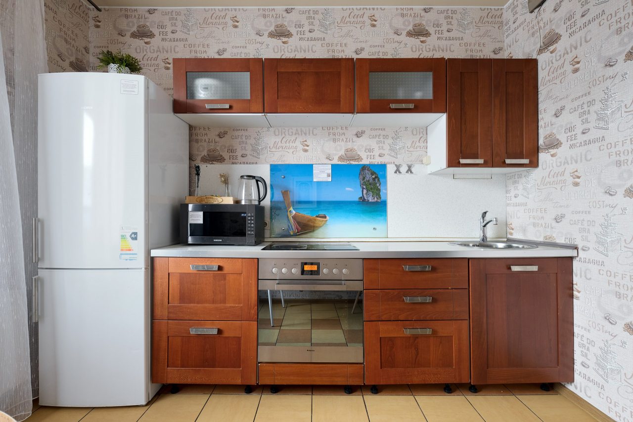 На кухне оборудована обеденная зона с круглым столом и кухонным гарнитуром, который укомплектован техникой для приготовления любимых блюд. В шаговой доступности кофейня и пиццерия.