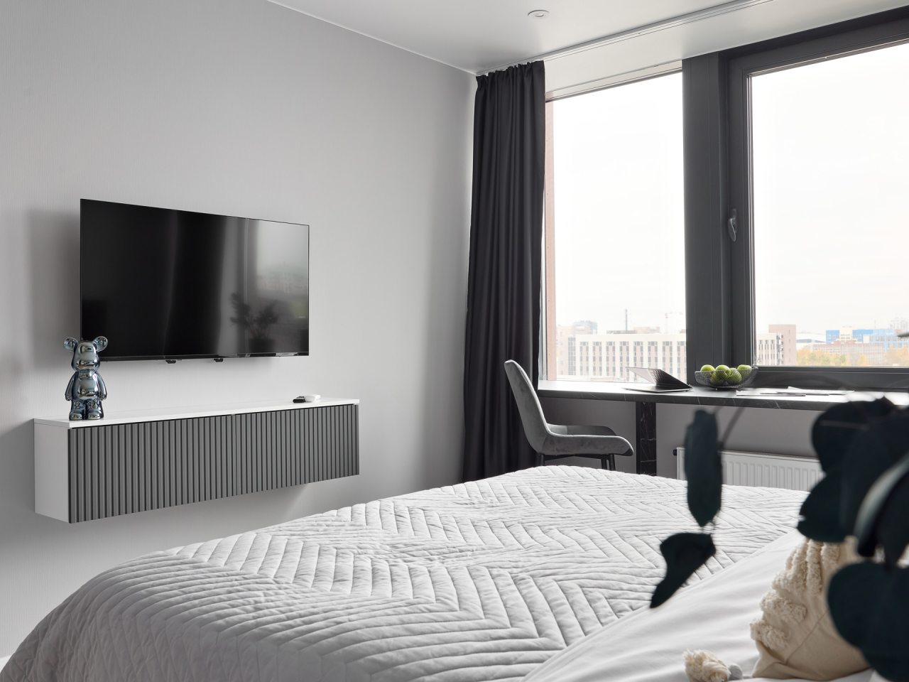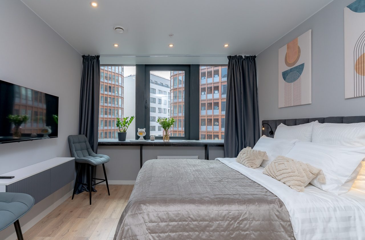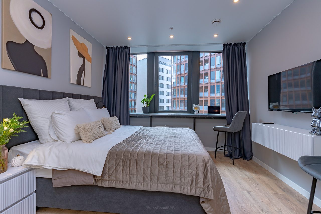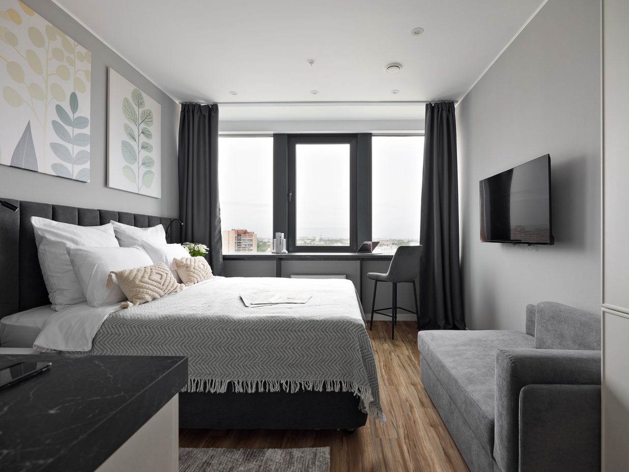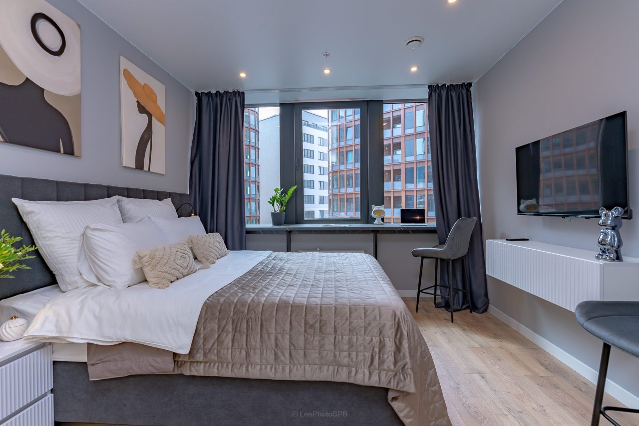 Внутри вас ожидает стильный дизайн, удобная двуспальная кровать с мягким изголовьем, затемнённые шторы, широкий подоконник, который может выступать рабочей и обеденной зоной, зеркало, сплит-система, ЖК-телевизор, а также санузел с необходимыми туалетно-косметическими средствами и стиральной машиной.