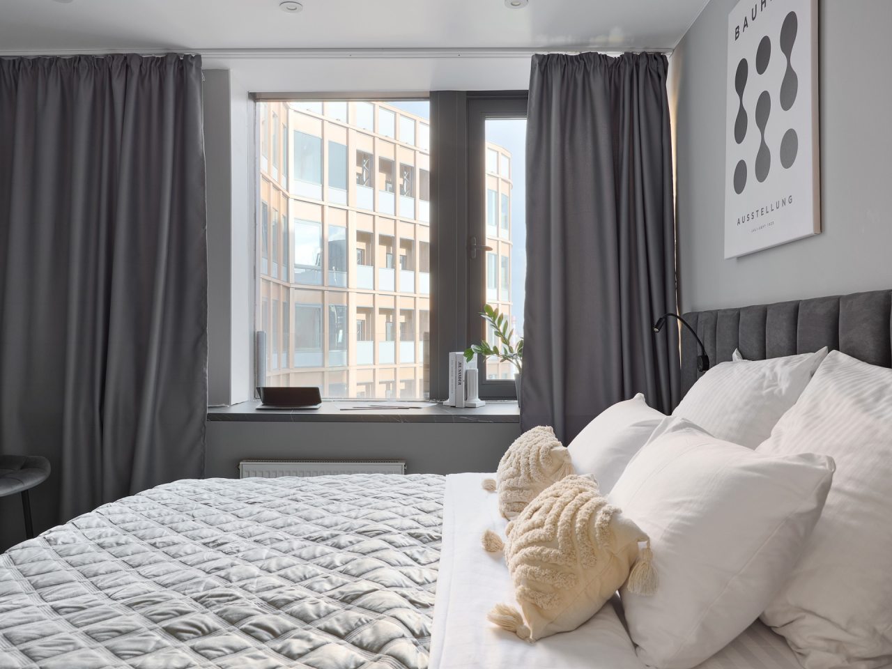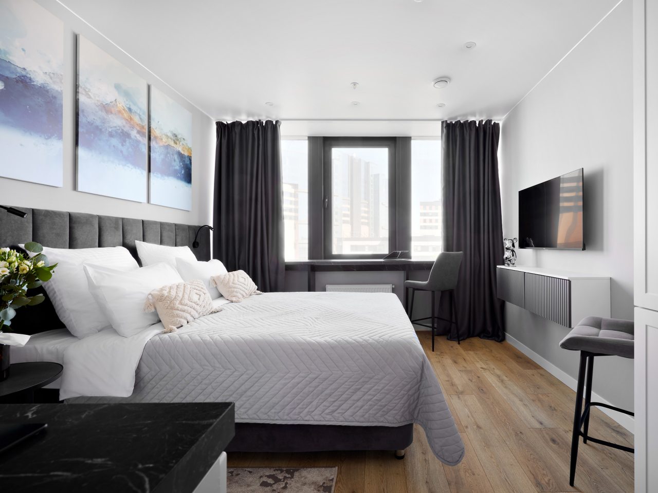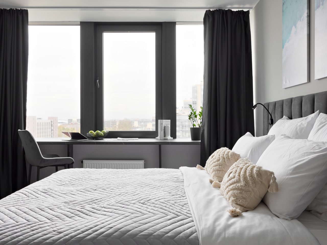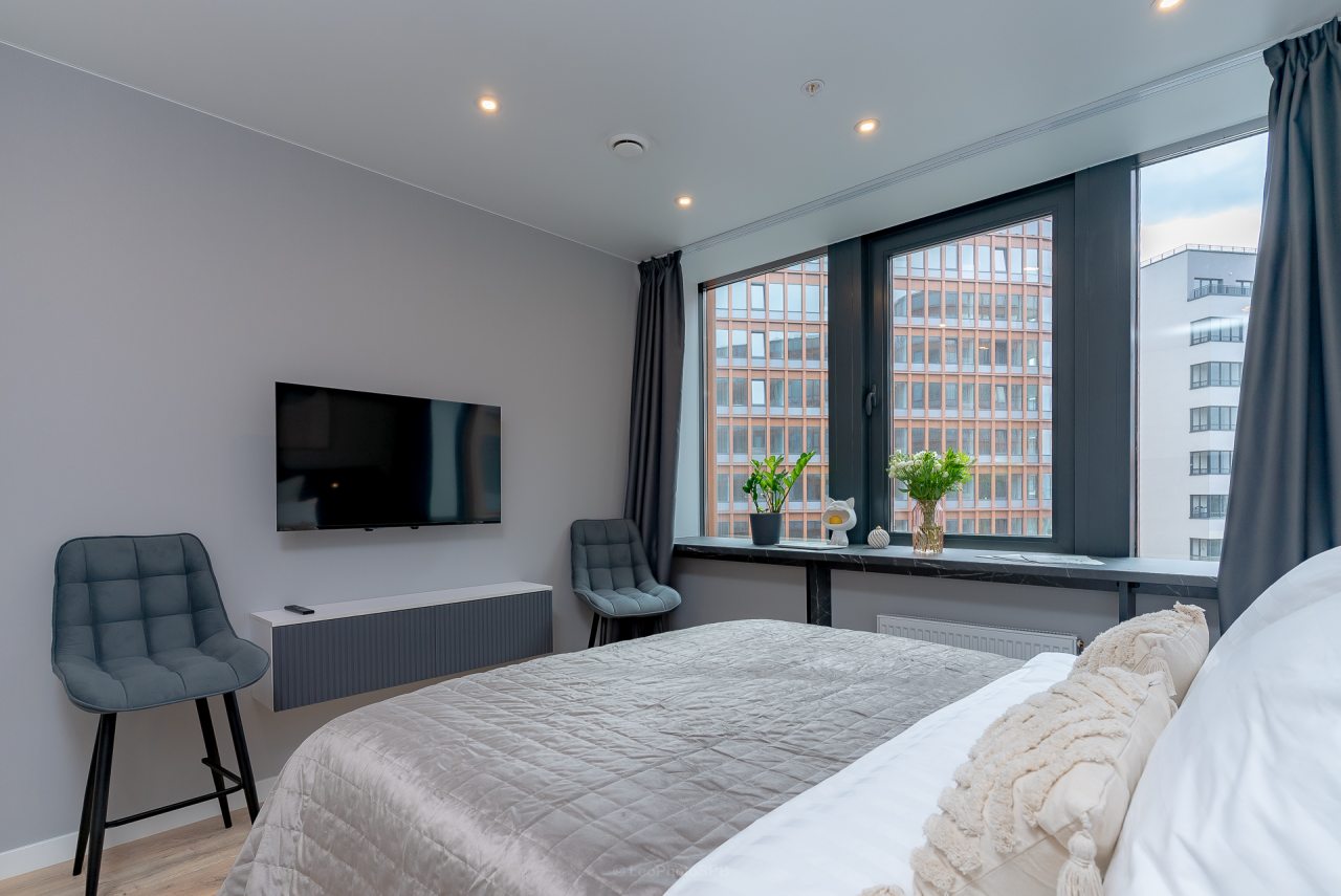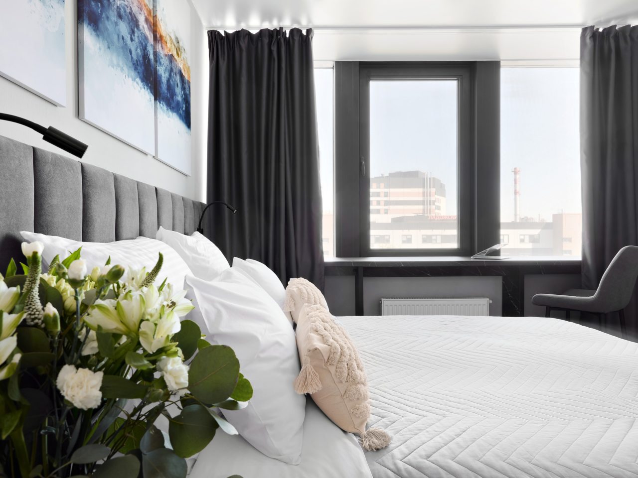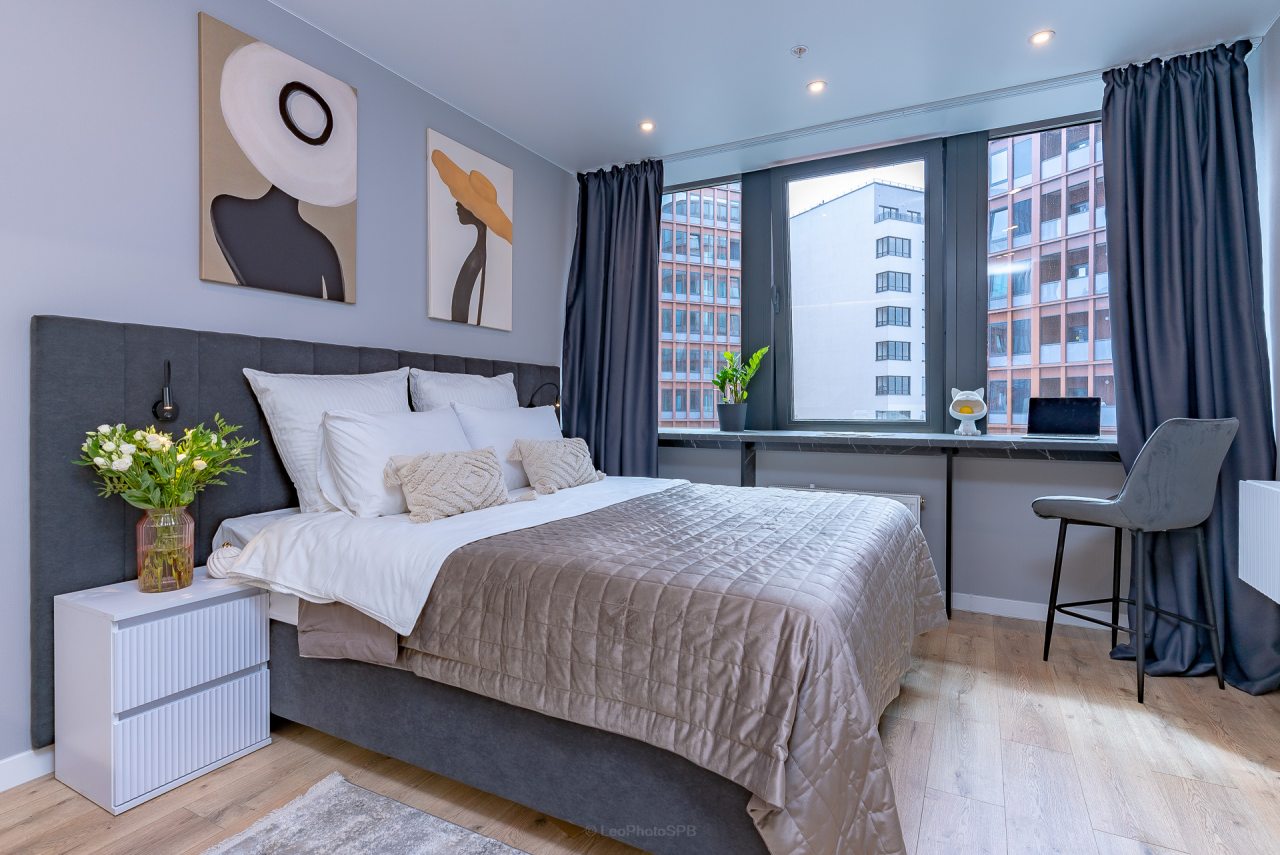 Внутри вас ожидает стильный дизайн, удобная двуспальная кровать с мягким изголовьем, затемнённые шторы, широкий подоконник, который может выступать рабочей и обеденной зоной, зеркало, сплит-система, ЖК-телевизор, а также санузел с необходимыми туалетно-косметическими средствами и стиральной машиной.
