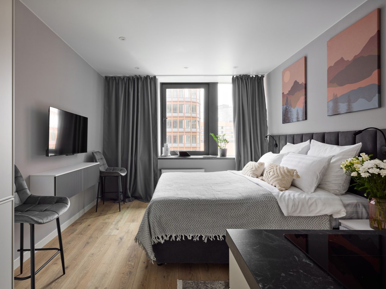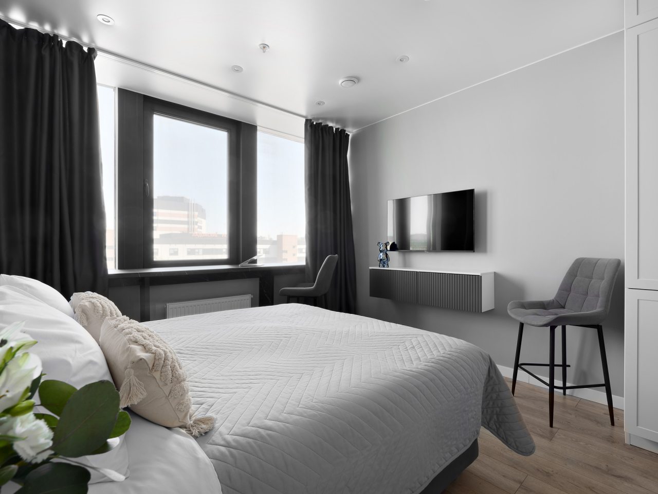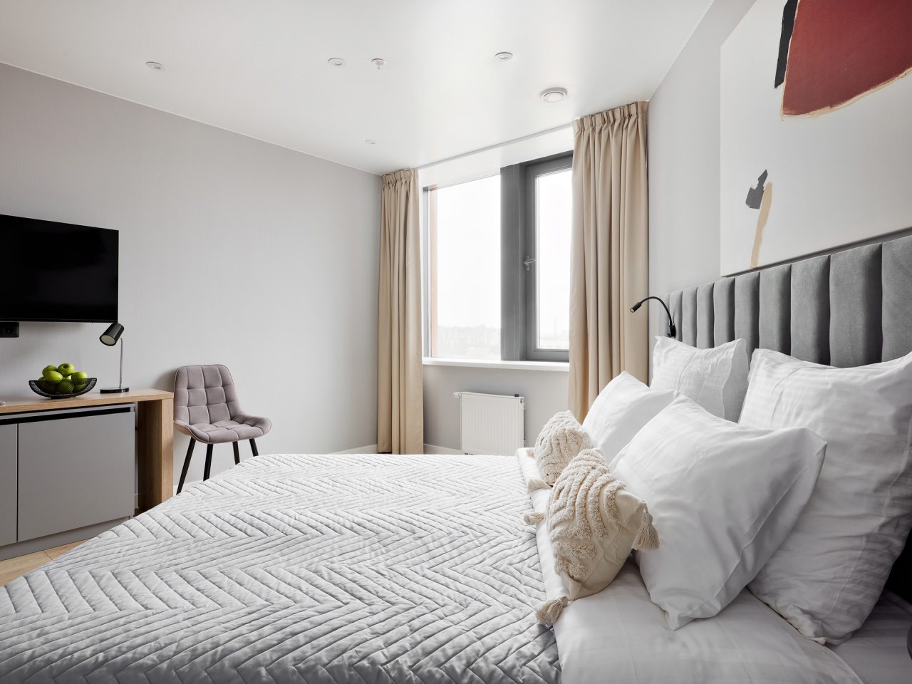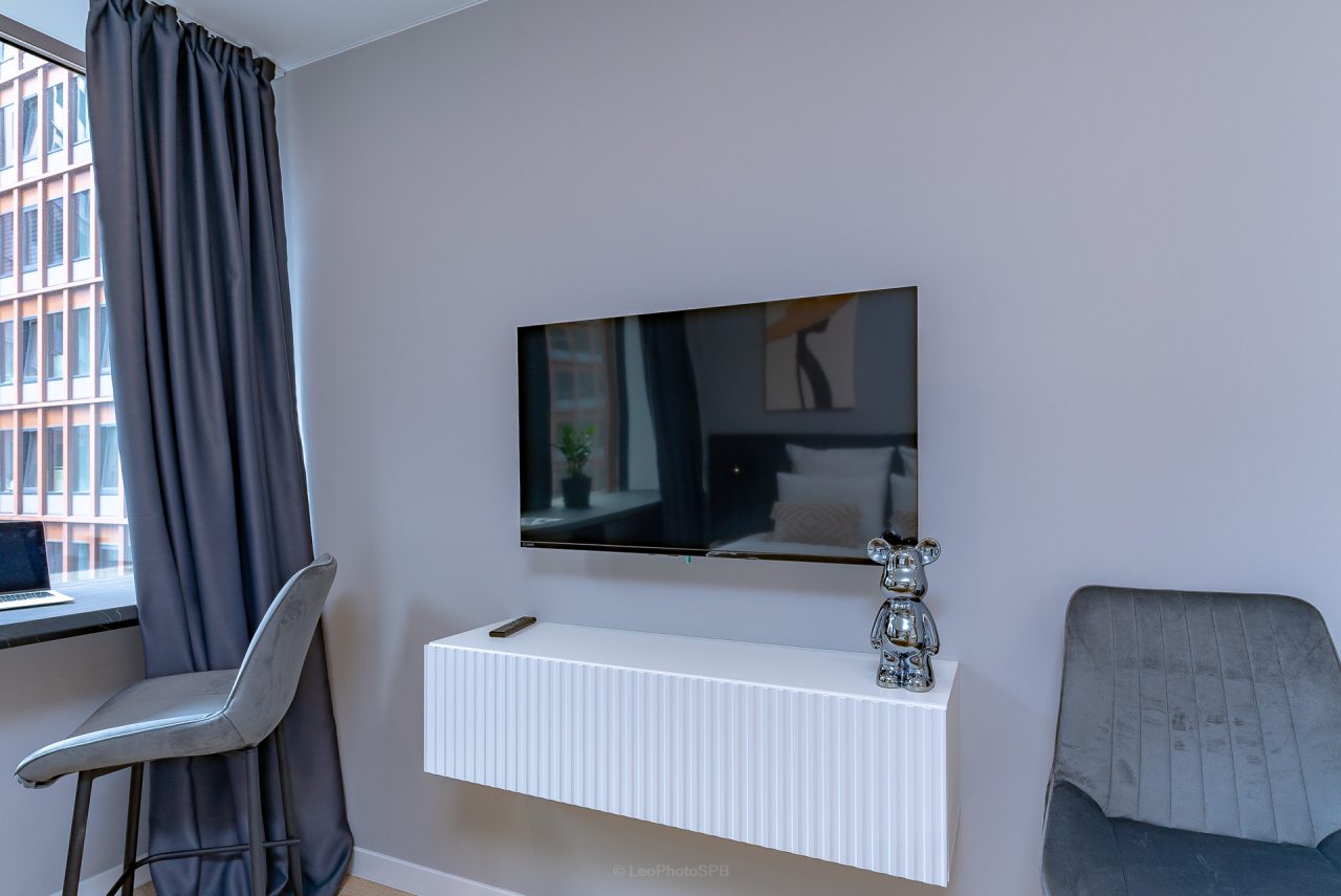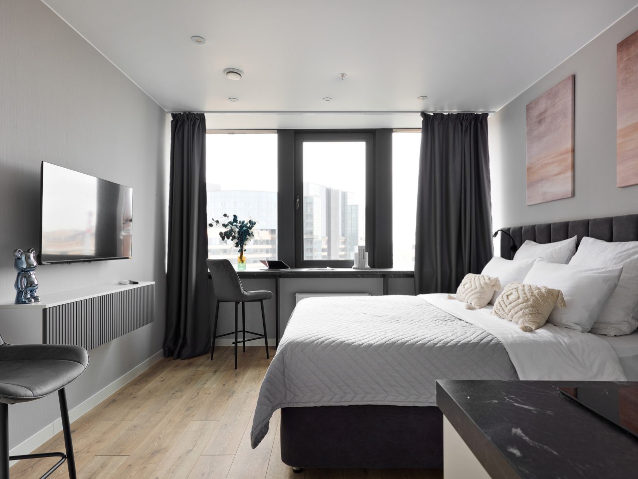 Внутри вас ожидает стильный дизайн, удобная двуспальная кровать с мягким изголовьем, затемнённые шторы, широкий подоконник, который может выступать рабочей и обеденной зоной, зеркало, сплит-система, ЖК-телевизор, а также санузел с необходимыми туалетно-косметическими средствами и стиральной машиной.