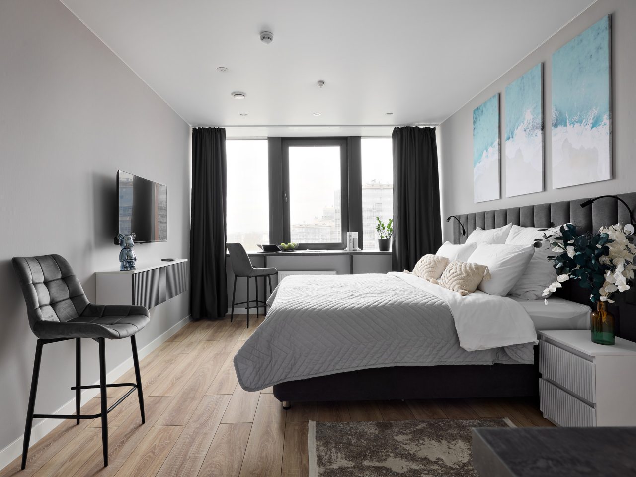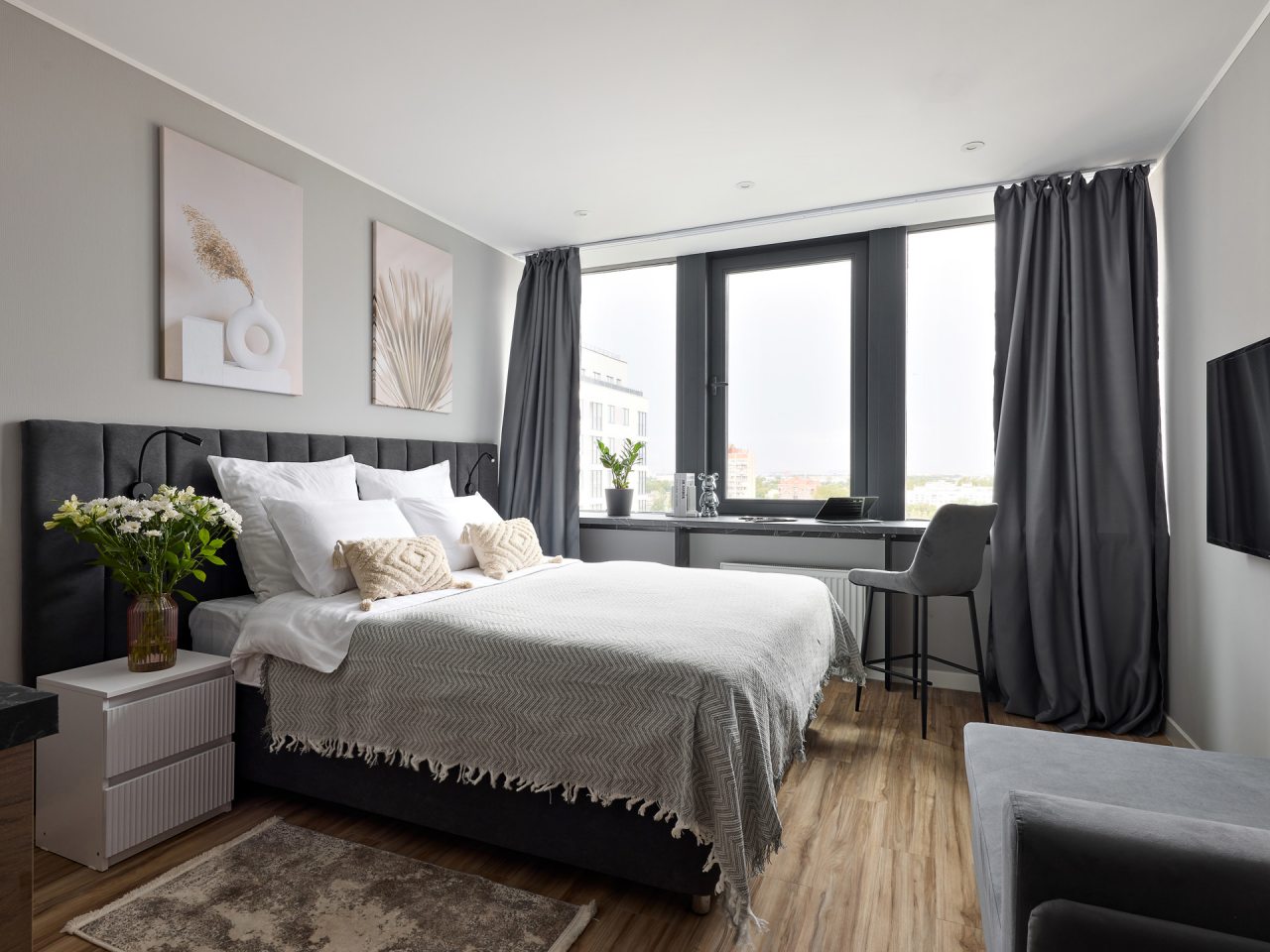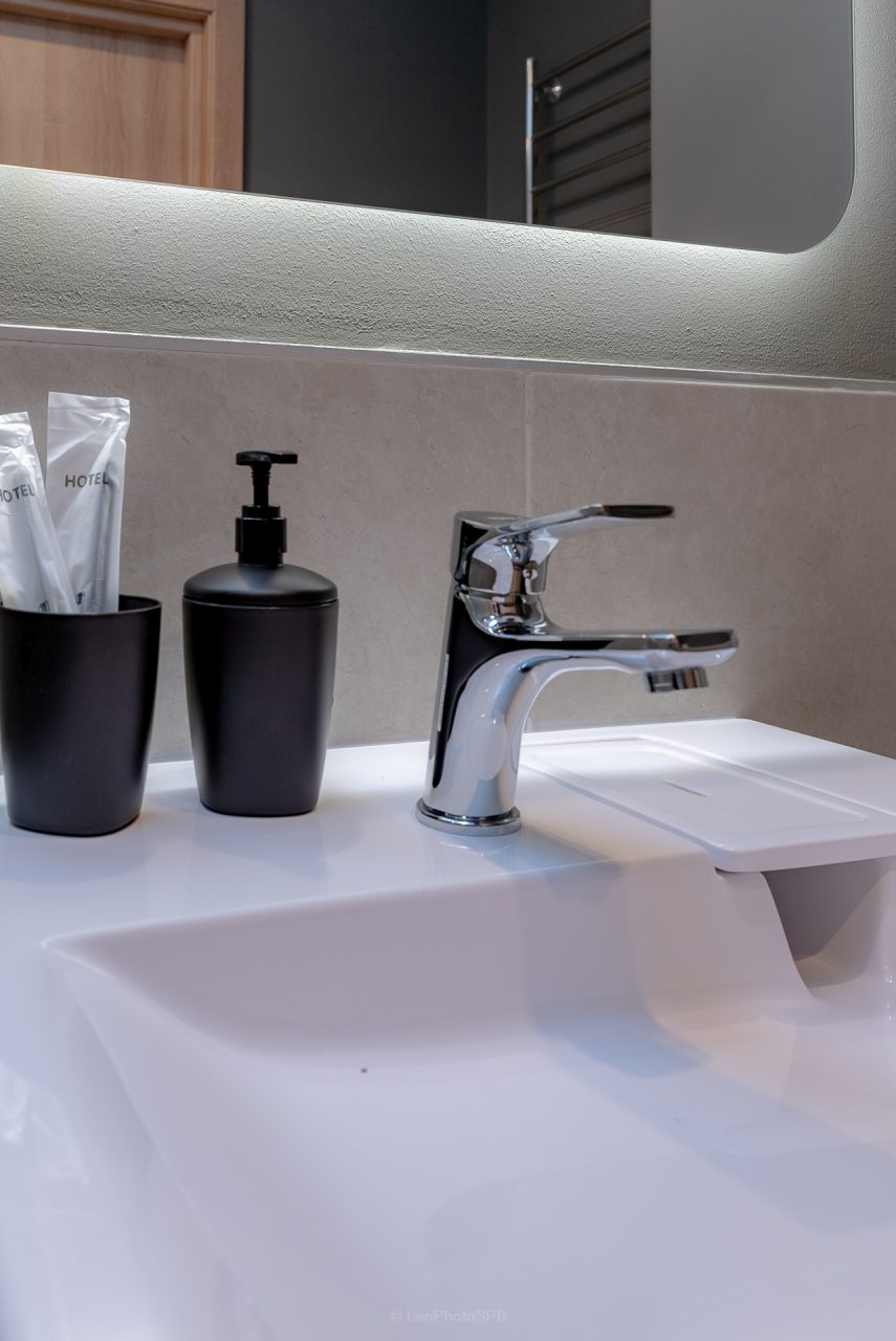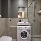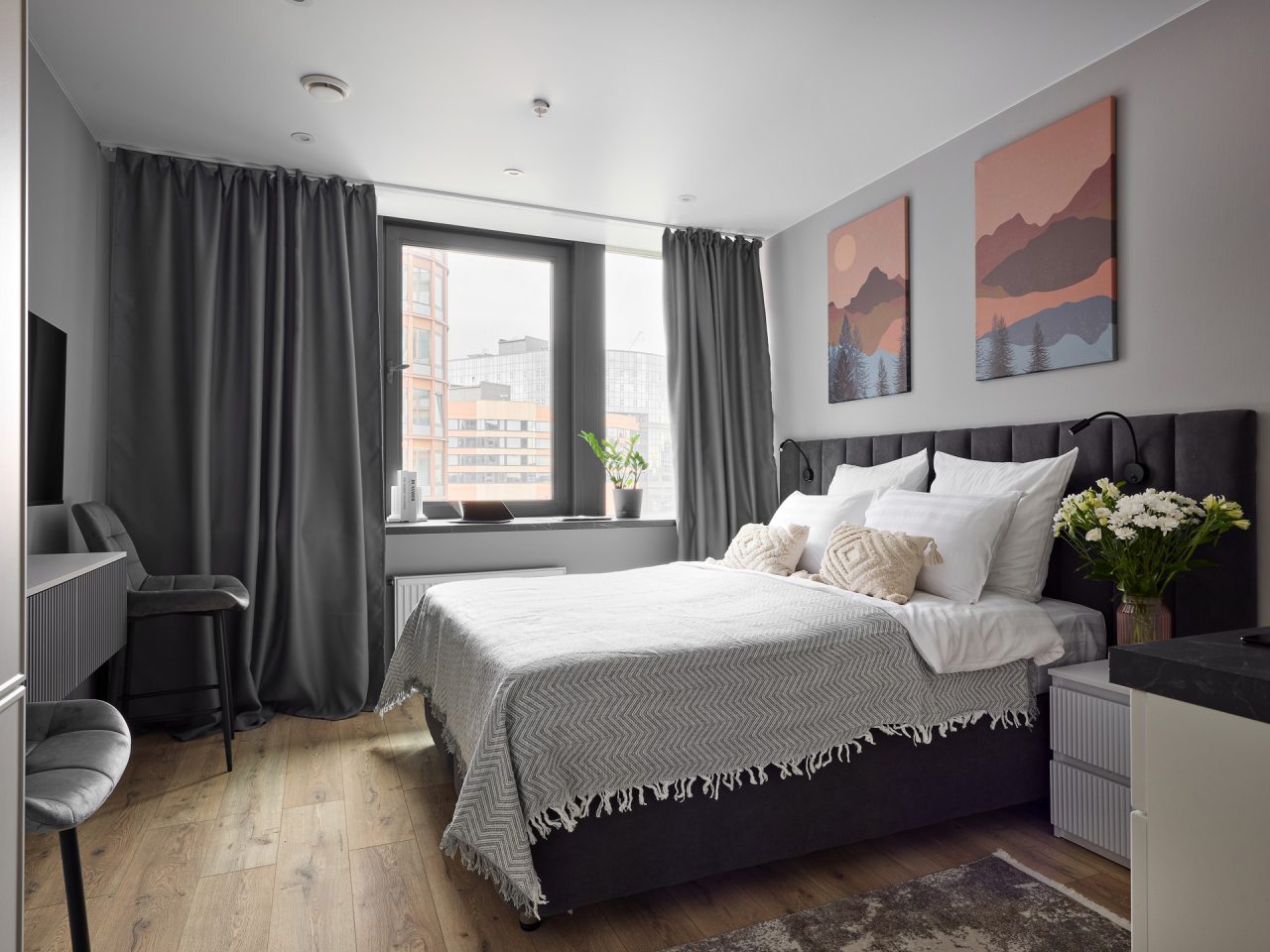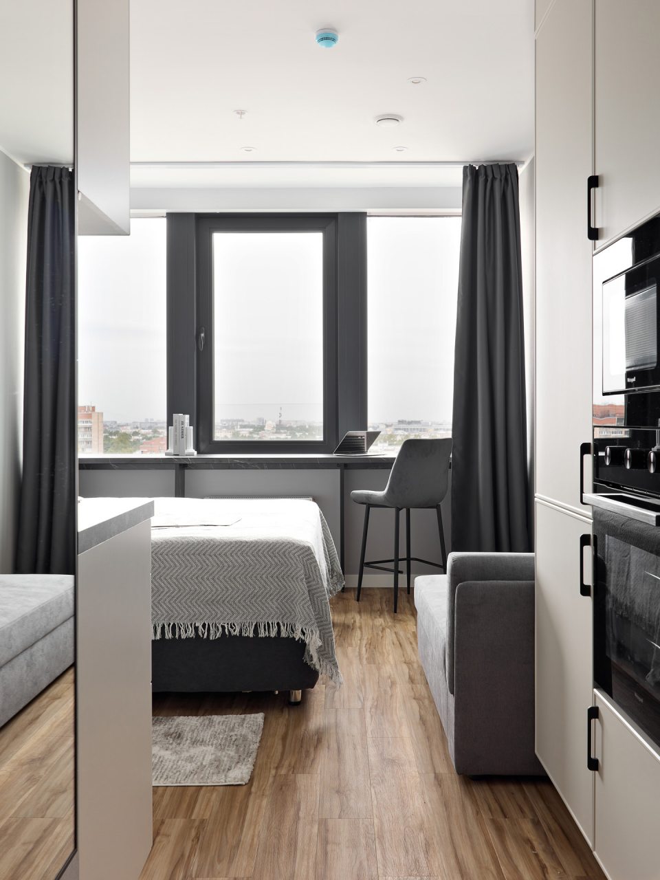 Внутри вас ожидает стильный дизайн, удобная двуспальная кровать с мягким изголовьем, затемнённые шторы, широкий подоконник, который может выступать рабочей и обеденной зоной, зеркало, сплит-система, ЖК-телевизор, а также санузел с необходимыми туалетно-косметическими средствами и стиральной машиной.