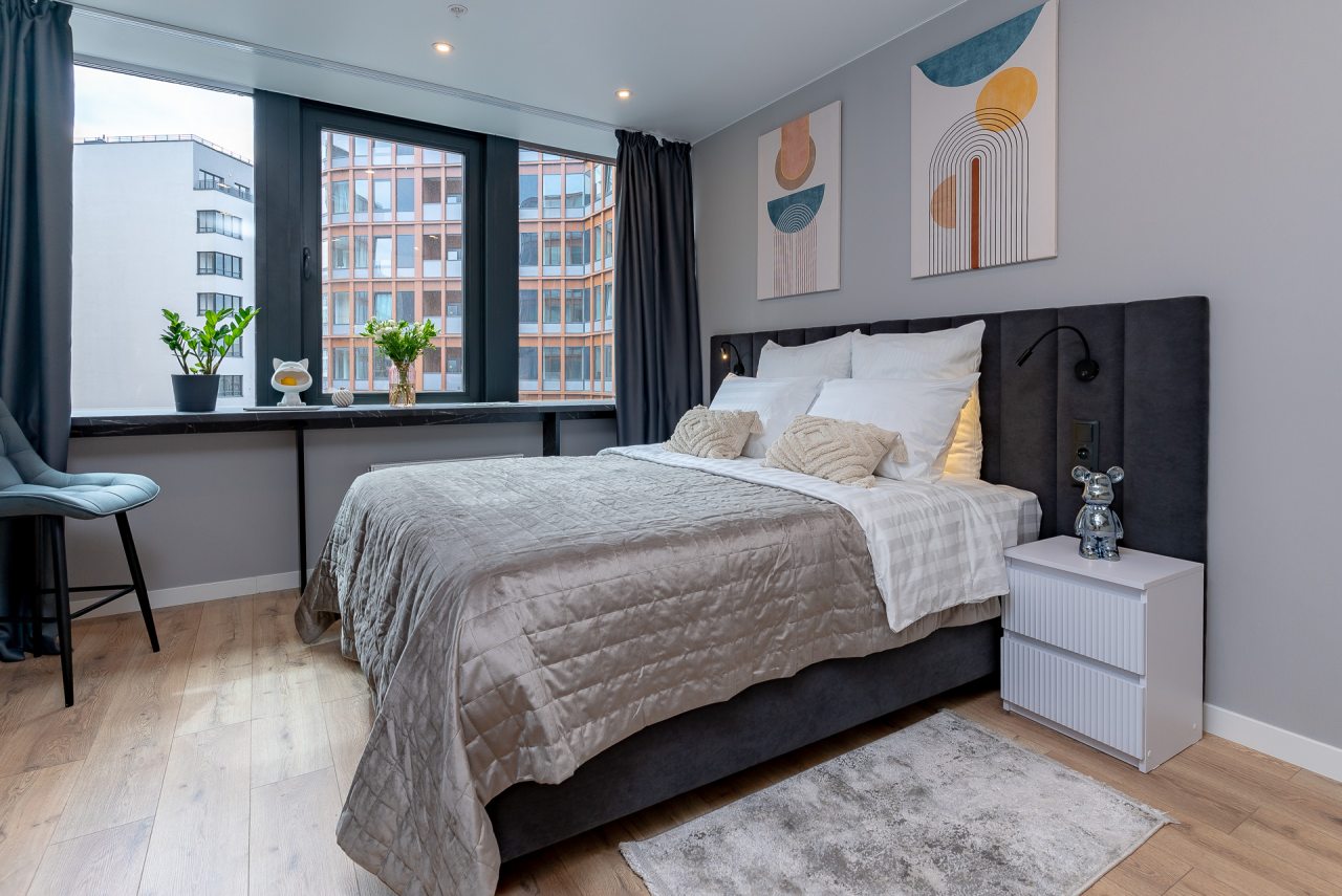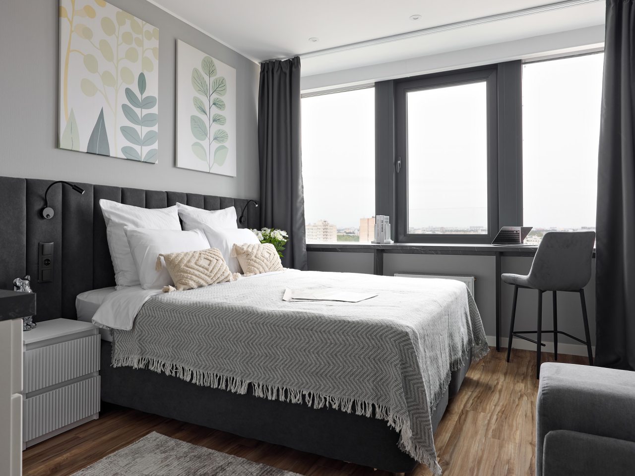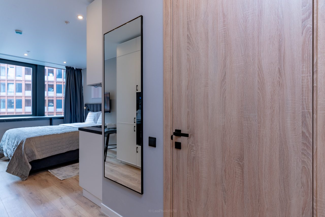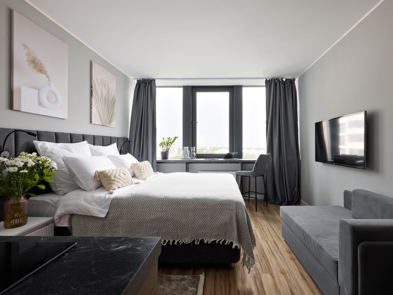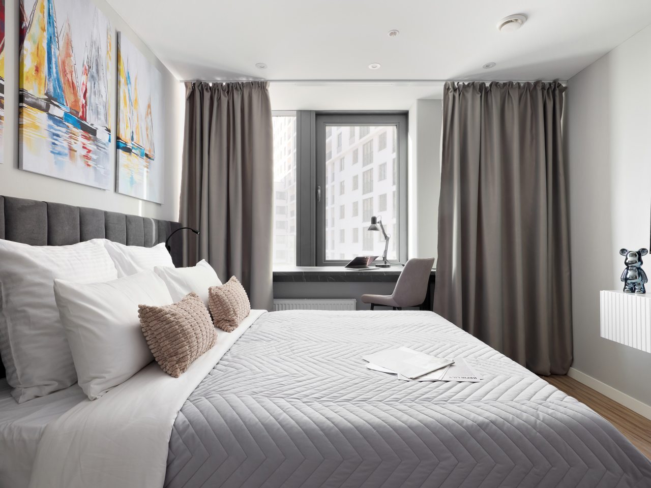 Внутри вас ожидает стильный дизайн, удобная двуспальная кровать с мягким изголовьем, затемнённые шторы, широкий подоконник, который может выступать рабочей и обеденной зоной, зеркало, сплит-система, ЖК-телевизор, а также санузел с необходимыми туалетно-косметическими средствами и стиральной машиной.