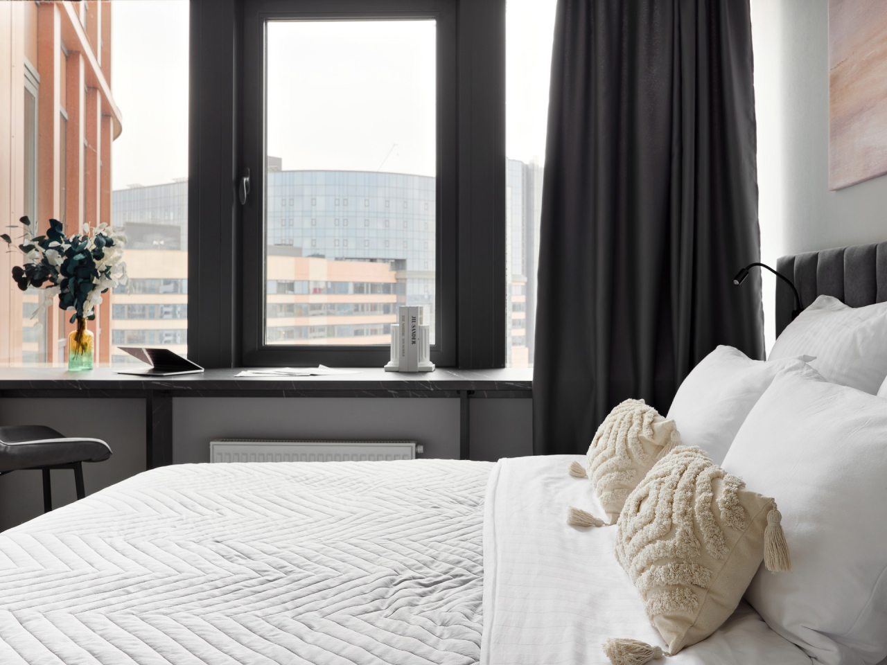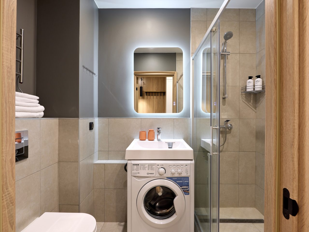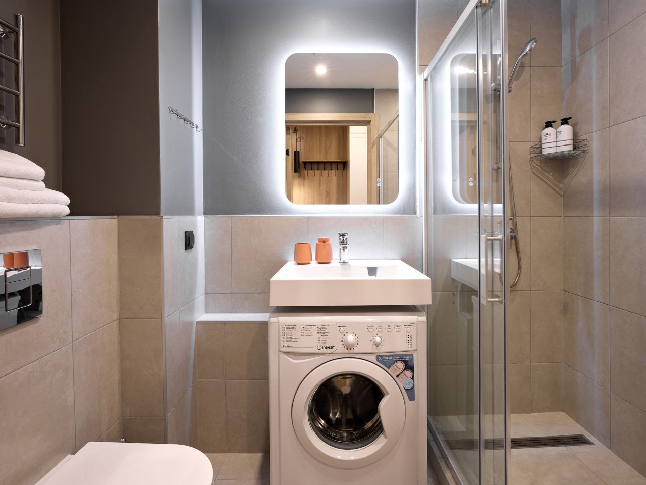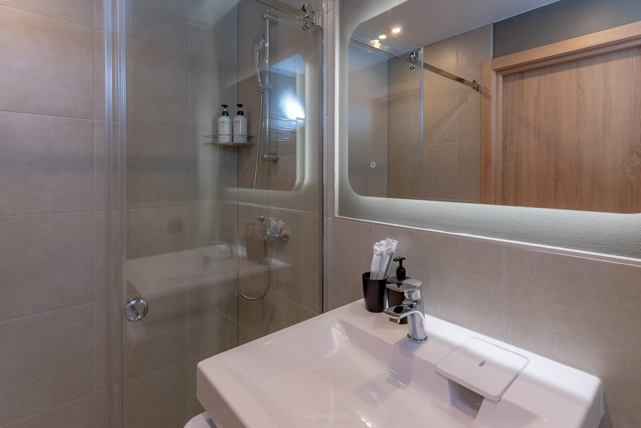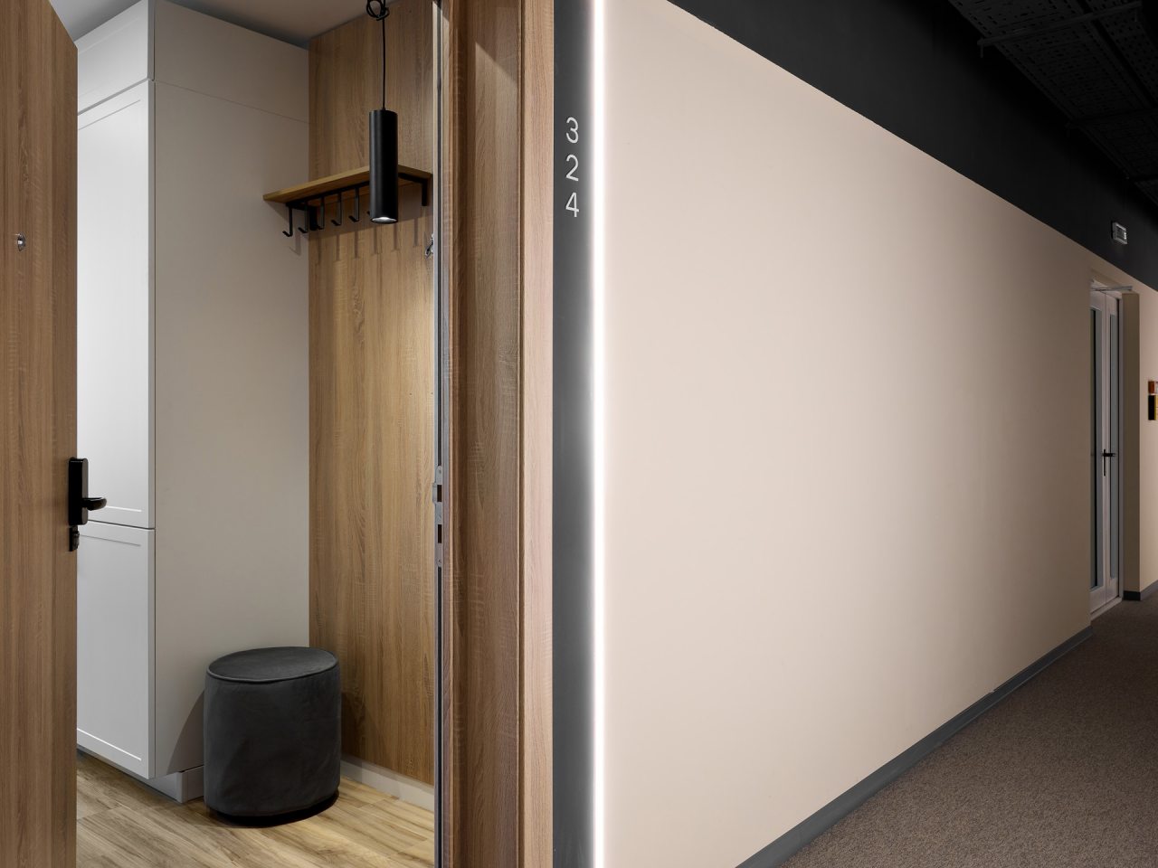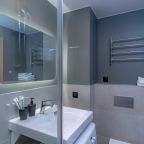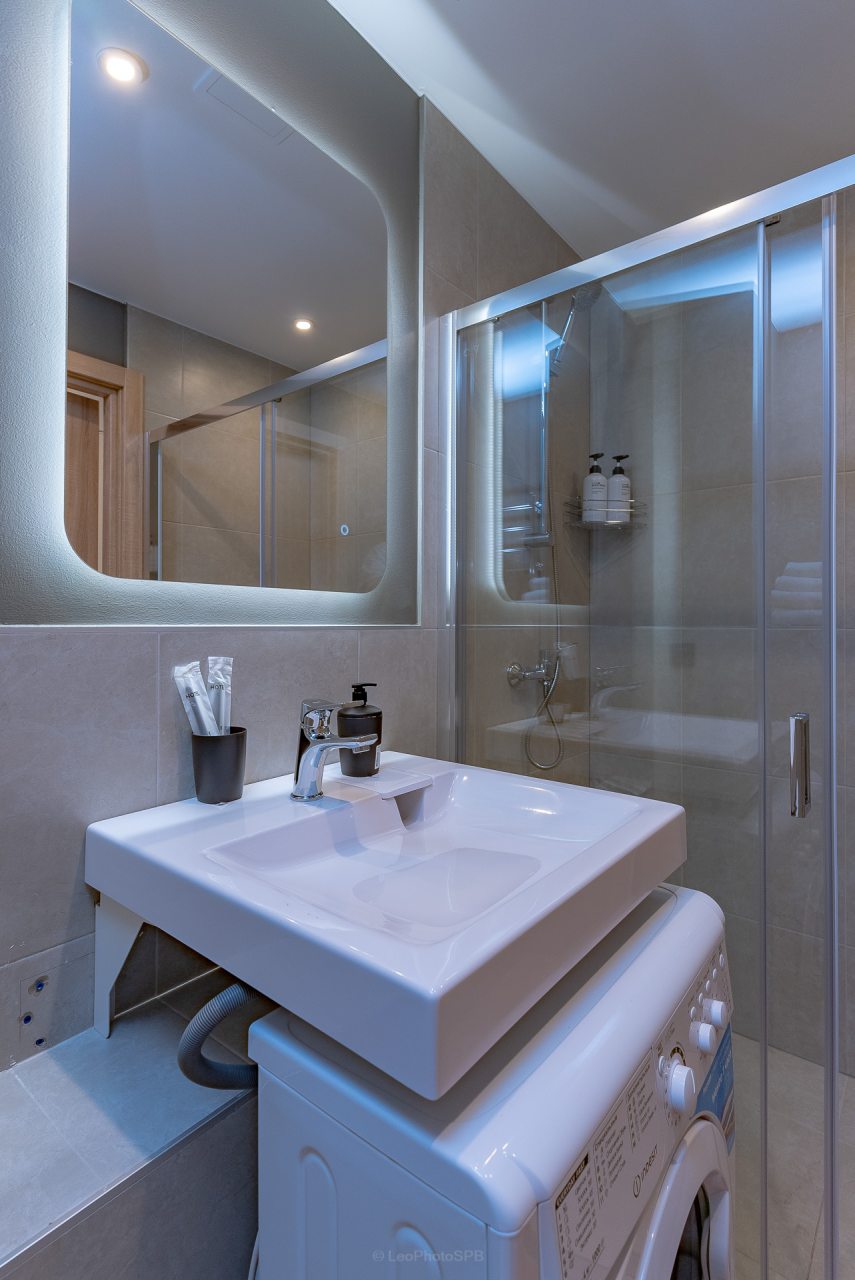 Внутри вас ожидает стильный дизайн, удобная двуспальная кровать с мягким изголовьем, затемнённые шторы, широкий подоконник, который может выступать рабочей и обеденной зоной, зеркало, сплит-система, ЖК-телевизор, а также санузел с необходимыми туалетно-косметическими средствами и стиральной машиной.